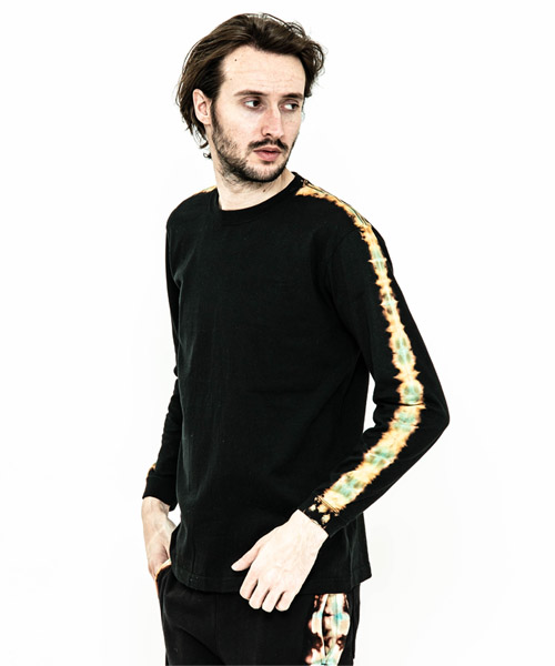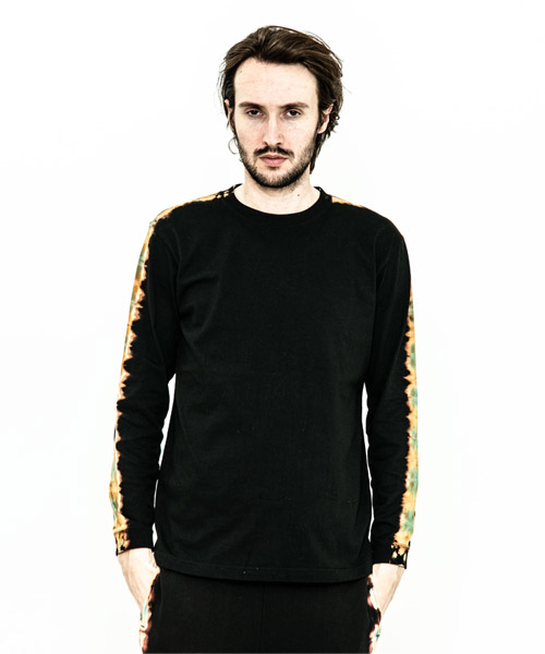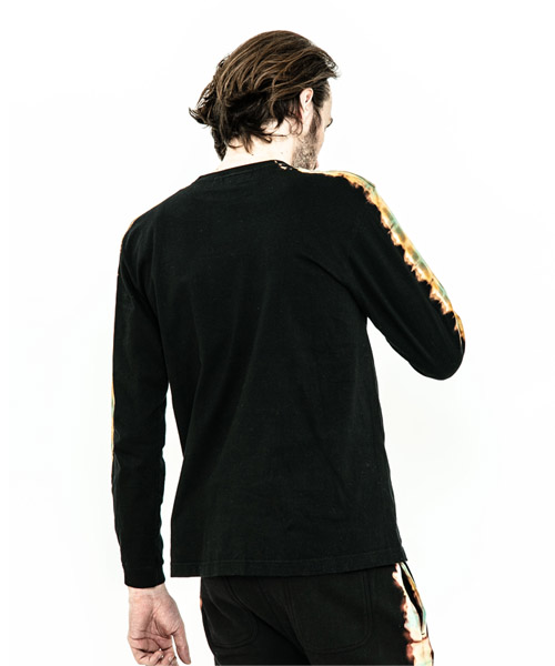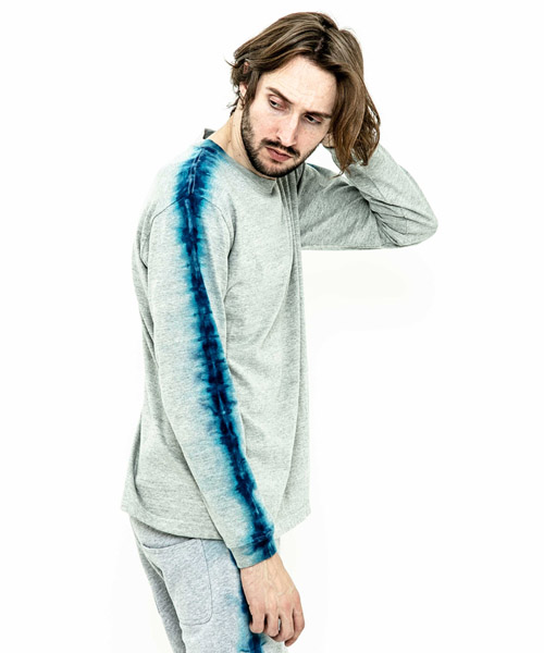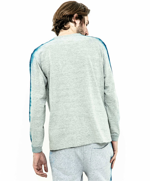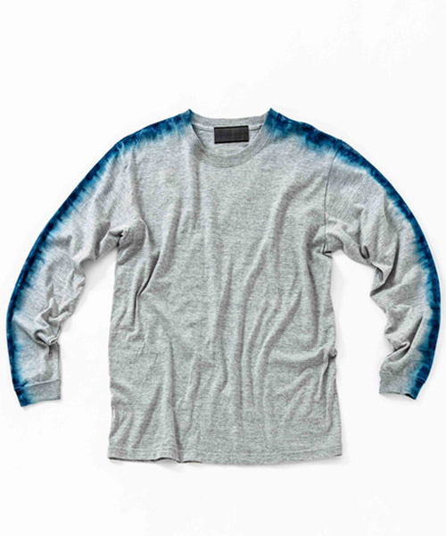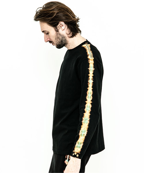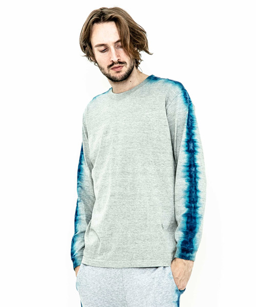 spec | 首フライスは2本針縫製、丸胴に編み立てた身頃を使用したベーシックでスマートなシルエットのL/S Tシャツ。愛知有松地方で活動する職人による絞り染めにてラインを表現。ブラックは抜染、グレーは重ね染めを施している。手作業にてタイダイ染めを施している為、1点1点表情の異なる特別な1枚となる。 |
