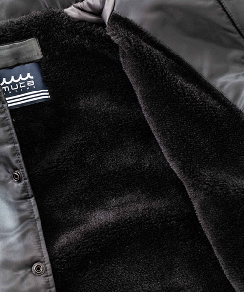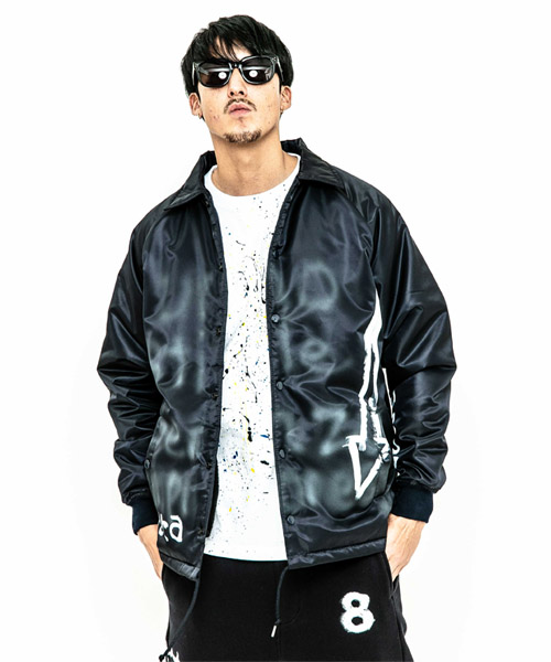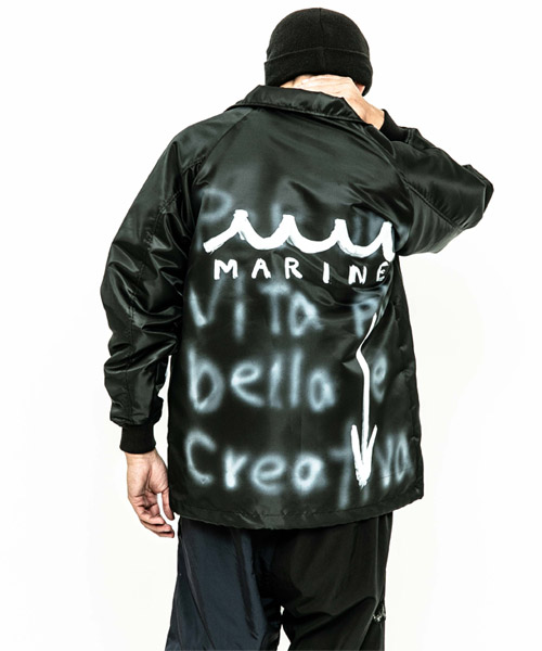 見頃裏には保温性の高いボア生地、袖には中綿を挟んだポリエステル生地を使用したコーチJKT。ペインターによるエアスプレーと手書きを用いたグラフィックを1点1点施している。量産プリントには表現できない、ハンドペイントによる特別な味わいや表情を楽しめる1着。