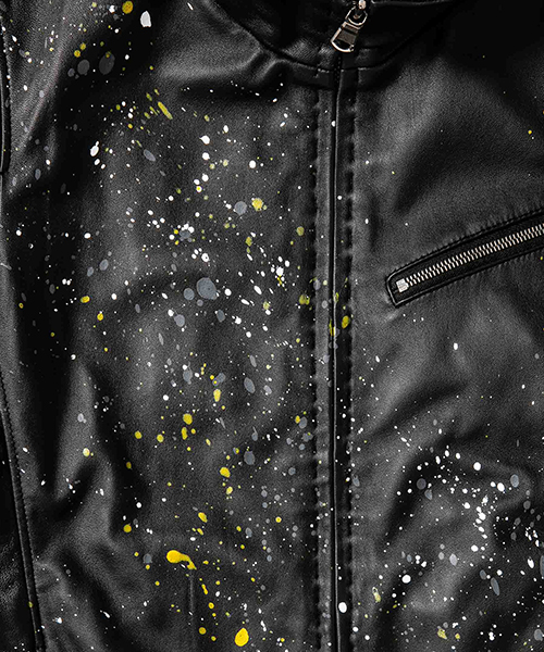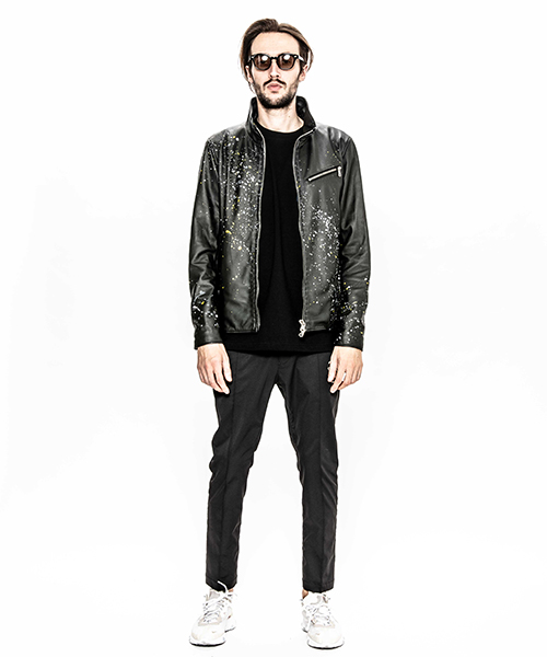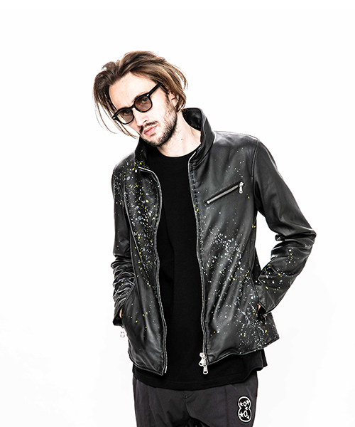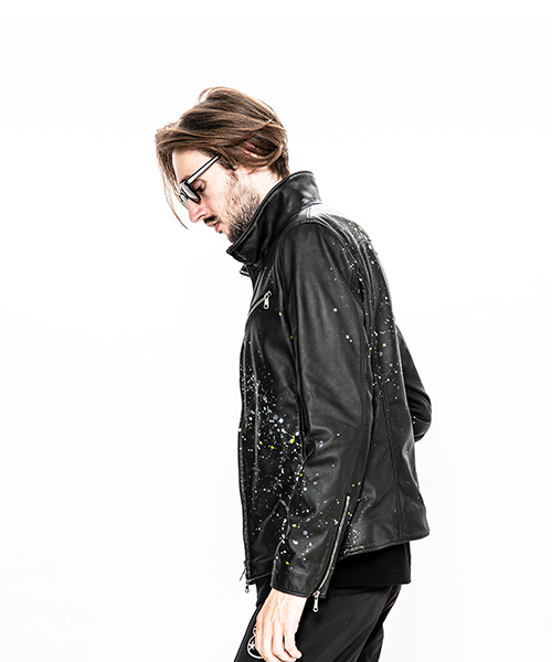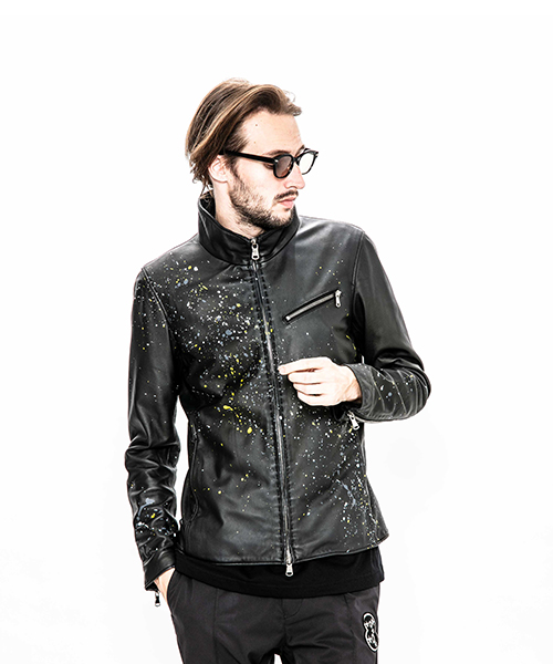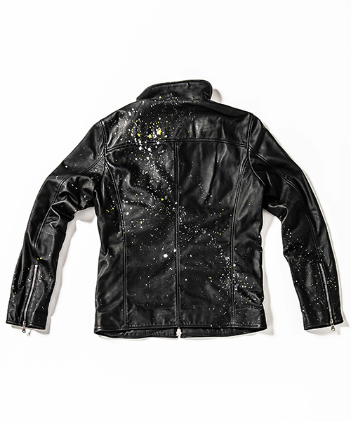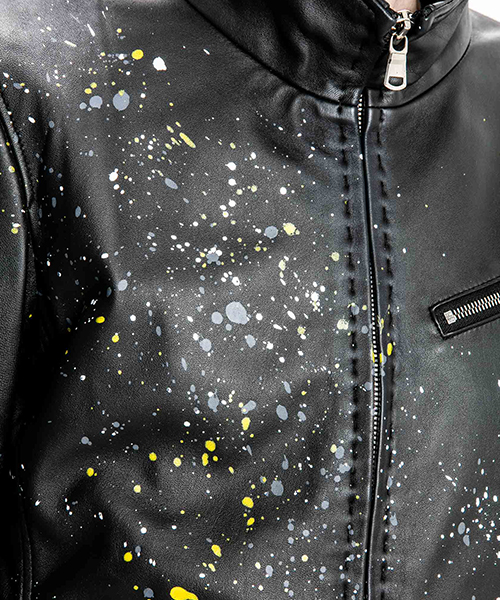 | spec | スポーツテイストなトラックJKT、ライダースJKTの要素をミックスしたデザイン。裏地には肌滑りの良いポリエステル素材を使用。ファスナーには高品質なYKKファスナーを使用。フロントには職人手作業による、1番手の糸を用いたハンドステッチを配置。最終工程でドラミング加工を施し、レザーのエイジングを表現。さらに手作業によるマルチカラーのハンドスプラッシュ加工を加えている。 |