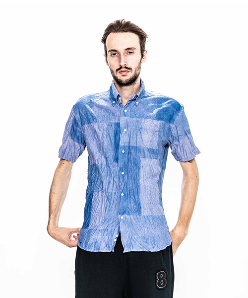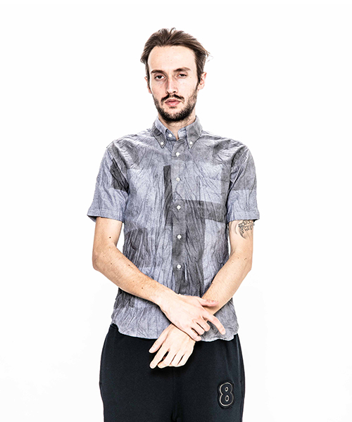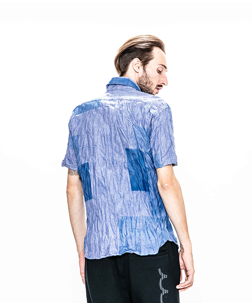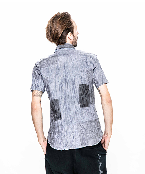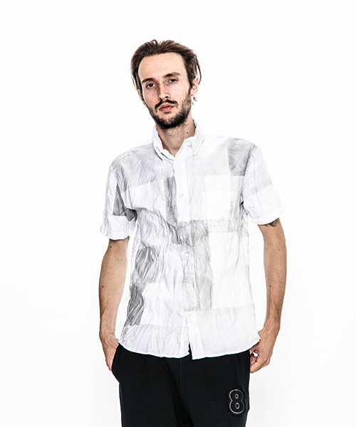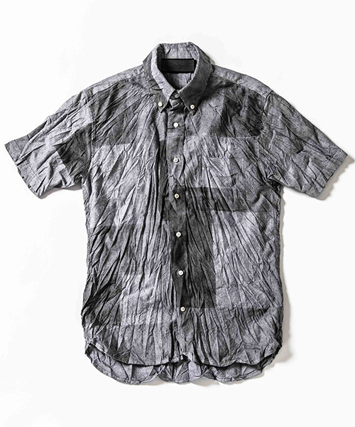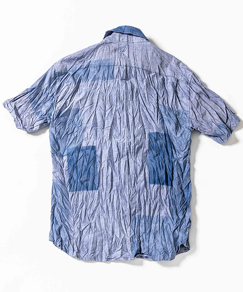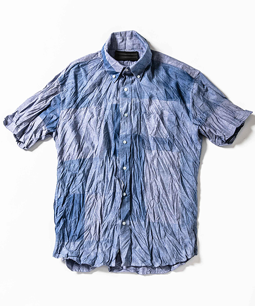 | spec | 両脇にガゼットを配置した、クラシックな半袖B.D シャツ。ボタンには本貝釦を使用。縫製後、特殊な手法によるプリントにて、1点1点特別なパッチワーク柄を表現している。さらに製品洗い、シワ加工を施して表情に奥行きを追加。 |
