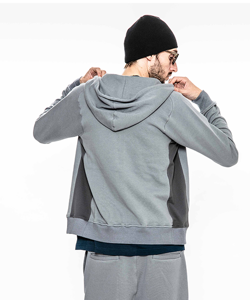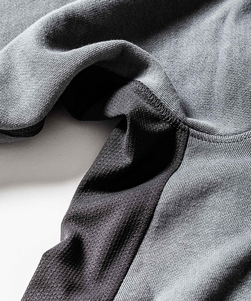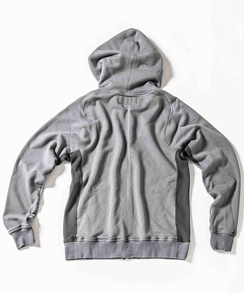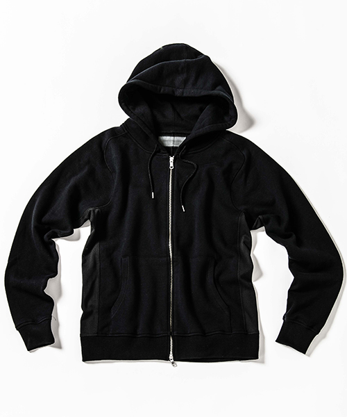| spec | メインに裏毛、脇には高い通気性と吸水速乾性兼ね備えたテクニカルメッシュ生地を使用したフルジップパーカー。脇にマチを配置した通称フリーダムスリーブ仕様。軍隊の運動時に、腕を上げた際に裾が上がり、肌が見えないように開発されたと言われている。脇にマチを配置する事で肩、腕が動き易い仕様となっている。40年代~50年代のスウェットアイテムに見られるディティールだが、縫製コストのかかる仕様で徐々に姿を消していったと言われている。現在も高い縫製技術技の必要な仕様。ファスナーには軽量ながらメタルファスナーのような外観を備えたYKK METALUXEファスナーを採用。フードにはスピンドルを配置。着心地の良い裏毛と機能的な素材を組み合わせたハイブリットな仕上がり。 |