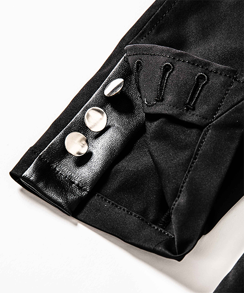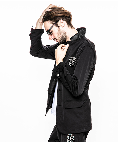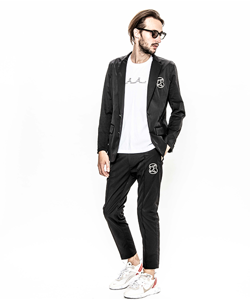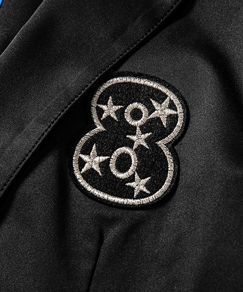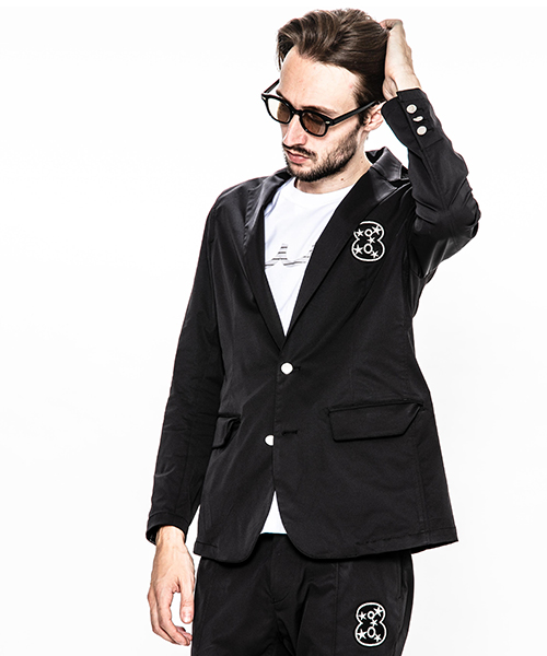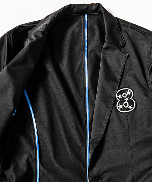 | spec | mutaとのコラボレーションコレクション。特別にシルバー糸にて作成した☆柄8ロゴワッペンを配置。1枚仕立てで、軽量なテーラードJKT。フロントは2B釦、袖は本明き仕様。裏側の縫い代始末にはサテン地のパイピングテープを配置し色味のアクセントを追加。上衿裏、袖口明きの内側にはラムレザーを配置。ストレッチ性を生かした、綺麗なタイトシルエット。 |