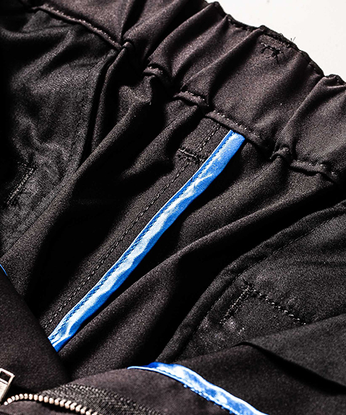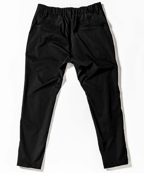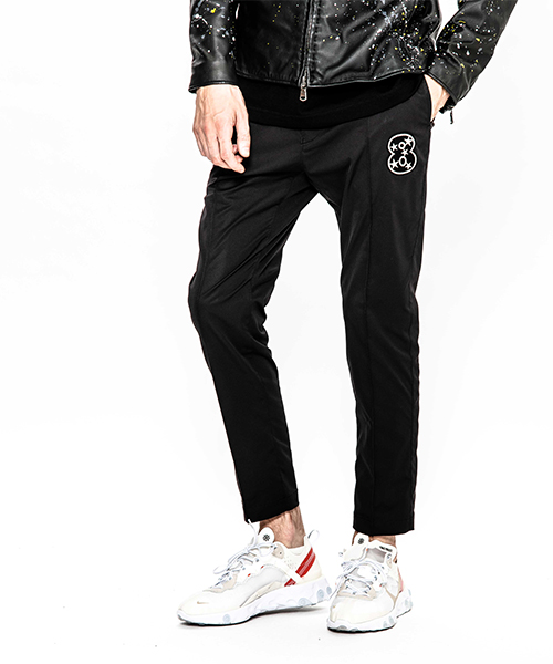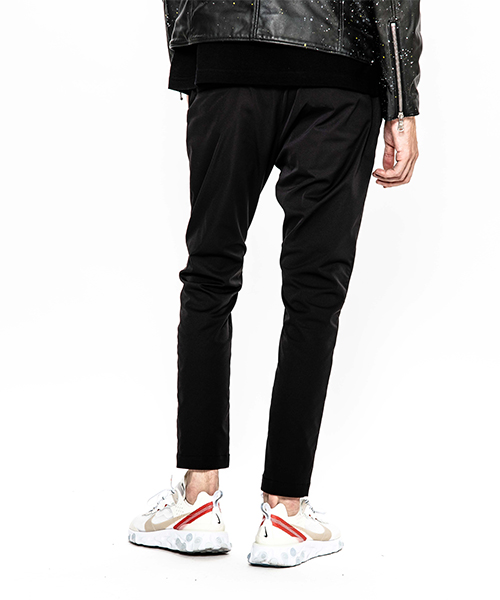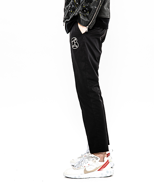 | spec | mutaとのコラボレーションコレクション。特別にシルバー糸にて作成した☆柄8ロゴワッペンを配置。ウエスト背面に平ゴムを配置し、履き心地を向上。ウエストにはスピンドルを追加することで、ベルトと紐の2WAYで着用可能。裾に向かってテーパードさせた9部丈のタイトシルエット。フロントにピンタックを施している。股の縫い代始末にはサテン地のパイピングテープを配置し色味のアクセントを追加。シーズン毎に若干のパターン修正を加え、アップデートを繰り返しリリースしている定番の1本。 |