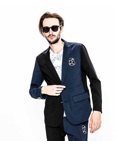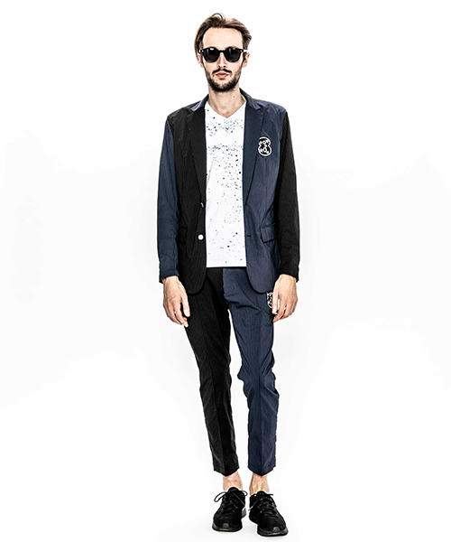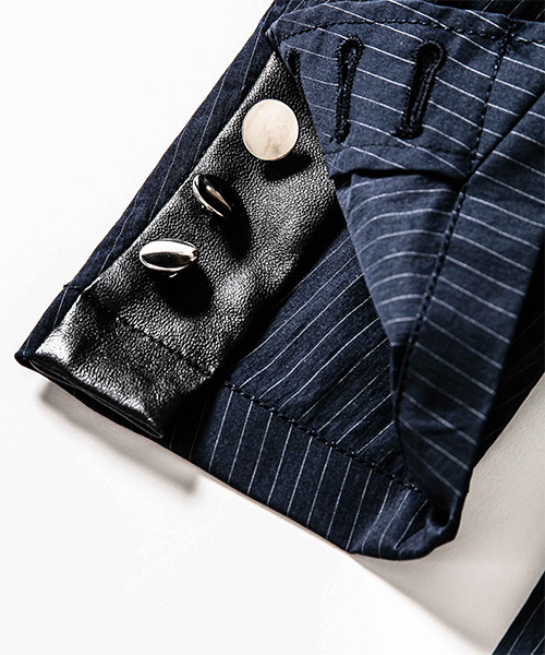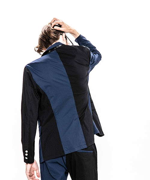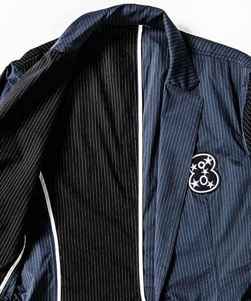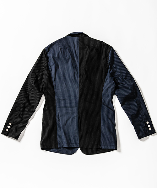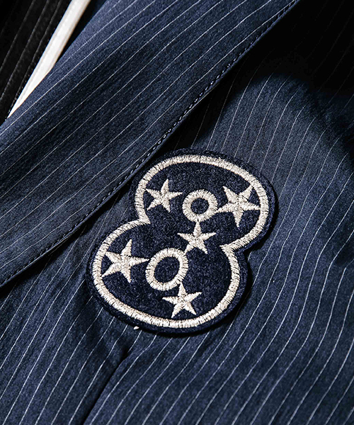 | spec | mutaとのコラボレーションコレクション。特別にシルバー糸にて作成した☆柄8ロゴワッペンを配置。ストライプのブラック色、ネイビー色の2色を切り替えた特別バージョン。1枚仕立てで、軽量なテーラードJKT。フロントは2B釦、袖は本明き仕様。裏側の縫い代始末にはサテン地のパイピングテープを配置し色味のアクセントを追加。上衿裏、袖口明きの内側にはラムレザーを配置。ストレッチ性を生かした、綺麗なタイトシルエット。 |