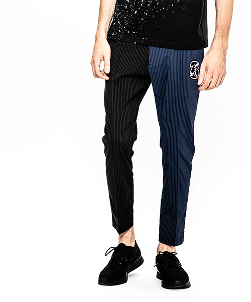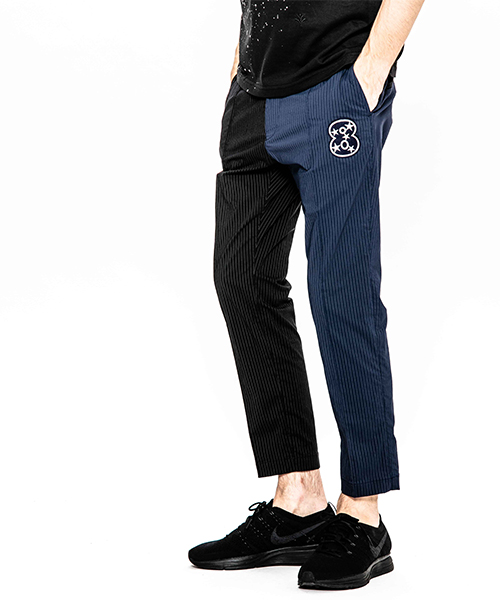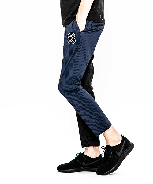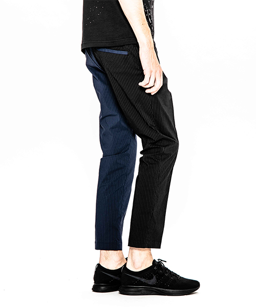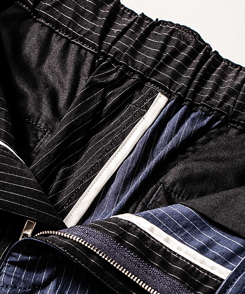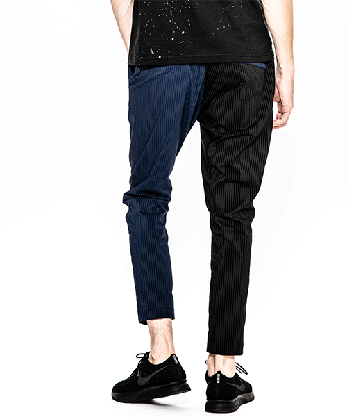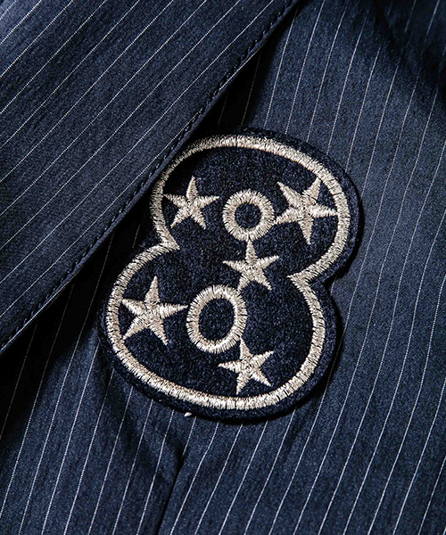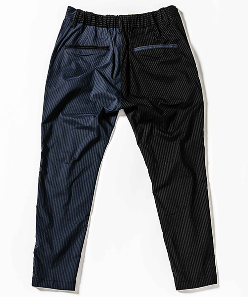 | spec | mutaとのコラボレーションコレクション。特別にシルバー糸にて作成した☆柄8ロゴワッペンを配置。ストライプのブラック色、ネイビー色の2色を切り替えた特別バージョン。ウエスト背面に平ゴムを配置し、履き心地を向上。ウエストにはスピンドルを追加することで、ベルトと紐の2WAYで着用可能。裾に向かってテーパードさせた9部丈のタイトシルエット。フロントにピンタックを施している。股の縫い代始末にはサテン地のパイピングテープを配置し色味のアクセントを追加。シーズン毎に若干のパターン修正を加え、アップデートを繰り返しリリースしている定番の1本。 |