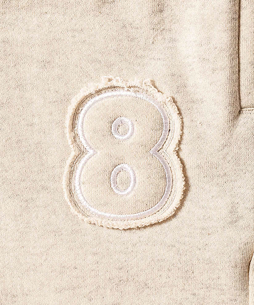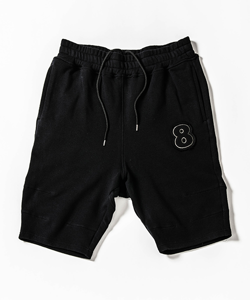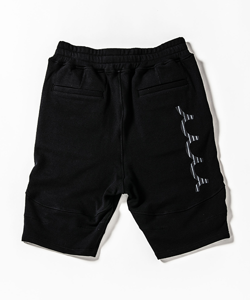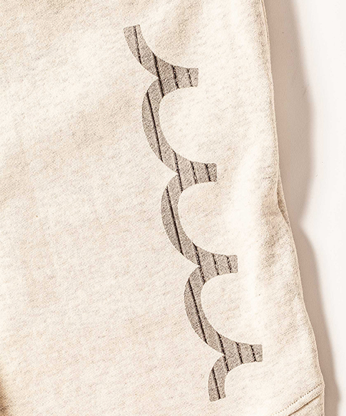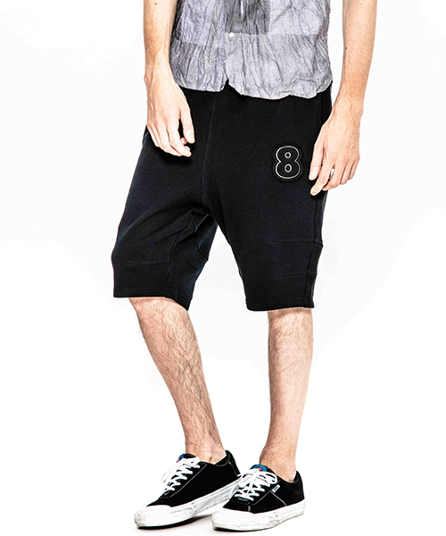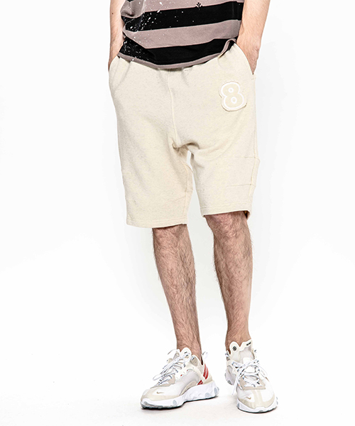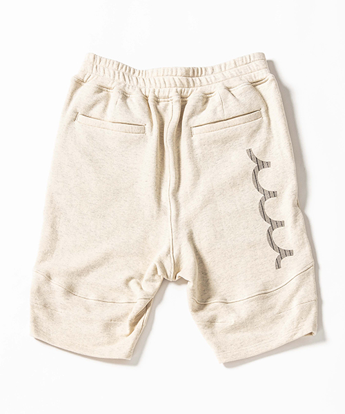 mutaとのコラボレーションコレクション。特別に作成した同生地切りっぱなし8ロゴワッペンを配置し、バックには特殊ボーダー柄の波ロゴをプリント。 ウエストはゴムとスピンドルで調節可能なイージーショーツ。脚の可動に合わせた立体的なダーツ、股上深めのリラックス感のあるセミサルエルシルエットが特徴。