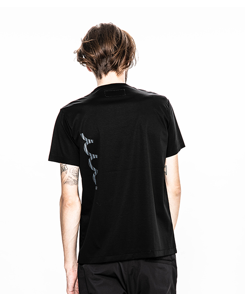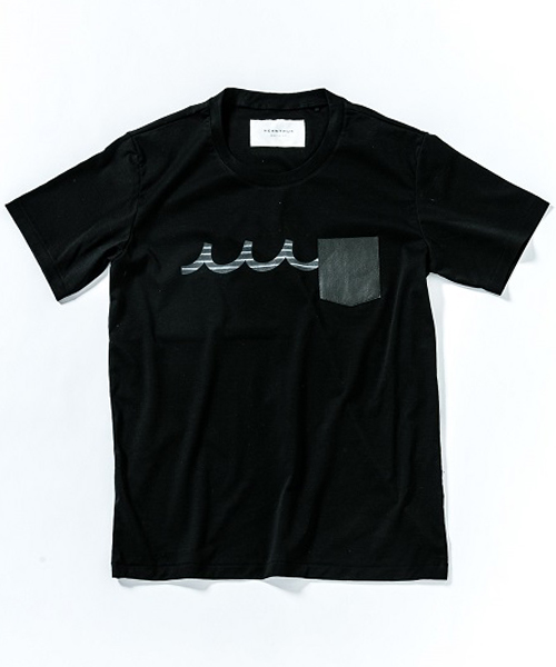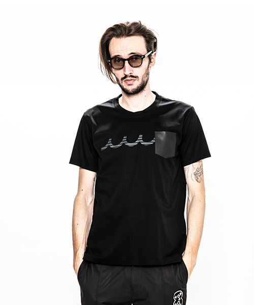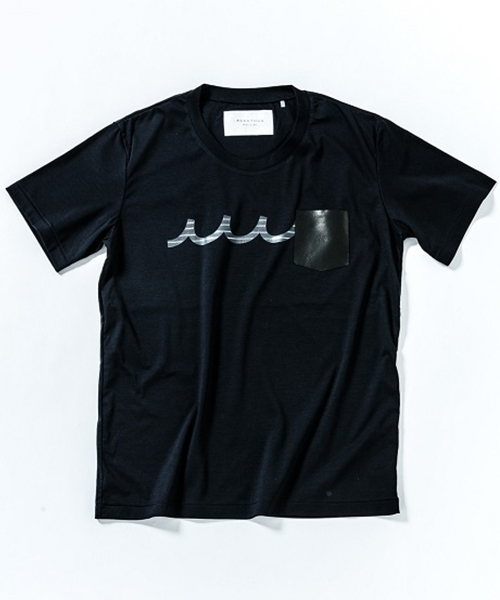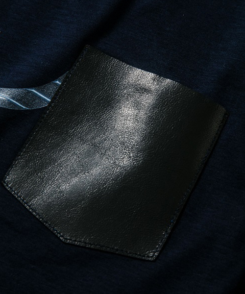 | spec | mutaとのコラボレーションコレクション。特殊な技術でボーダー柄を出す特別プリントをフロント、後身頃脇に配置。左胸には水洗い可能なウォッシャブルラムレザーを使用したポケットを取り付け。生地にはこのシリーズに特別に用意したパール80/-ハイゲージスムース生地を使用。清涼感の続く上質な着心地。 |