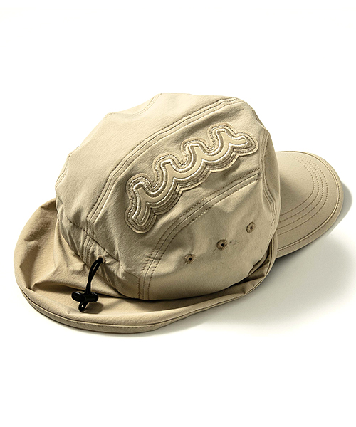 | spec | mutaとのコラボレーションコレクション。フロントには同生地にて作製したmuta波ロゴワッペンを配置。フィッシング、アウトドアに最適な日除けパーツを配置。薄手のパーツの為、収納して被る事も可能。ツバにはコンパクトに折り曲げても形状が戻り、軽量な特殊素材を使用。サイズはドローコードにて調節が可能。クオリティの高い国内縫製にて仕上げている。頭周りには吸水、速乾性に優れたポリエステル生地を使用。 |