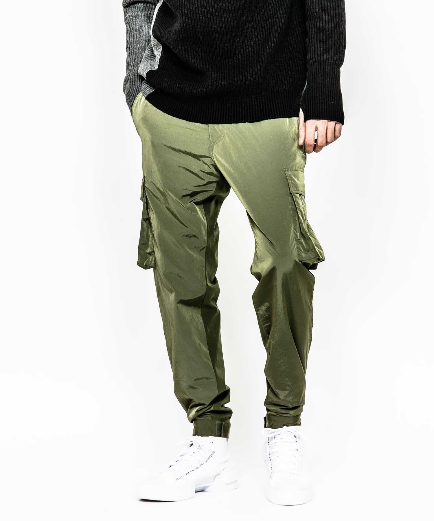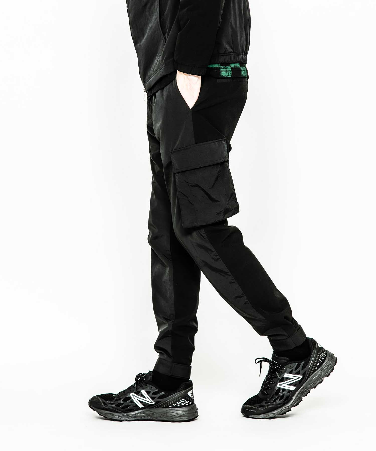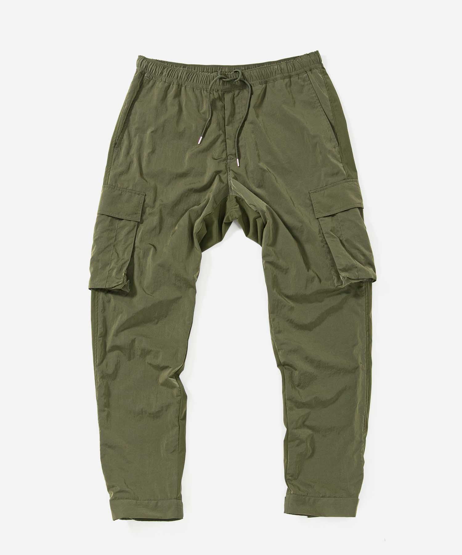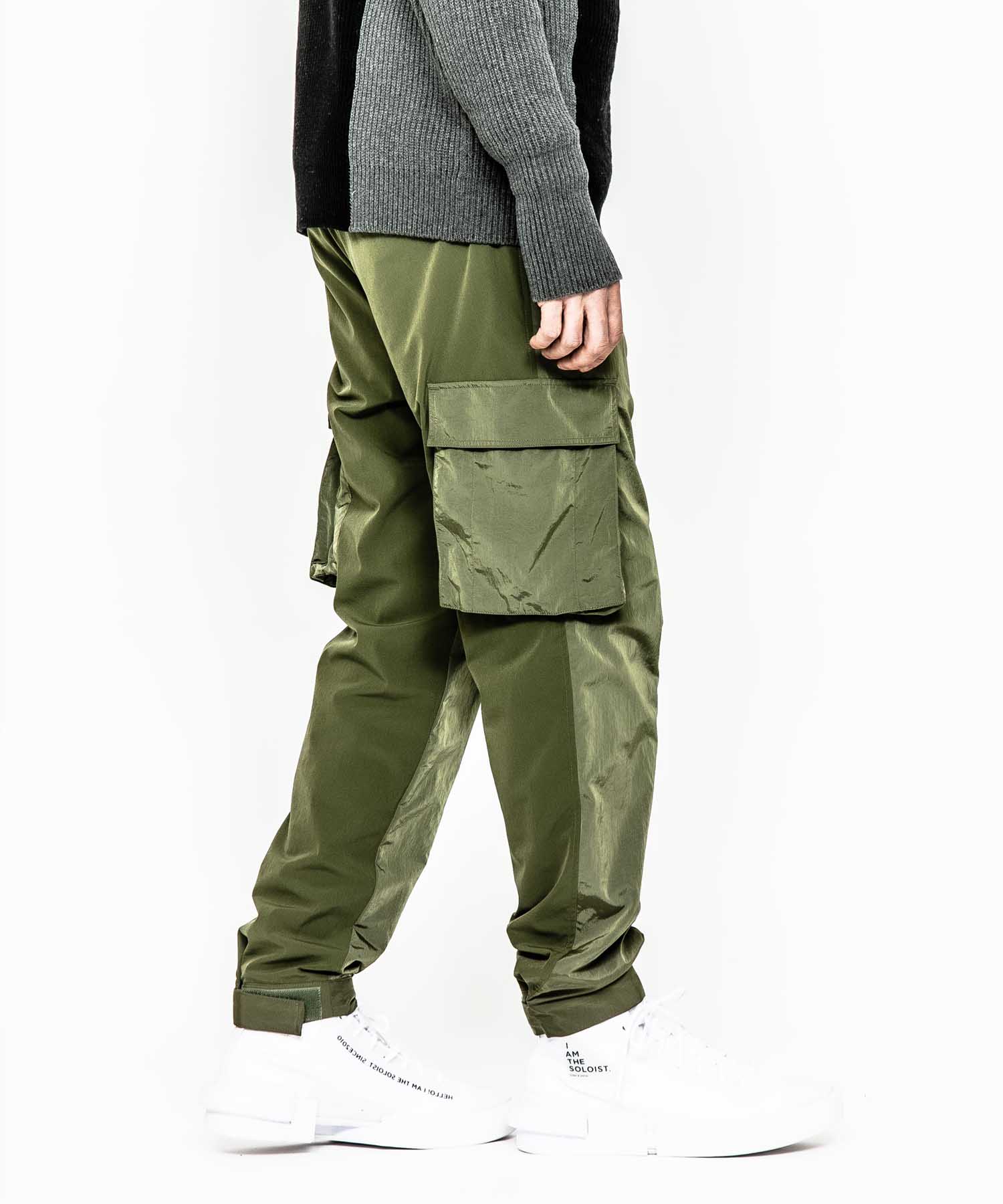 現代ミリタリーに見られる素材使い、切り替えを落とし込んだタクティカルカーゴイージーパンツ。後ろ身パーツにはストレッチ製のコンフォート2WAY生地を使用し動き易さを向上。裾にはベルクロ付きのタブを配置し裾幅を調節する事が可能。裏地にはメッシュ素材を使用し通気性と保温性を向上。ウエスト内側にはドローコードを配置。マチを配置した立体的なカーゴッポケットがアクセントとなっている。 |