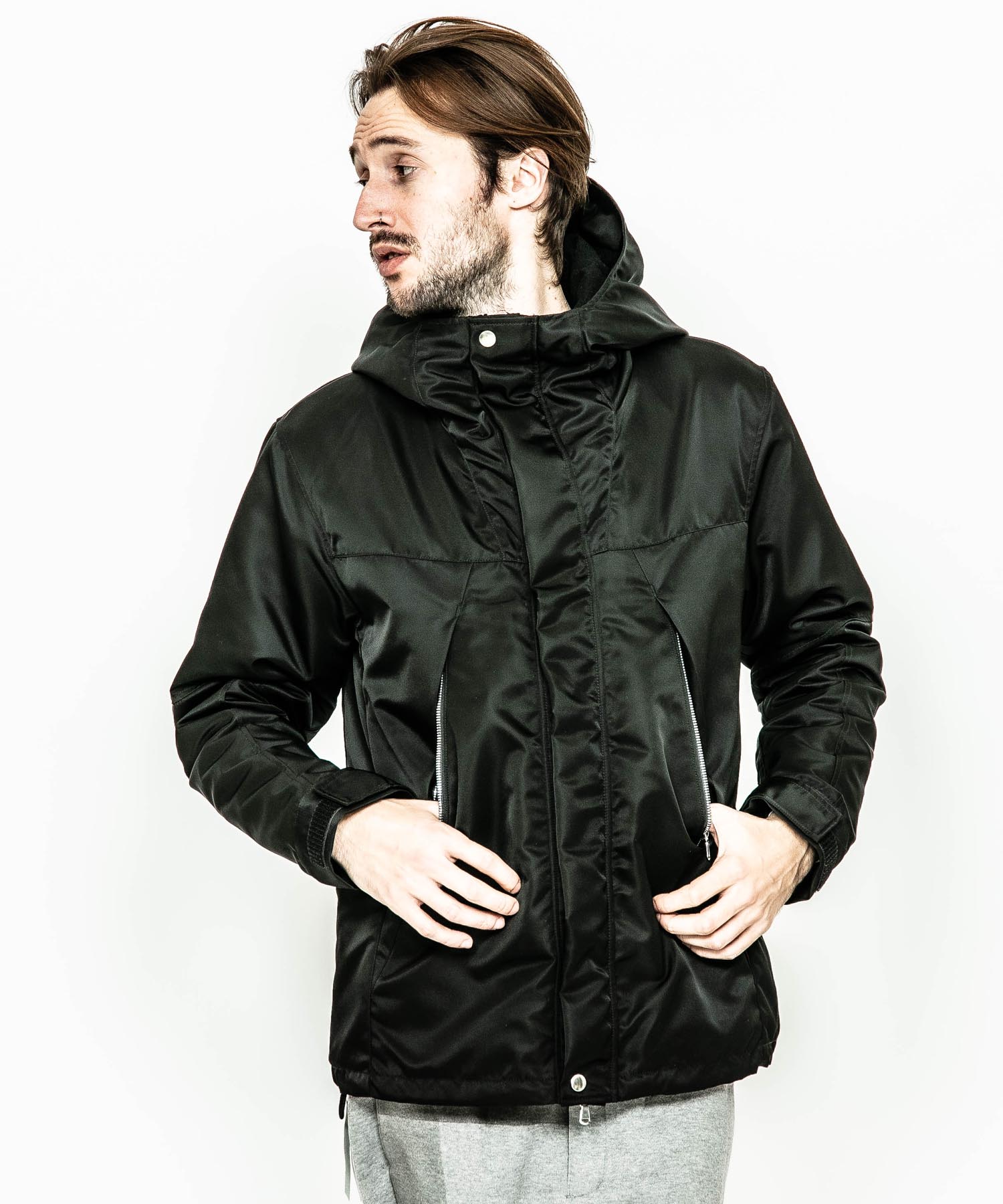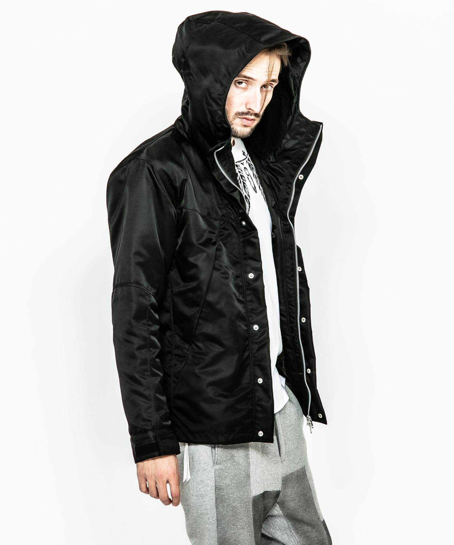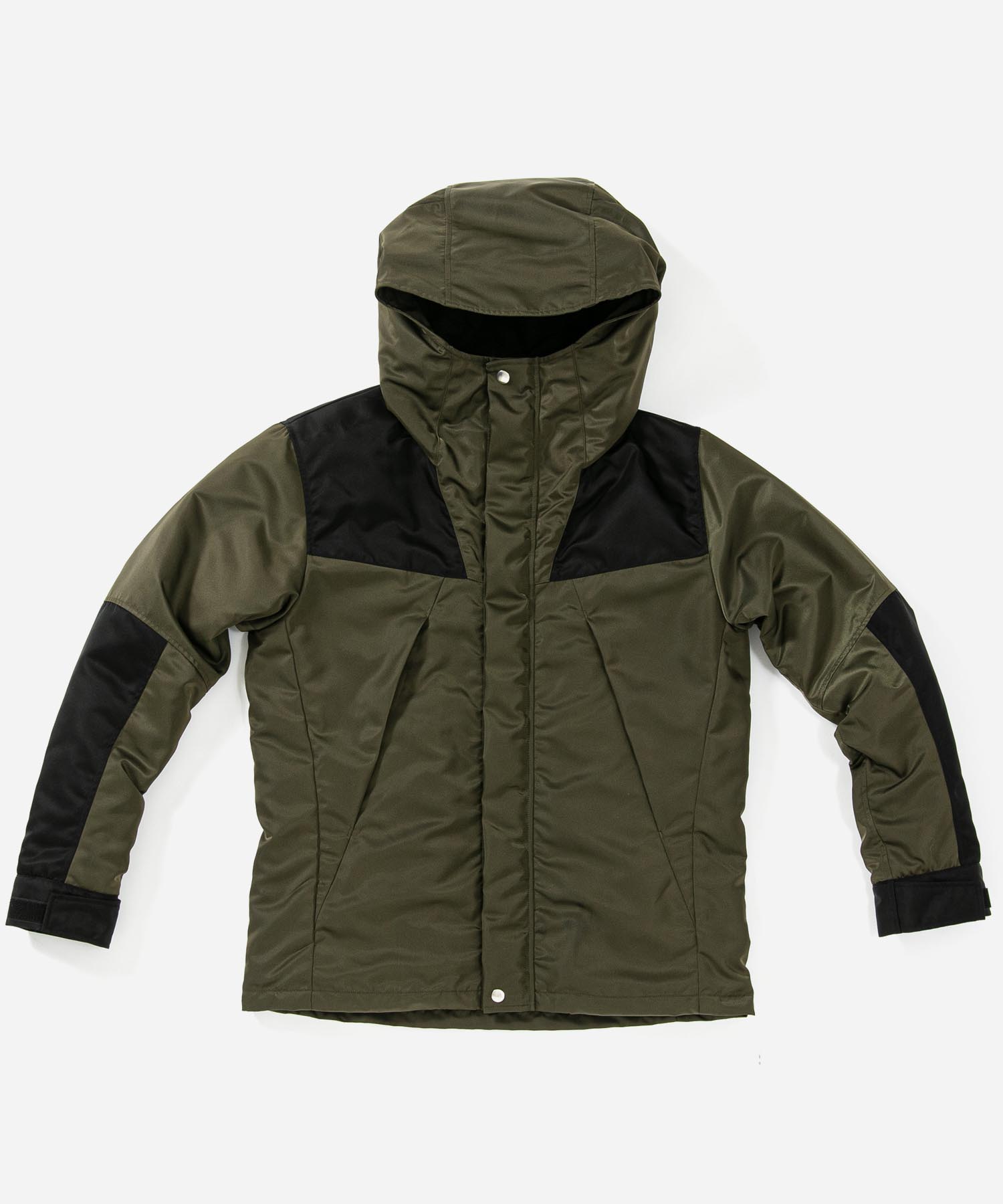 | spec | アウトドアギアに見られる機能的な切り替え、ディティールを落とし込んだマウンテンJKT。ファスナーには軽量感とメッキの高級感を持つYKK社のMATALUXEを使用。裏地には中綿を挟んだキルティング加工を施し、保温性を確保している。袋布には温かみのある起毛コットンを使用。顔を半分覆う事ができる大きく立体的なフードで防寒性を高めている。LIMONTA社のナイロン素材を使用しギア感ではなく上品な表情に仕上げた、有りそうで無かったマウンテンJKT。 |