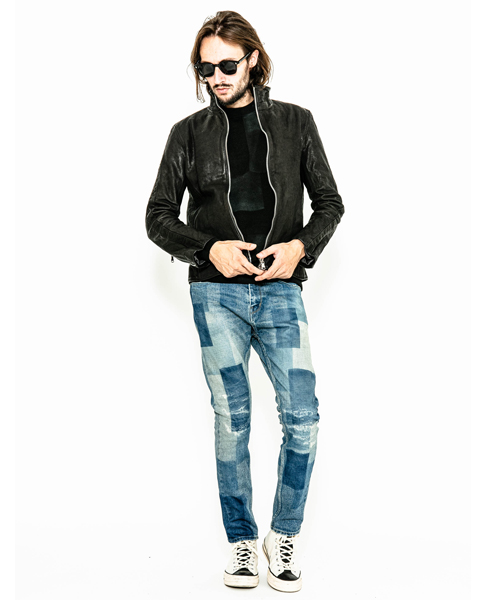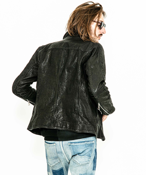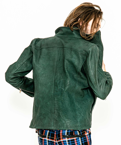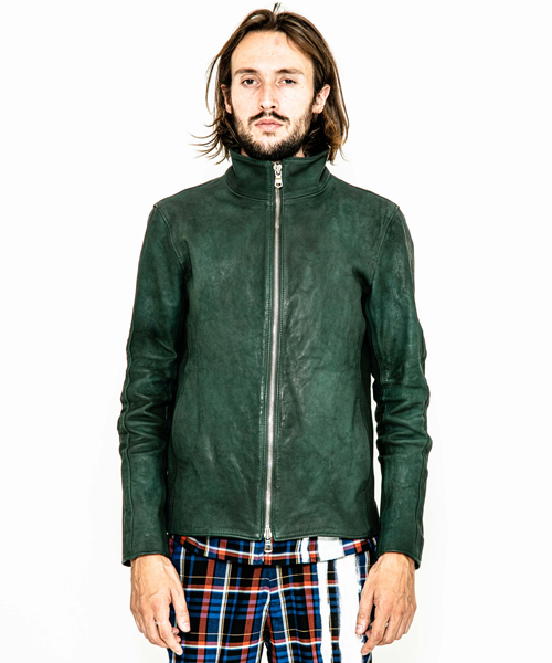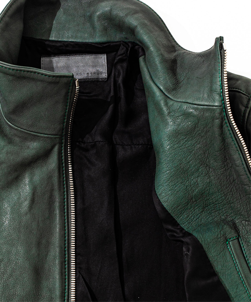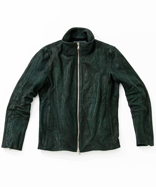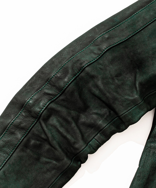 | spec | スポーツテイストなトラックJKTとライダースJKTの要素をミックスしたデザイン。カーフという稀有な素材を大胆に特殊な染め、洗い加工を施した1着。裏地には肌滑りの良いキュプラ、袋布にはコットン生地を使用。ファスナーには高品質なYKK EXCELLAファスナーを採用。袖には着用に伴うシワを表現した3D加工、グリーン色には全体にvintage汚し加工を施している。 |