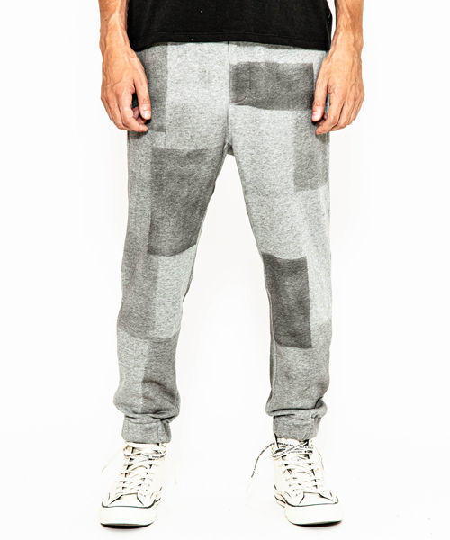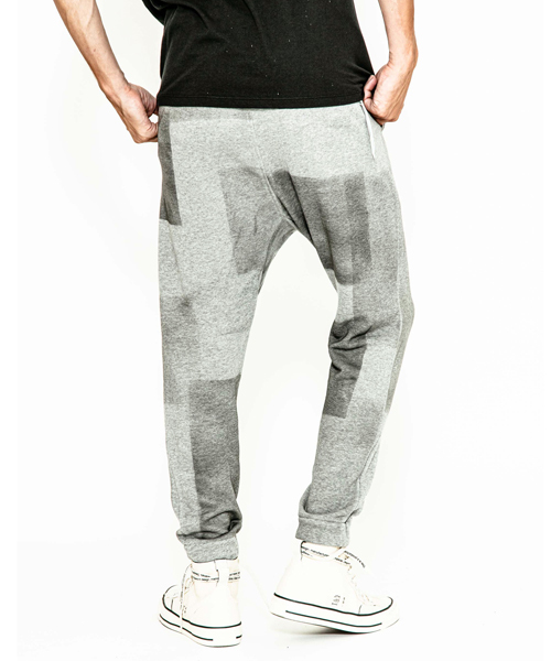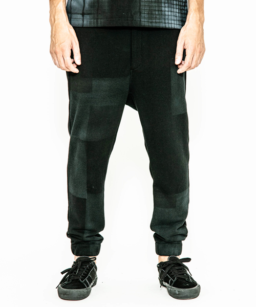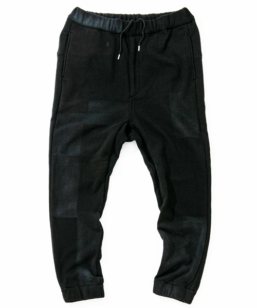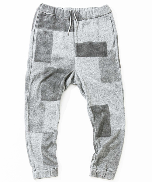 | spec | 股上深めのセミサルエルシルエットのイージーPT。後PKファスナーには軽量感、メッキの高級感を持つYKK社のMATALUXEを使用。引き手にレザーテープを追加。ウエストゴム仕様でスピンドルにて調節が可能。PW品番は特殊な手法によるプリントにて、1点1点特別なパッチワーク柄を表現している。 |