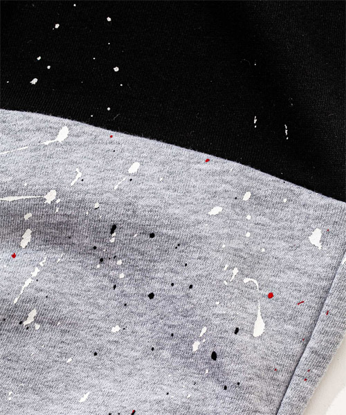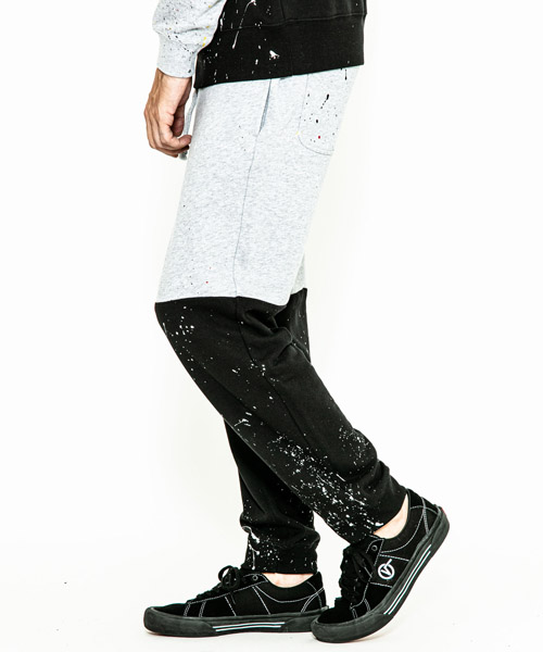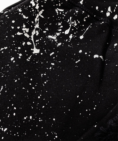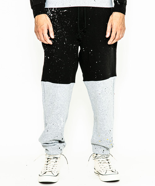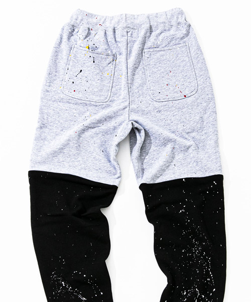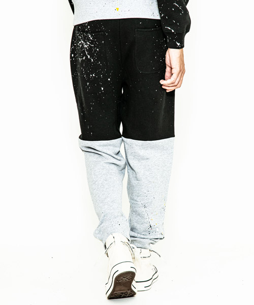 | spec | 裏パイル裏毛を使用したスウェットパンツ。ウエストはゴム&ドローコード仕様のイージーパンツ仕様。動きやすさを重視した程よいリラックスシルエット。縫製後に手作業によるスプラッシュ加工を施した2色のスウェットパンツを、本体パーツ中心で解体&ドッキングさせている。 |