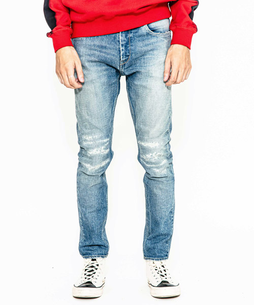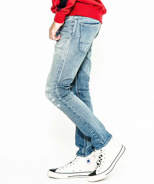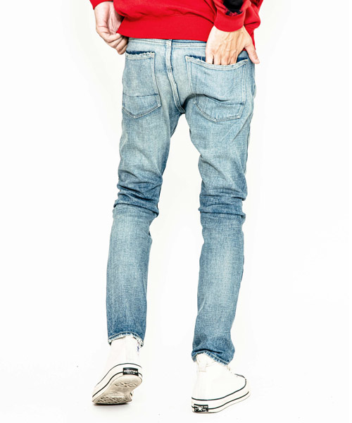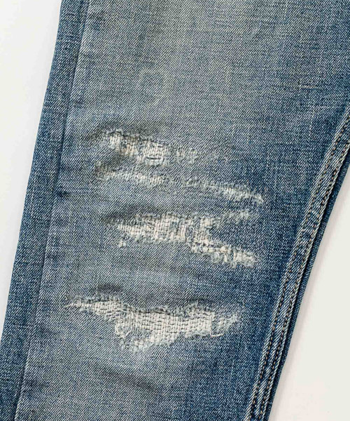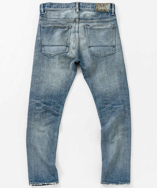 | spec | 釦には“ARTISAN SOUL”ロゴ入りのオリジナルタック釦を使用。裾巾を綺麗にテーパードさせたタイトシルエット。後ろパッチポケットには特殊ミシンによるハシゴステッチを施している。革パッチは加工にギリギリ耐えられるバックスキンを敢えて使用することで1点1点違った表情に。エッジのダメージ、ヒゲ、膝のリペアなどシンプルにヴィンテージデニムを追い求めた1本。Acanthusの新たな定番モデル。 |