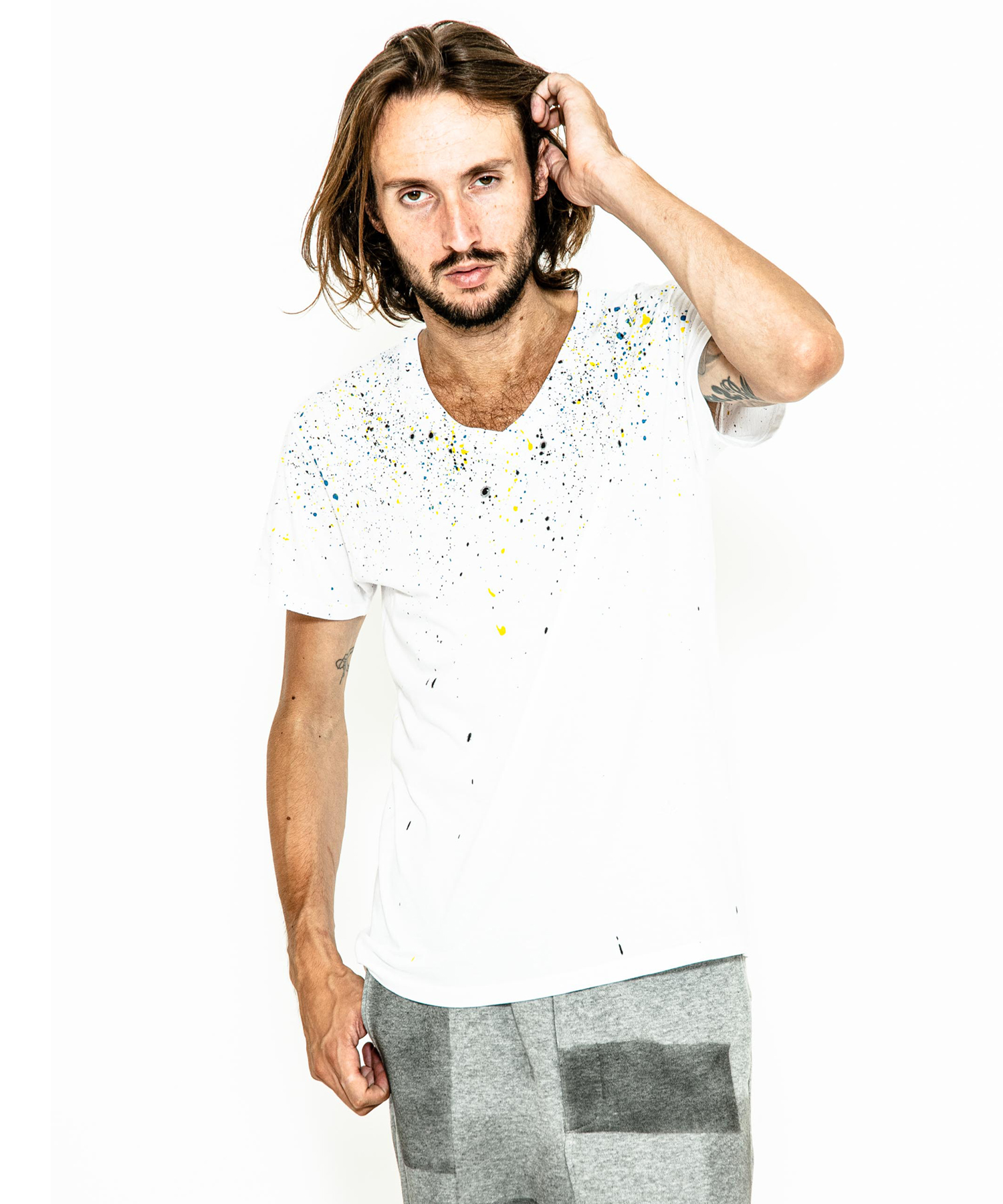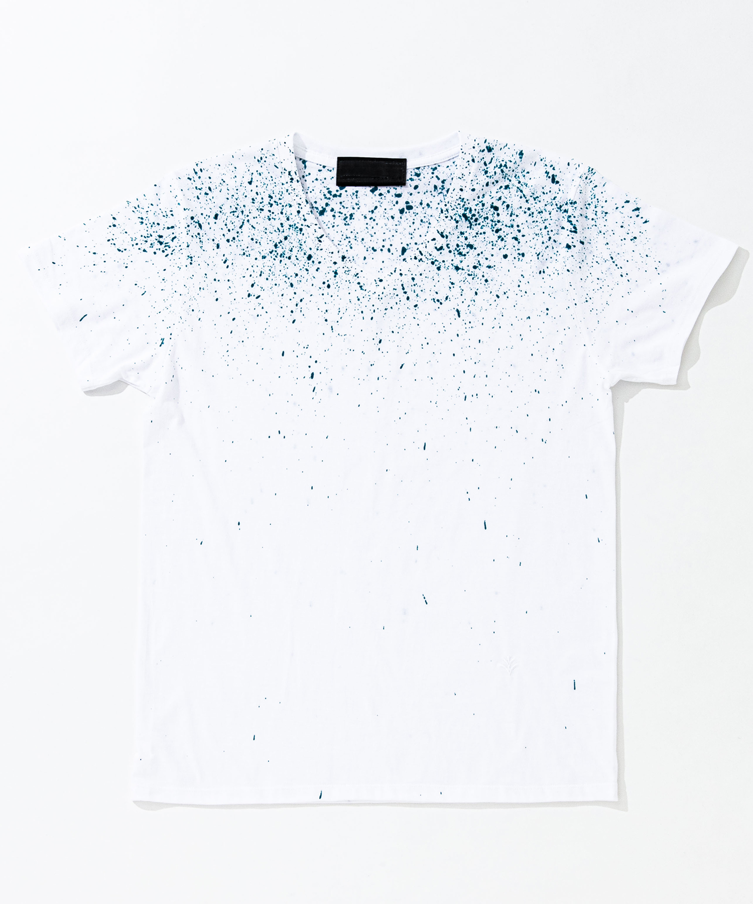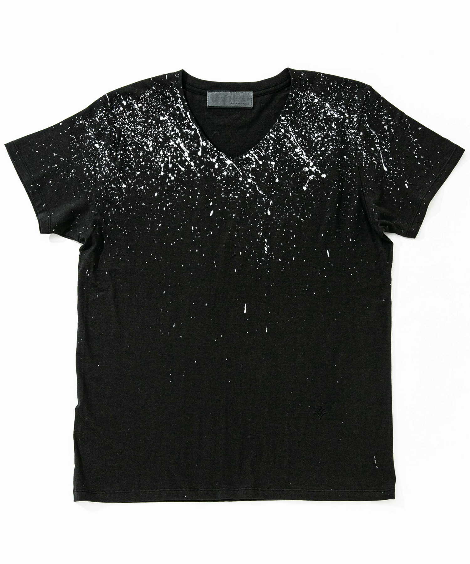 | spec | 丸胴に編み立てた身頃を使用したベーシックながらややタイトに仕上げたVネックTシャツ。左脇にはブランド名であるACANTHUS(地中海地方産ハアザミ 属植物)の形をモチーフにしたアイコンを生地同色にて刺繍。首元から降り注ぐようなスプラッシュペイントを手作業にて施している為、1点1点表情の異なる特別な1枚となる。 |