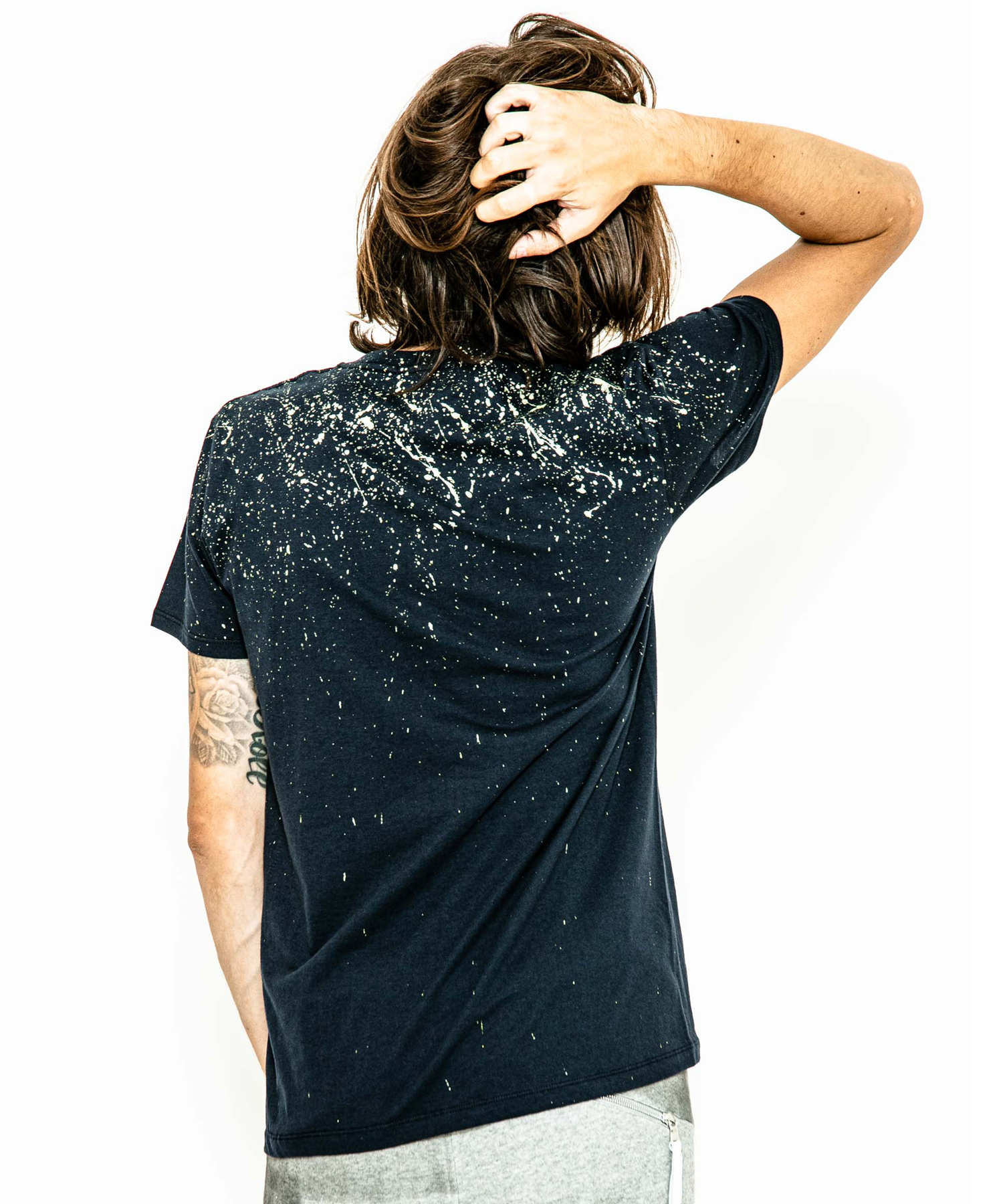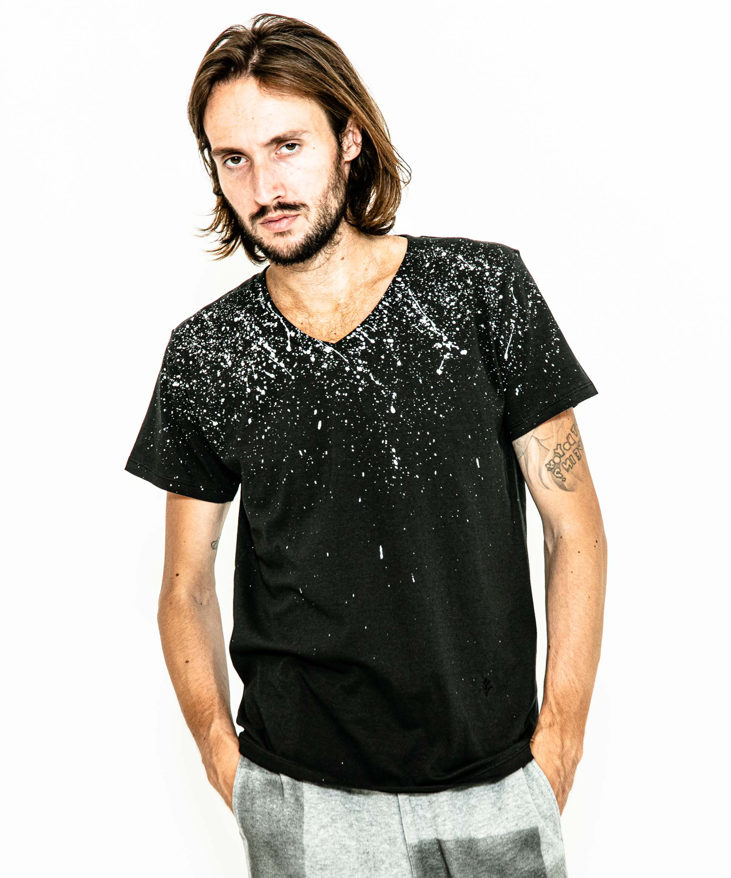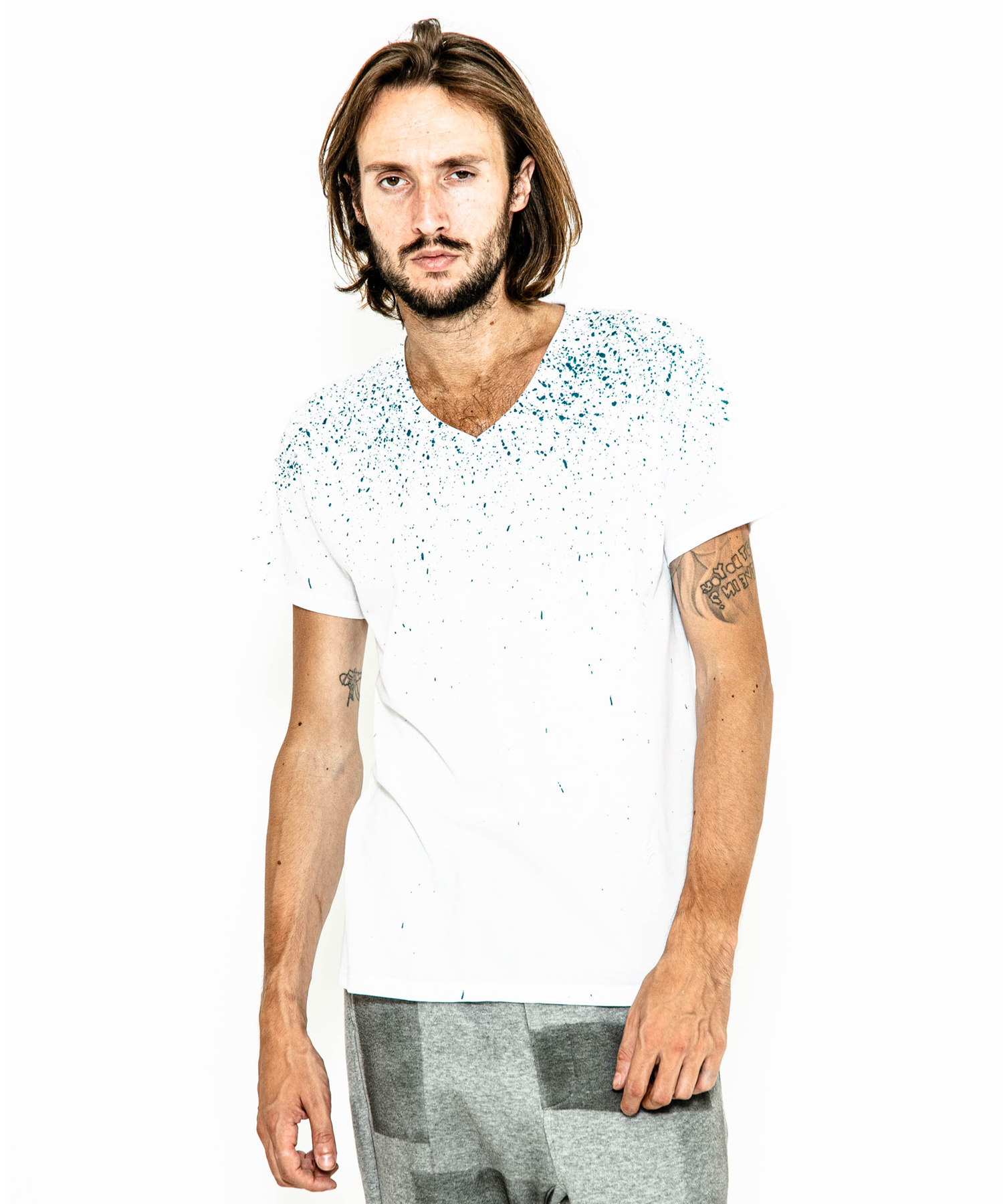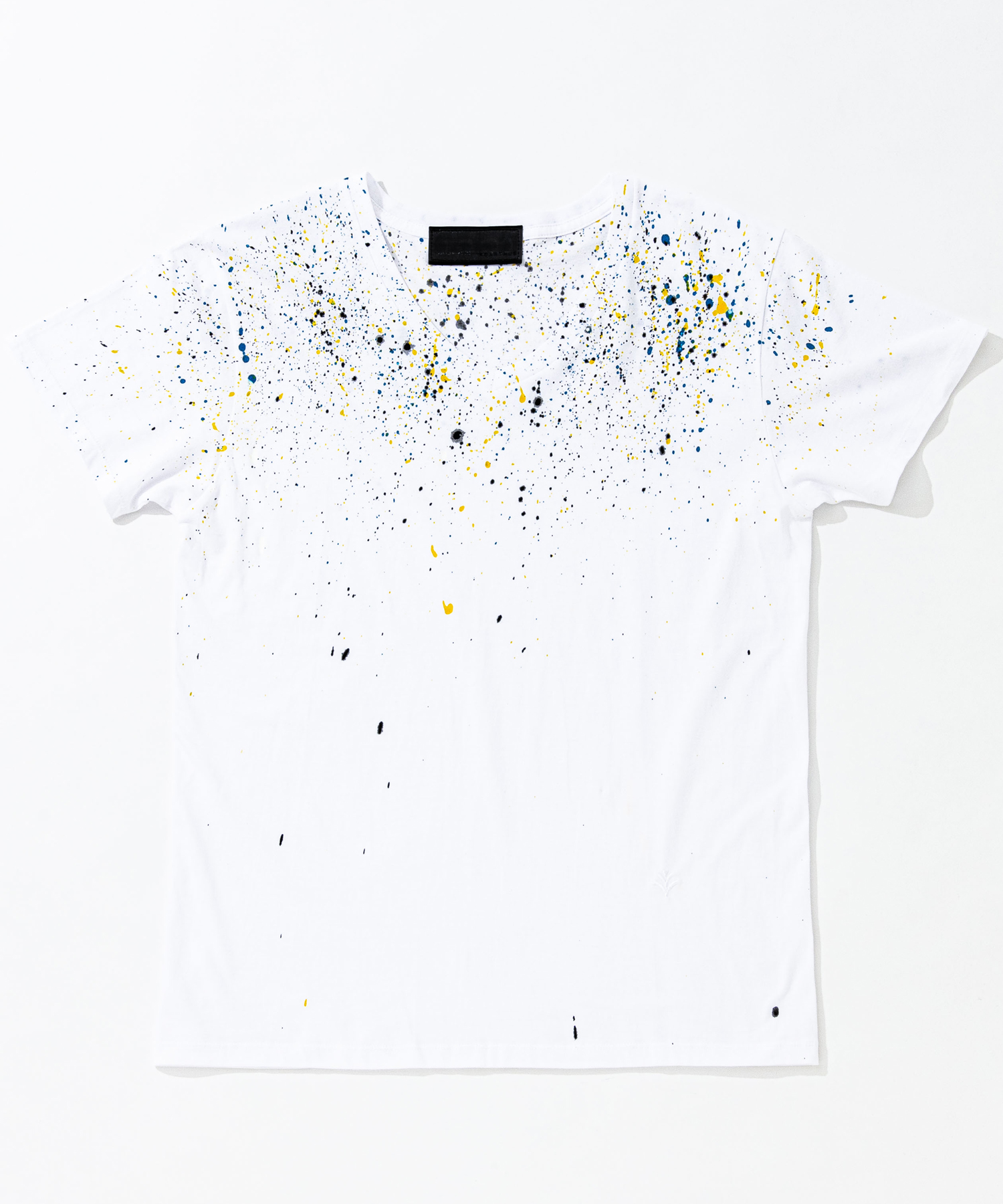 | spec | 丸胴に編み立てた身頃を使用したベーシックながらややタイトに仕上げたVネックTシャツ。左脇にはブランド名であるACANTHUS(地中海地方産ハアザミ 属植物)の形をモチーフにしたアイコンを生地同色にて刺繍。首元から降り注ぐようなスプラッシュペイントを手作業にて施している為、1点1点表情の異なる特別な1枚となる。 |