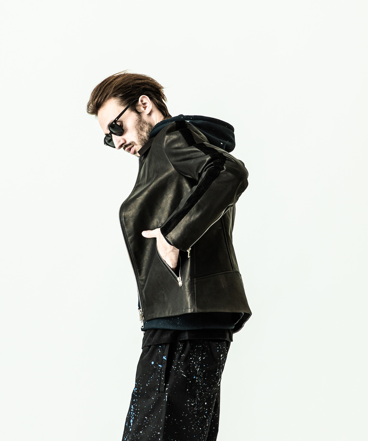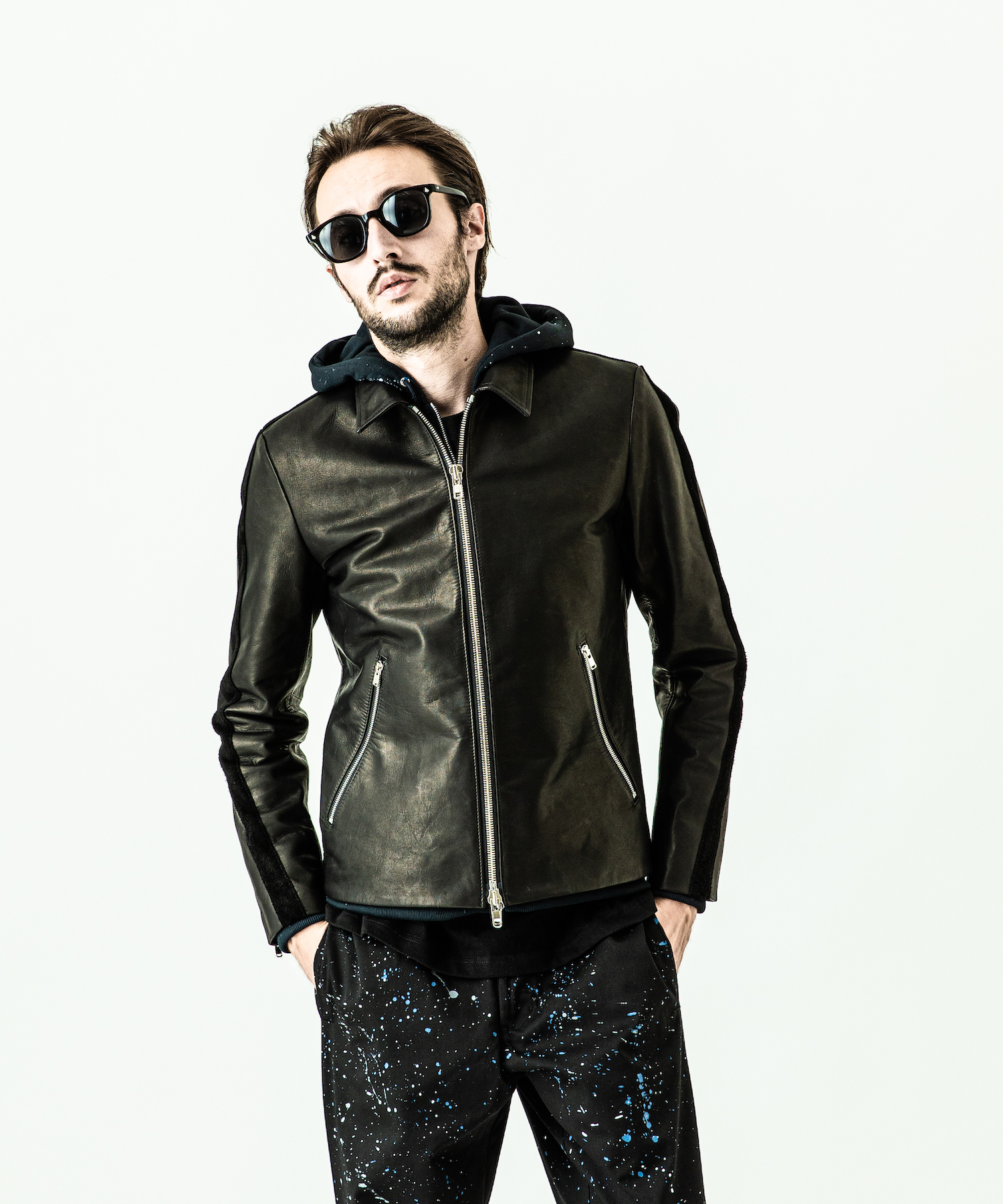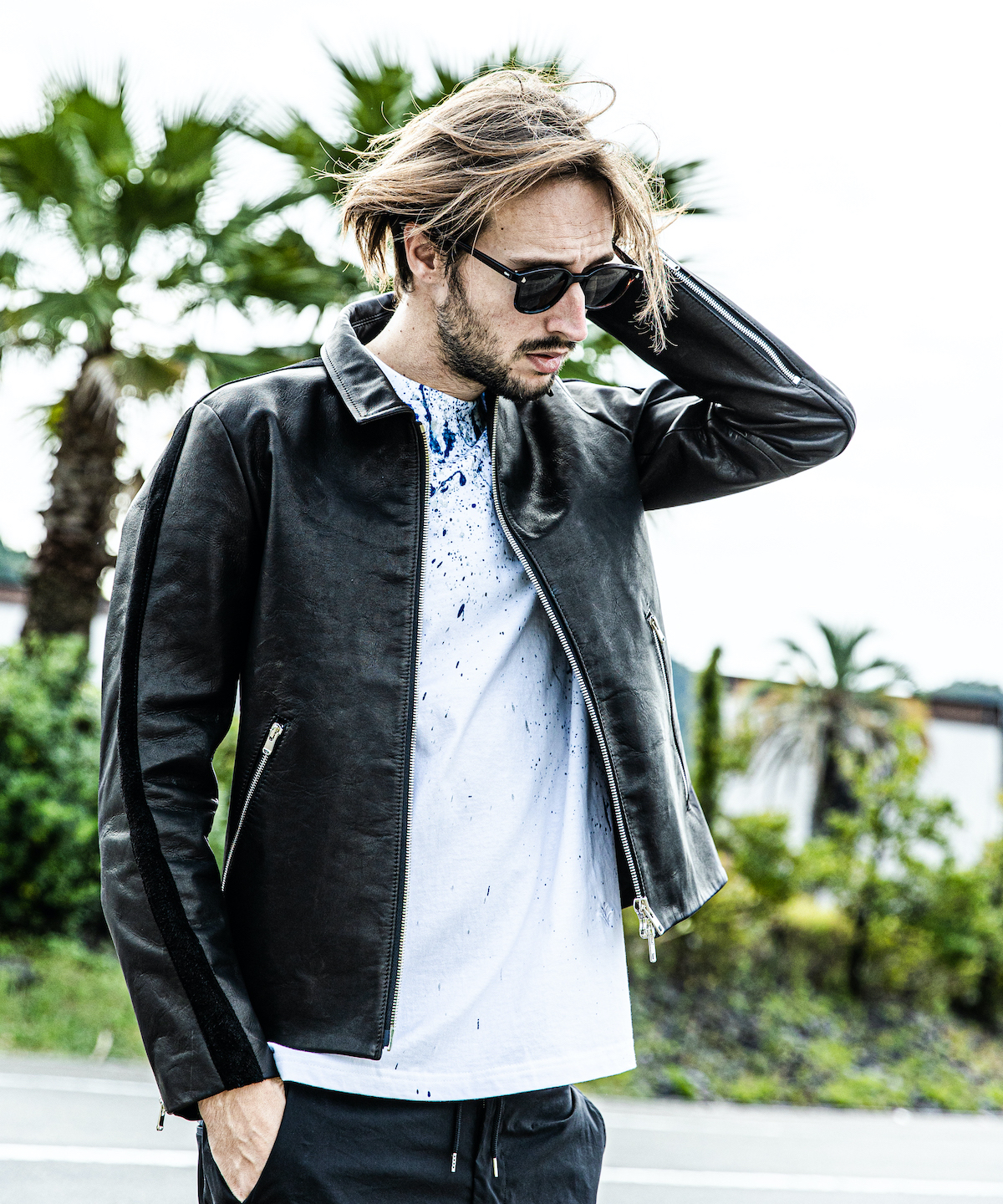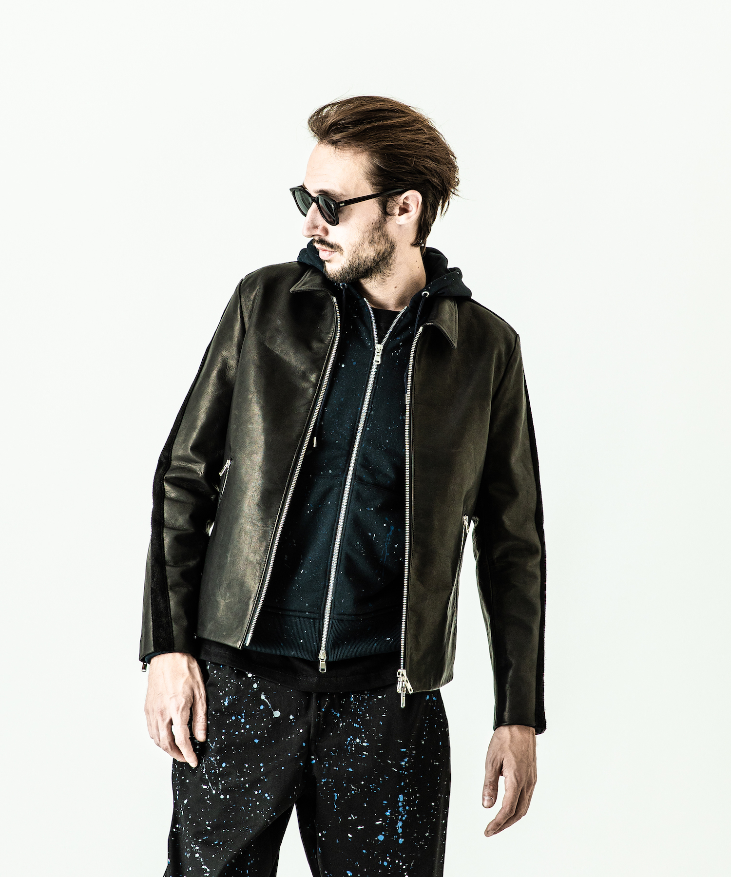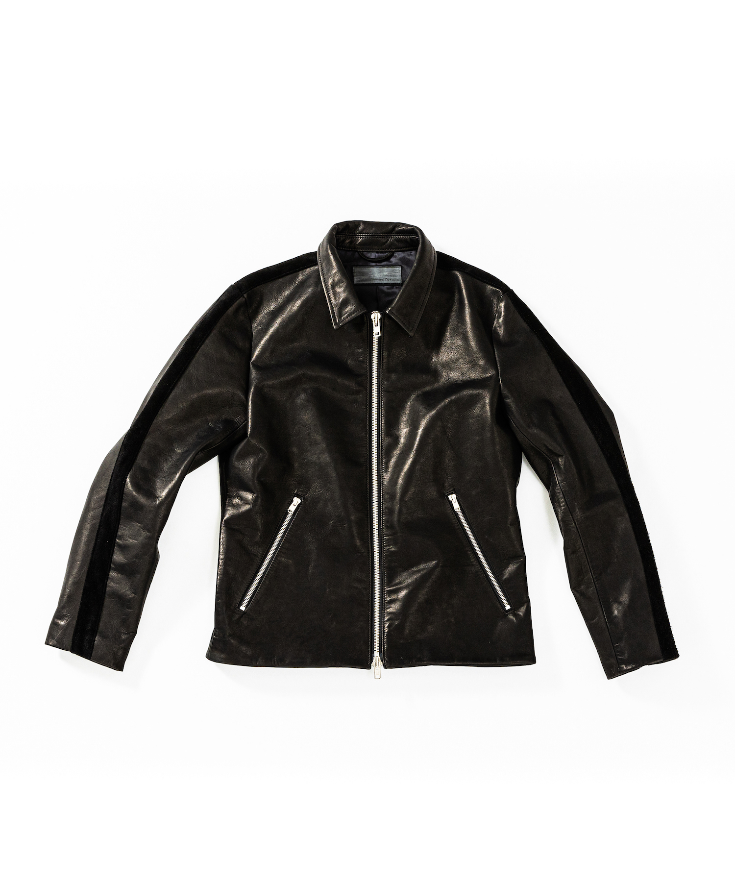 | spec | 襟付きのクラシックなライダースジャケット。ファスナーには高品質なYKK EXCELLA製ファスナーを使用。袖にはカウスウェード(BLACK SUEDE)と、カウレザー(BLACK WHITE)を使用したライン切り替えを配置。裏地には滑らかな着心地のキュプラ生地を使用。 |