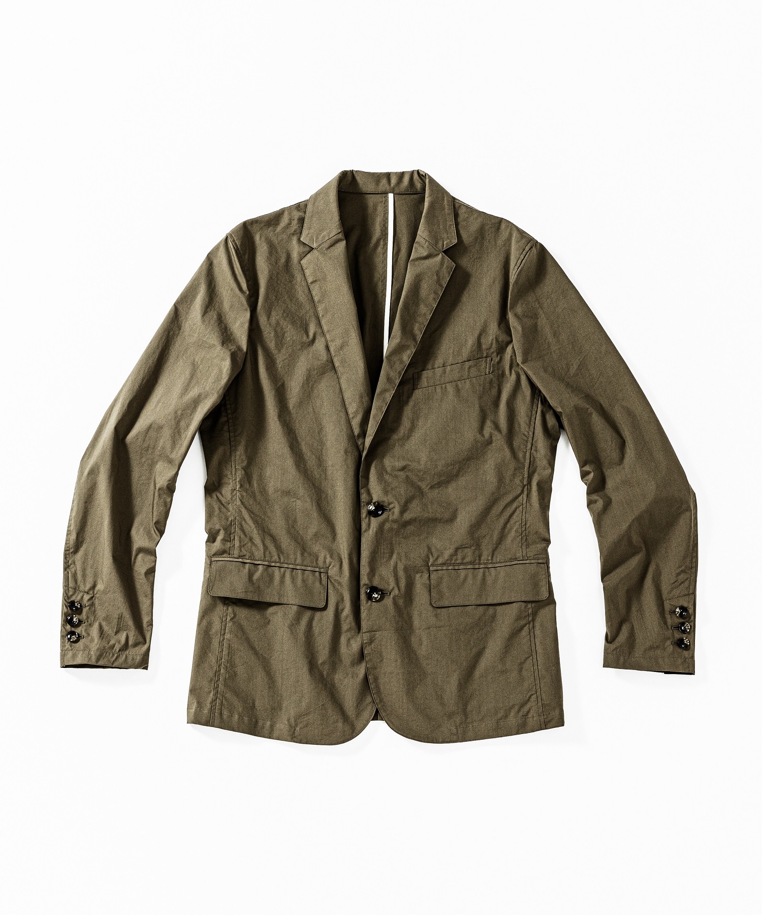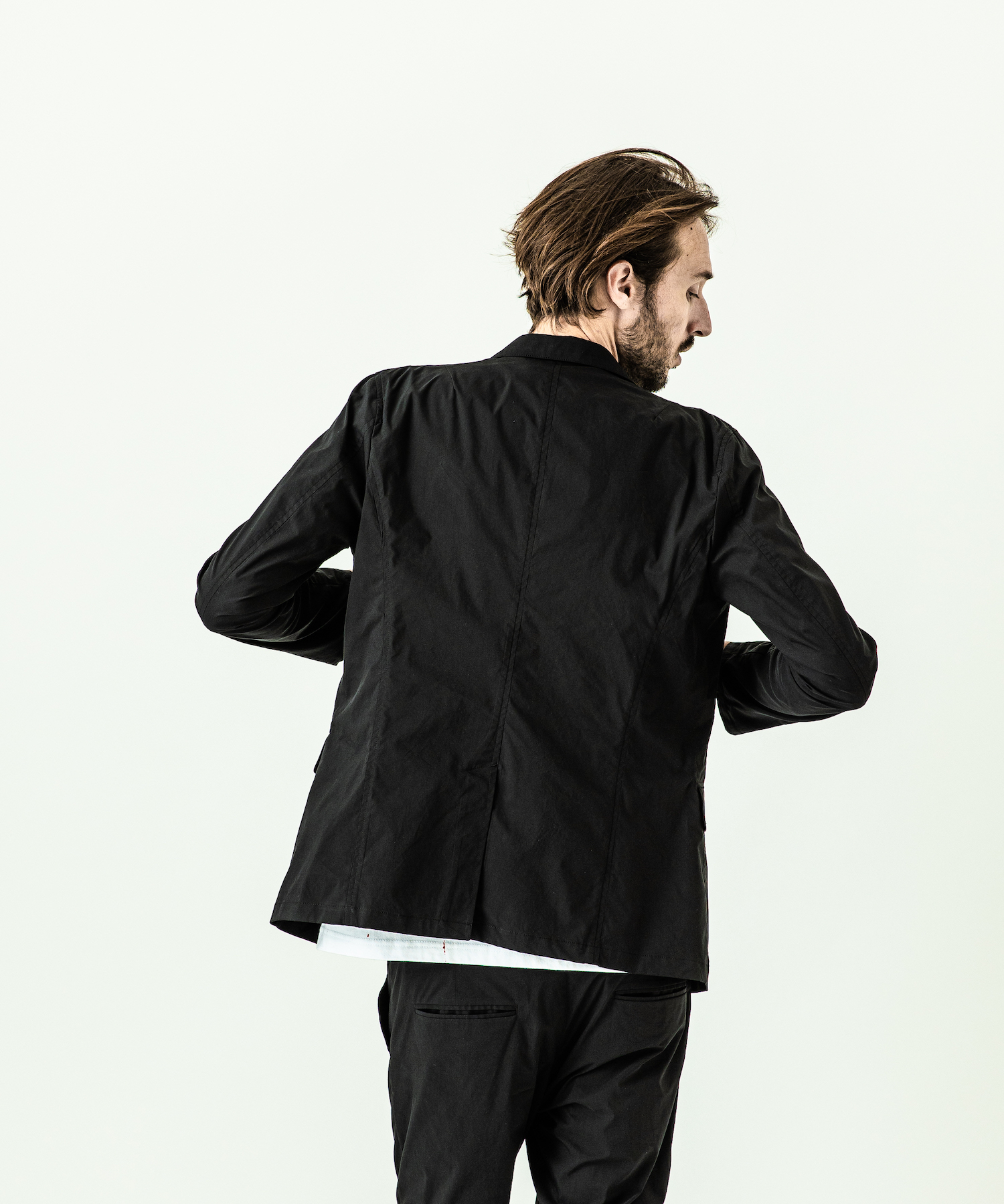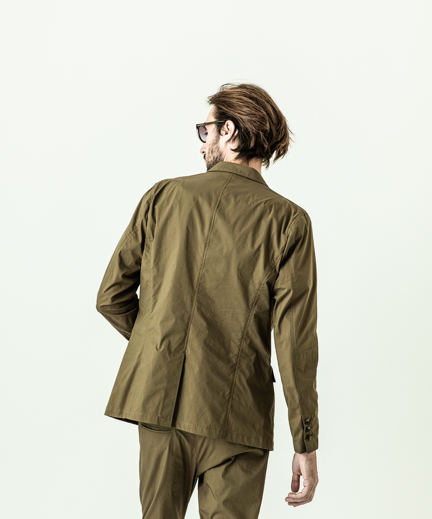 | spec | 一枚仕立てで、軽量なテーラードJKT。フロントは2B釦、袖は本明き仕様。裏側の縫い代始末にはパイピングテープを使用。上衿裏、袖口明きの内側にはラムレザーを配置。ストレッチ性を生かした、綺麗なタイトシルエット。 |