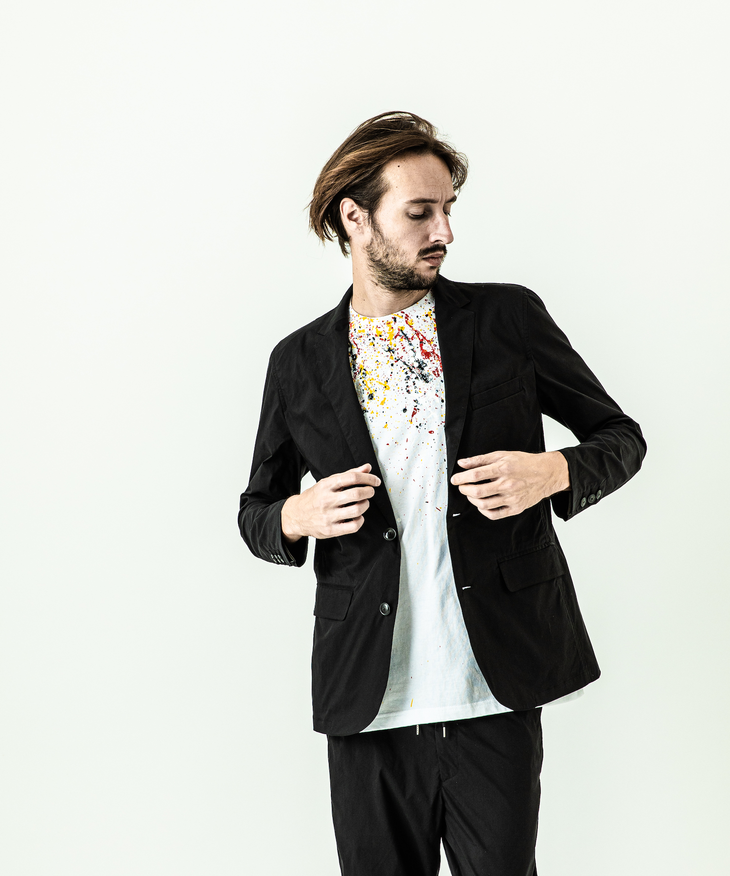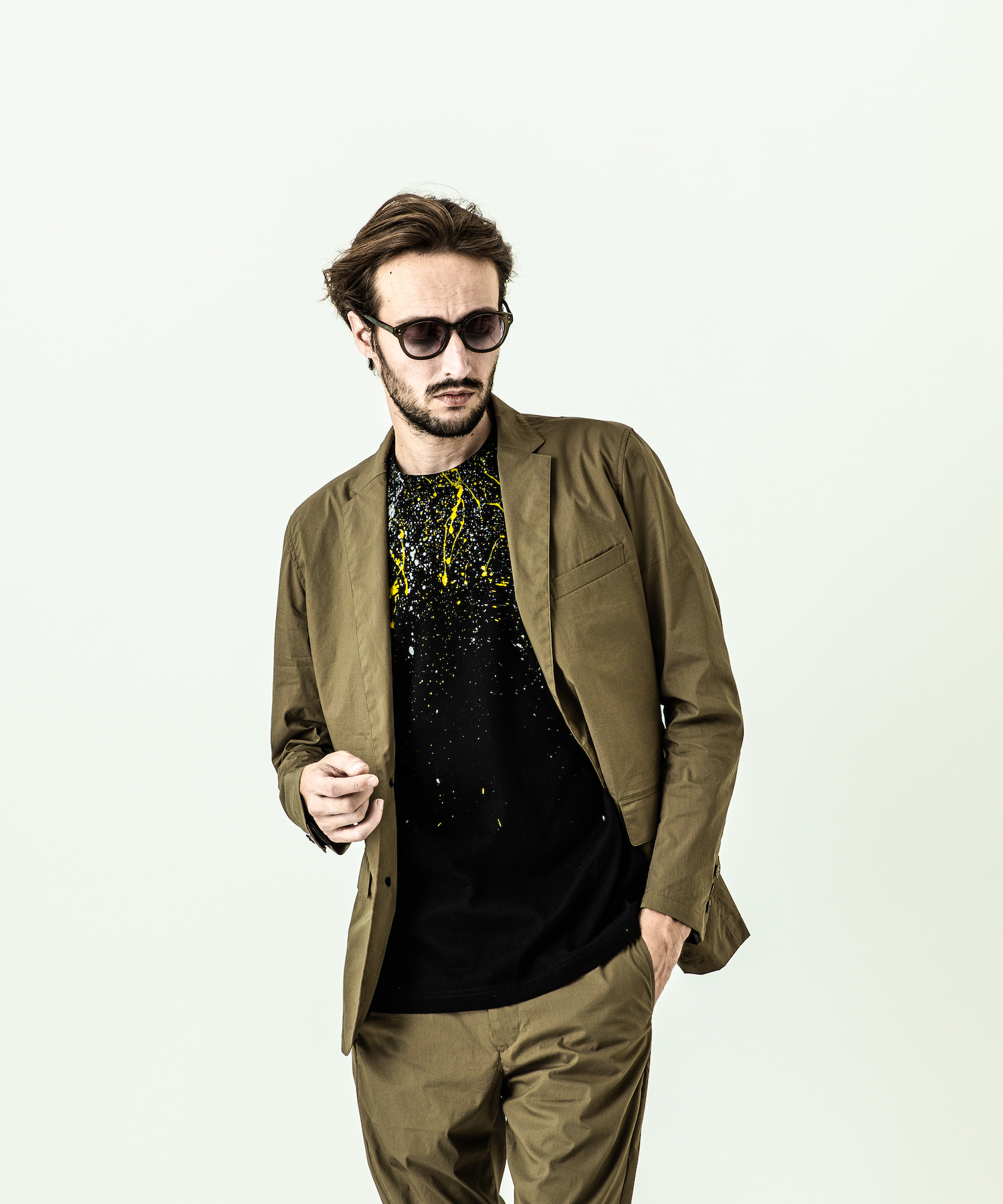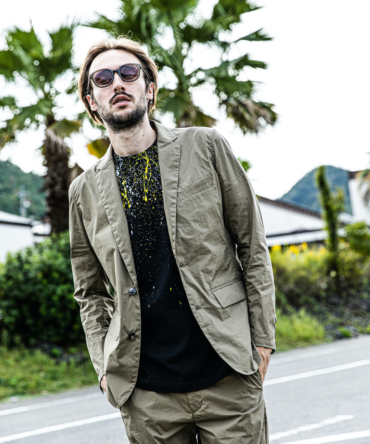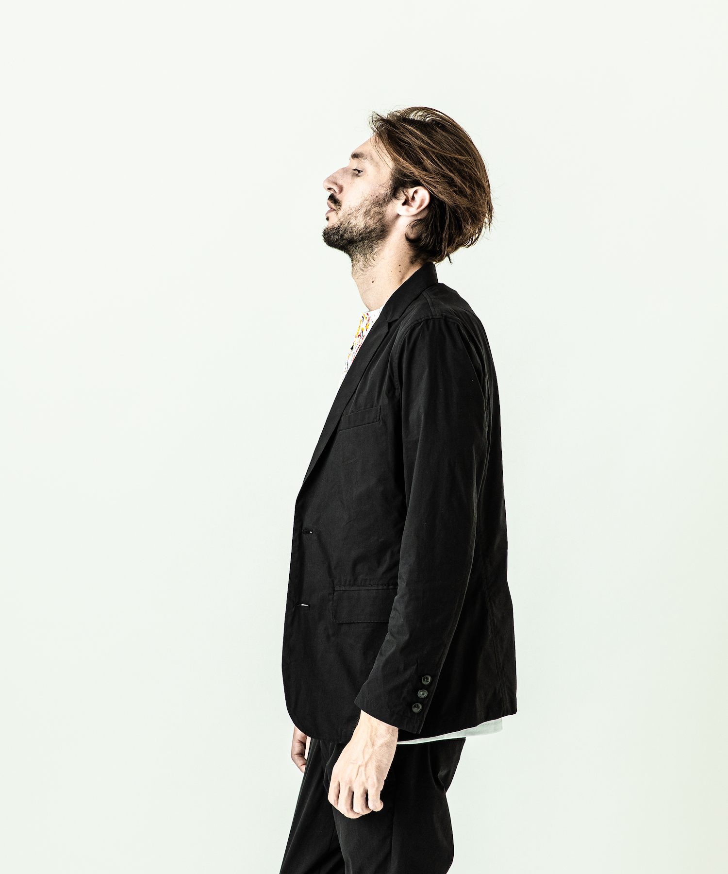 | spec | 一枚仕立てで、軽量なテーラードJKT。フロントは2B釦、袖は本明き仕様。裏側の縫い代始末にはパイピングテープを使用。上衿裏、袖口明きの内側にはラムレザーを配置。ストレッチ性を生かした、綺麗なタイトシルエット。 |