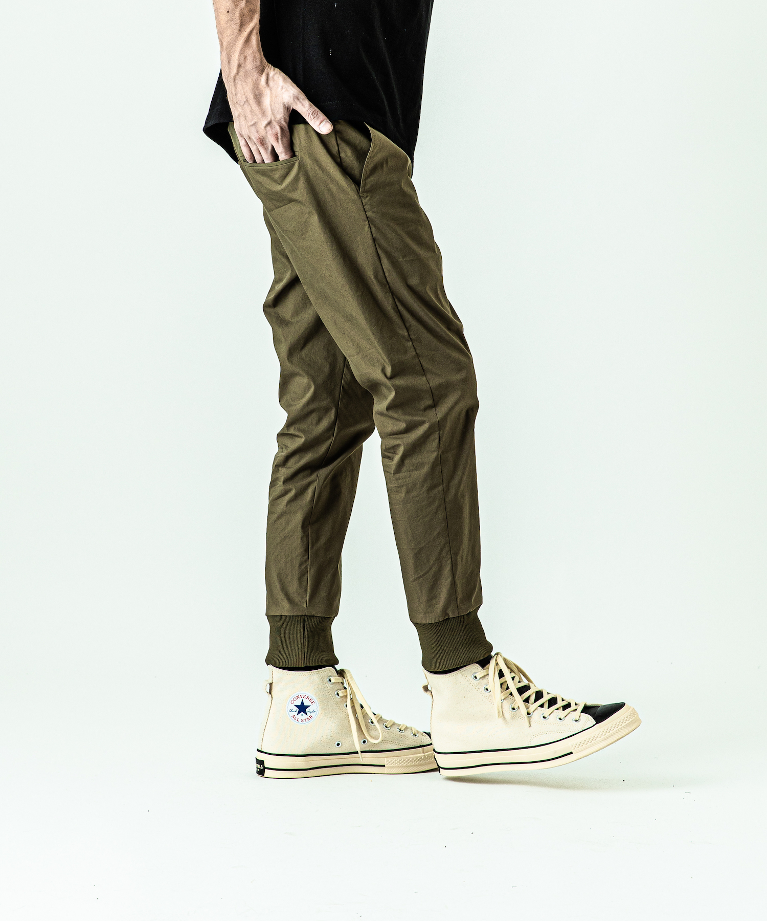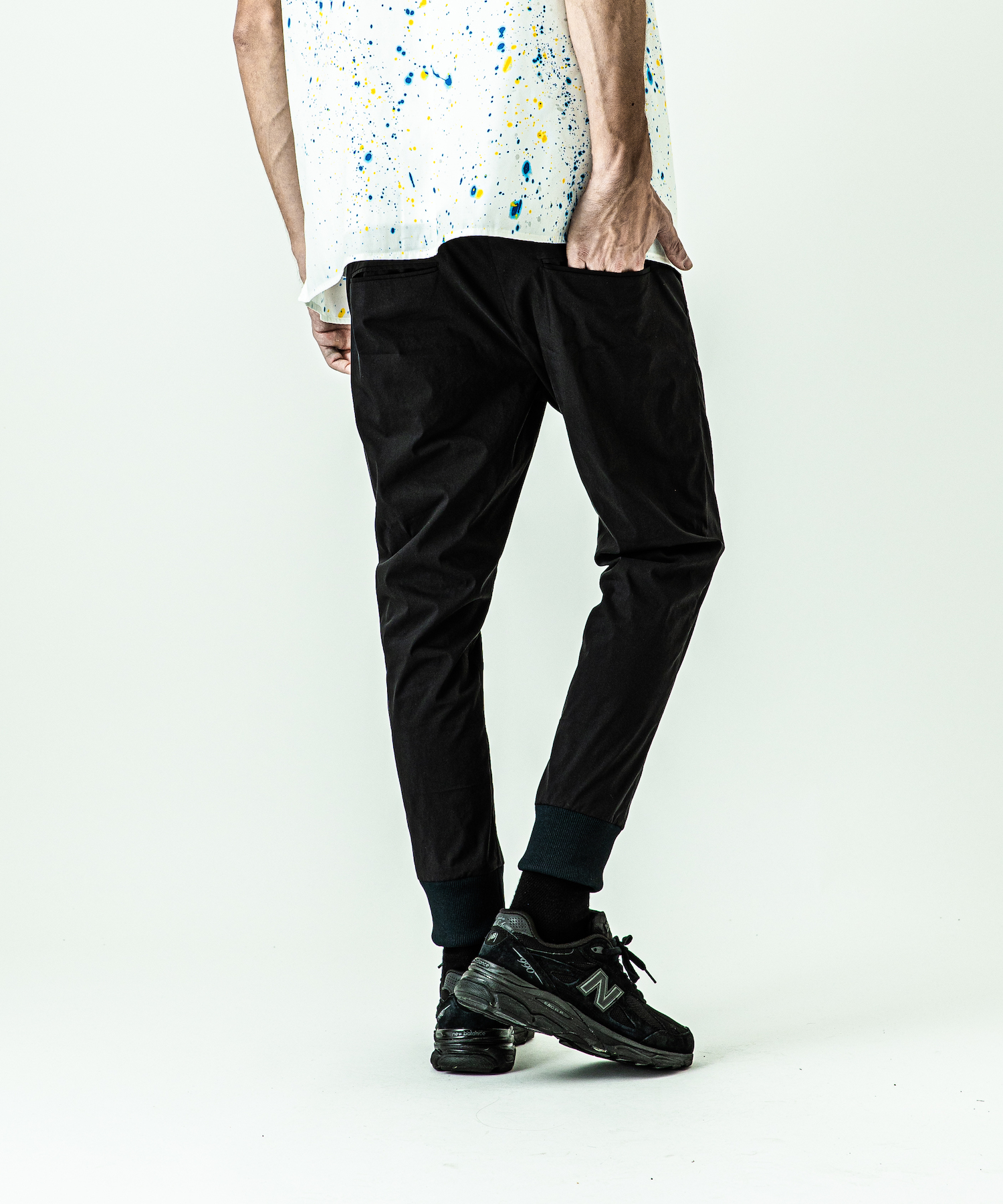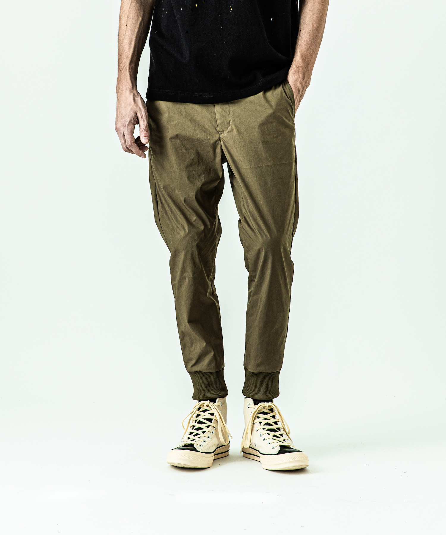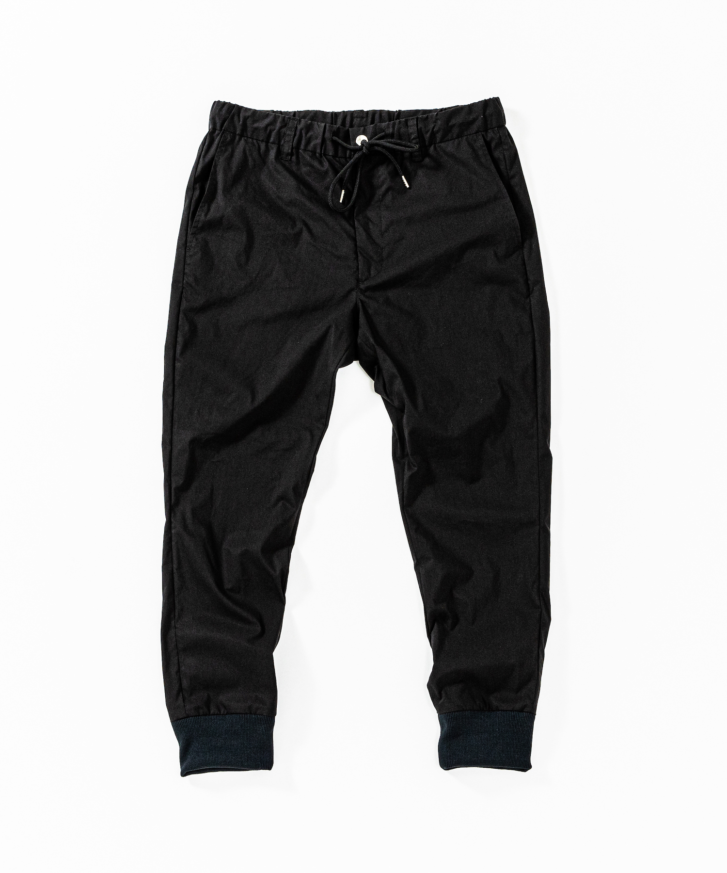 | spec | ウエストはベルトループ+ドローコード付きのイージー仕様。ワタリはややゆとりを持たせて、裾のリブまでストレッチ性を生かした、綺麗なタイトシルエットに仕上げている。裾には軽量なポリエステルリブを使用。 |