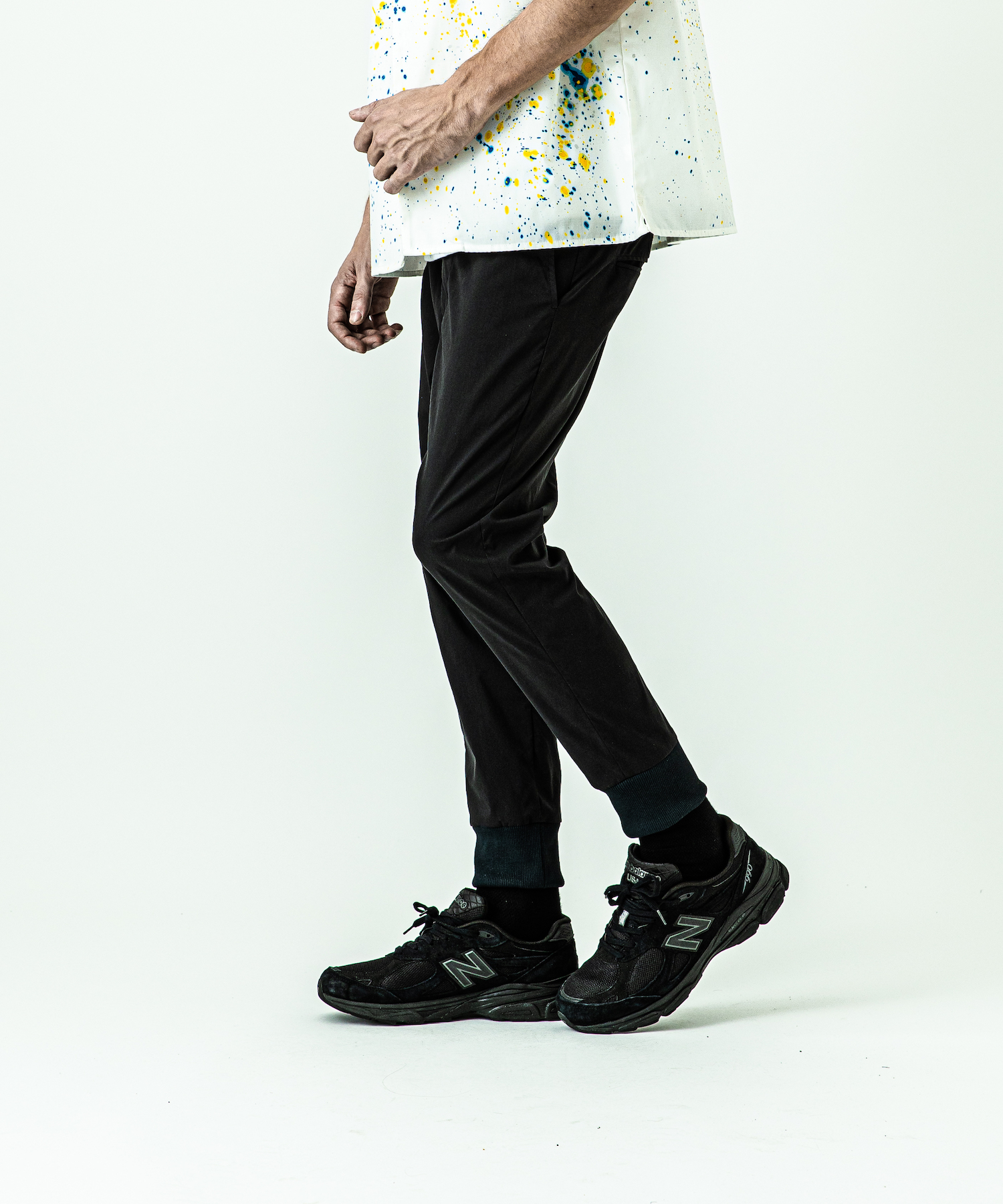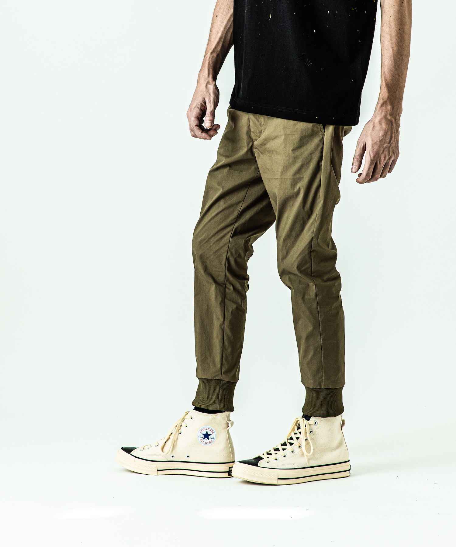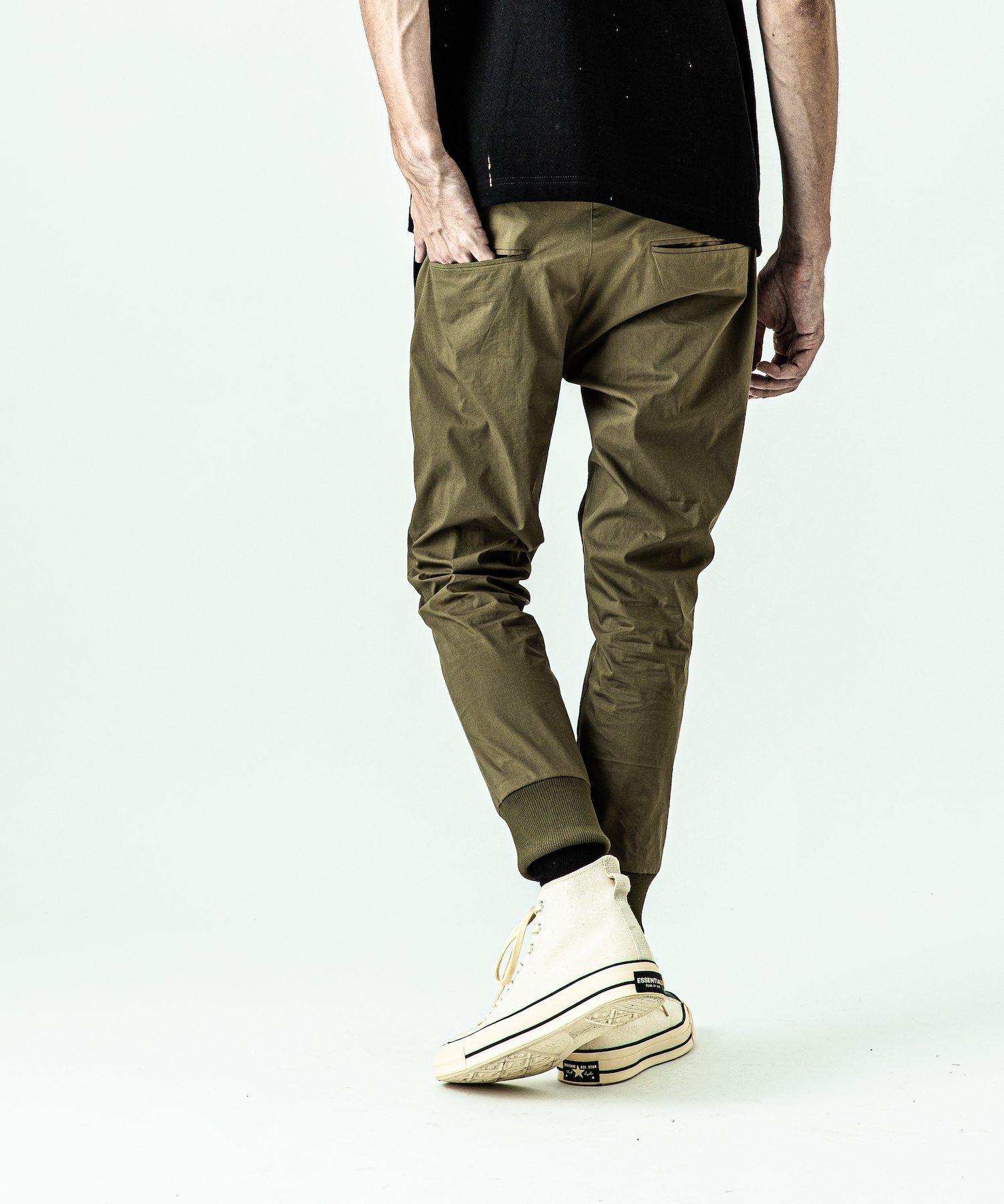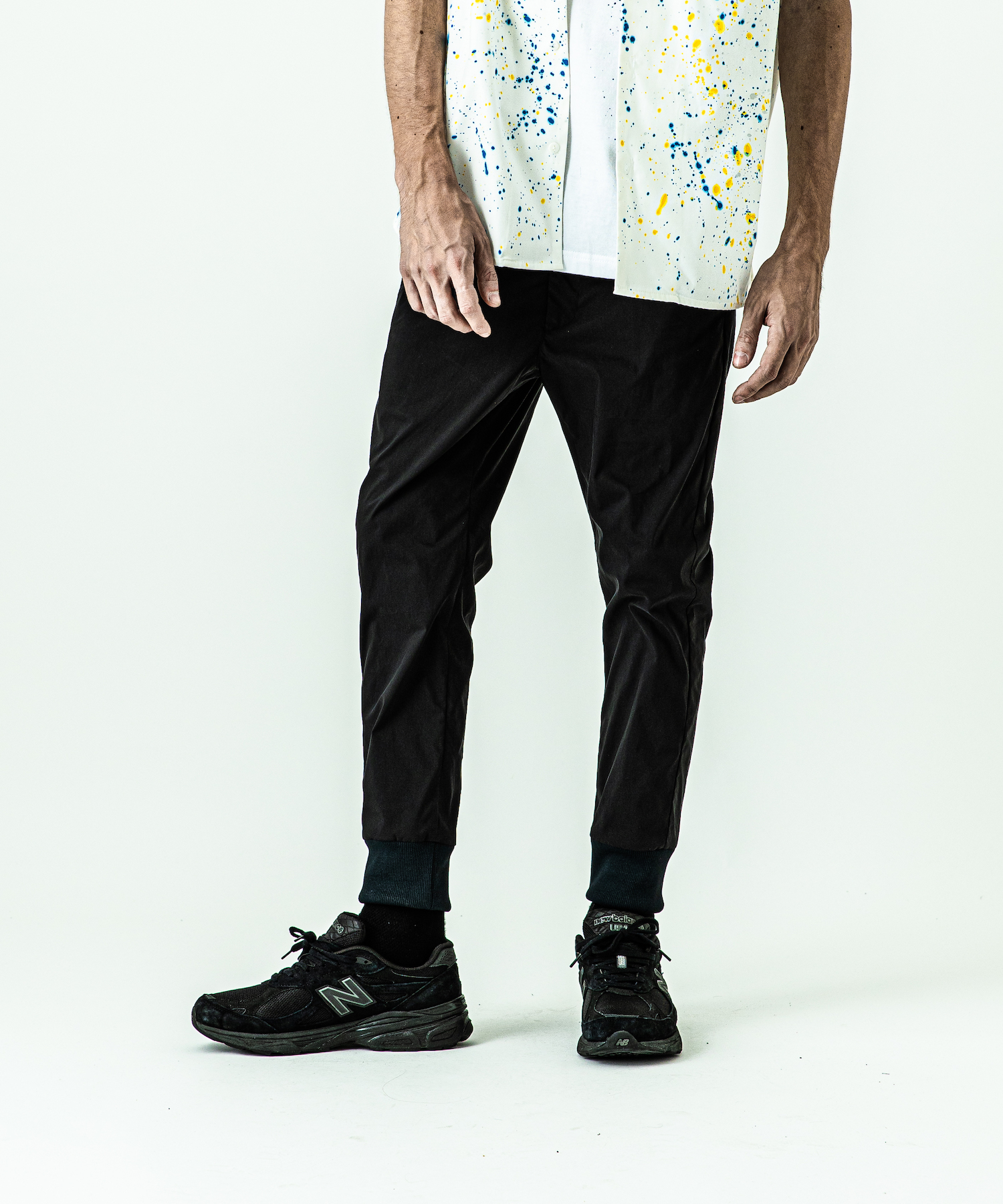 | spec | ウエストはベルトループ+ドローコード付きのイージー仕様。ワタリはややゆとりを持たせて、裾のリブまでストレッチ性を生かした、綺麗なタイトシルエットに仕上げている。裾には軽量なポリエステルリブを使用。 |