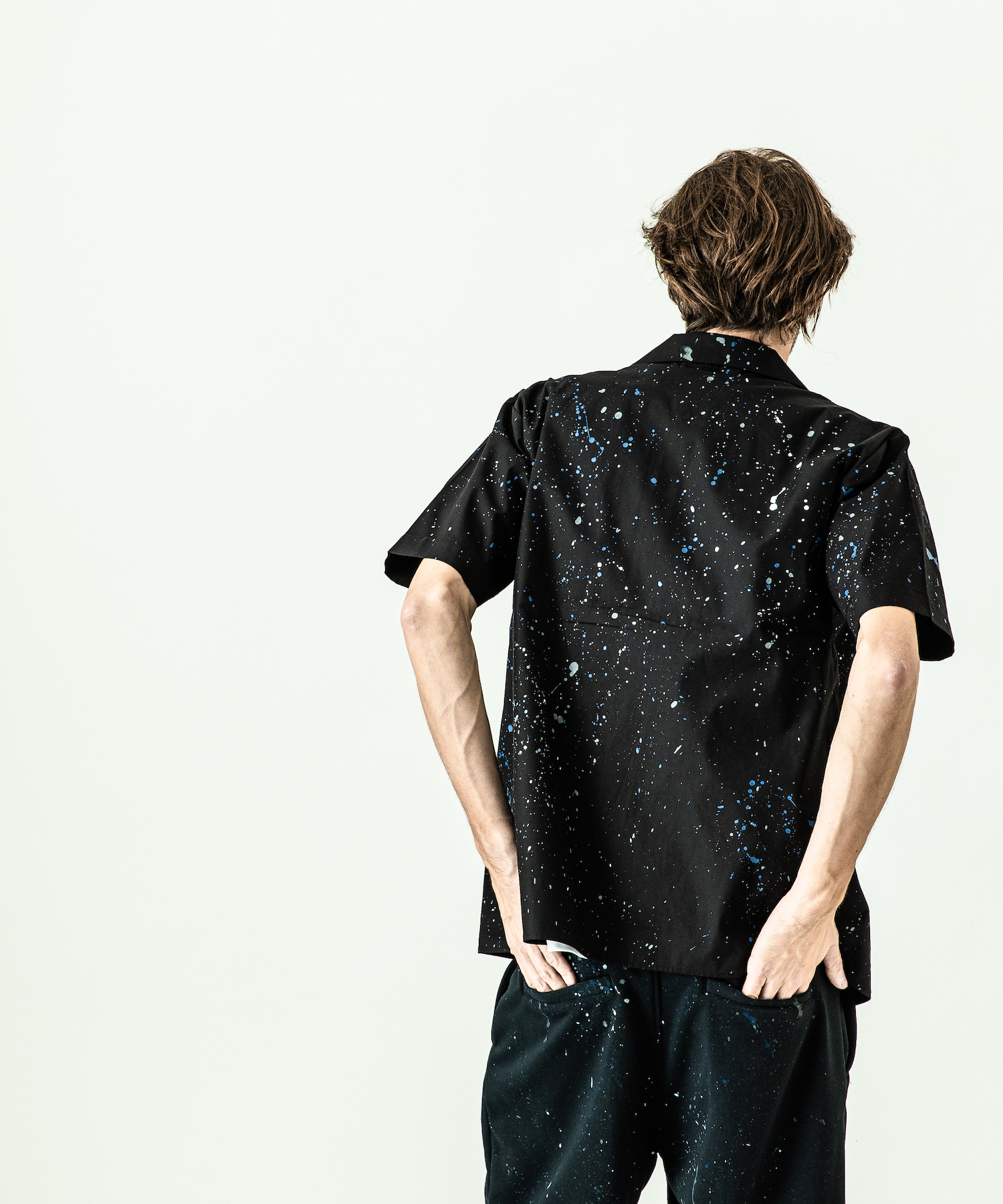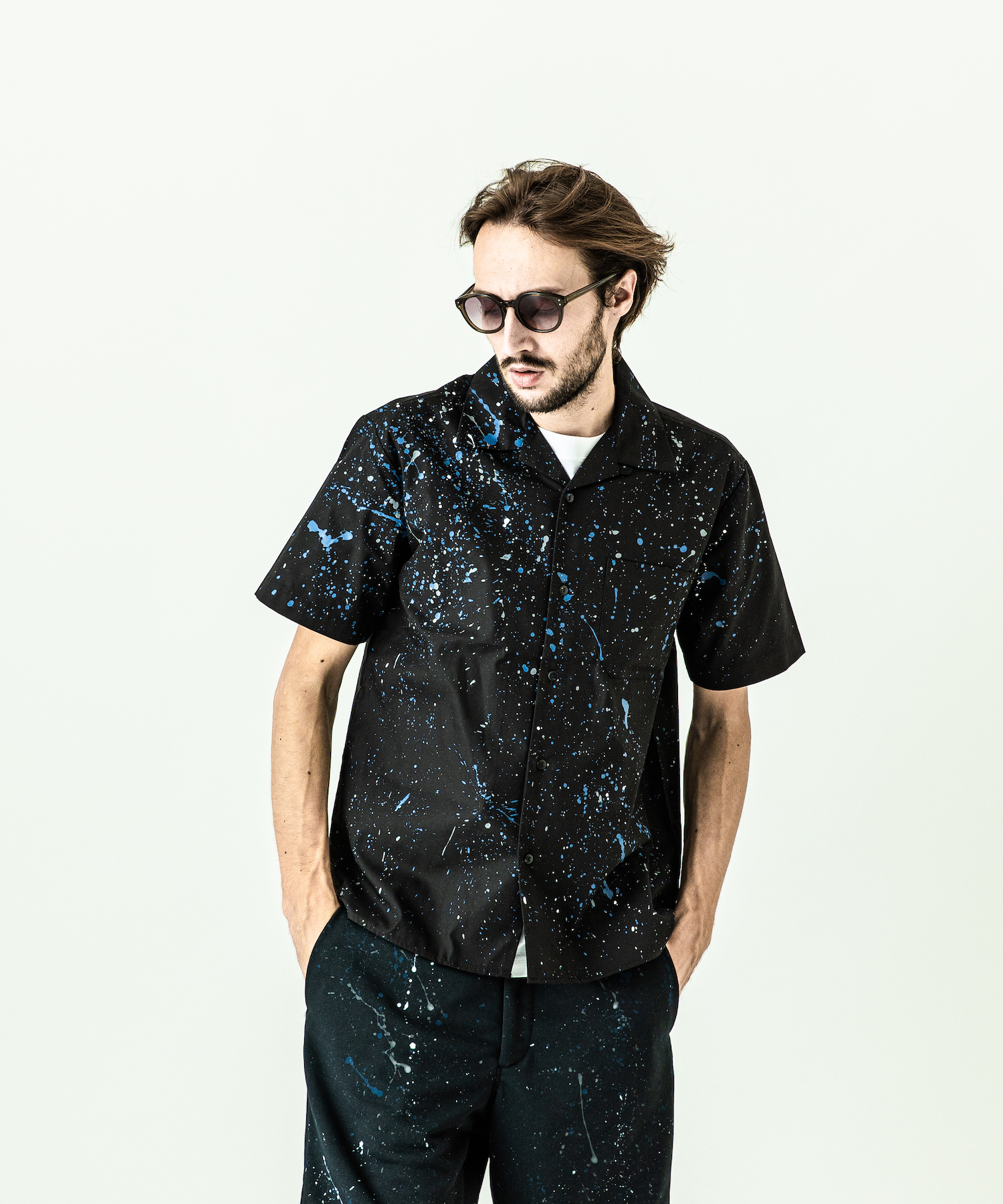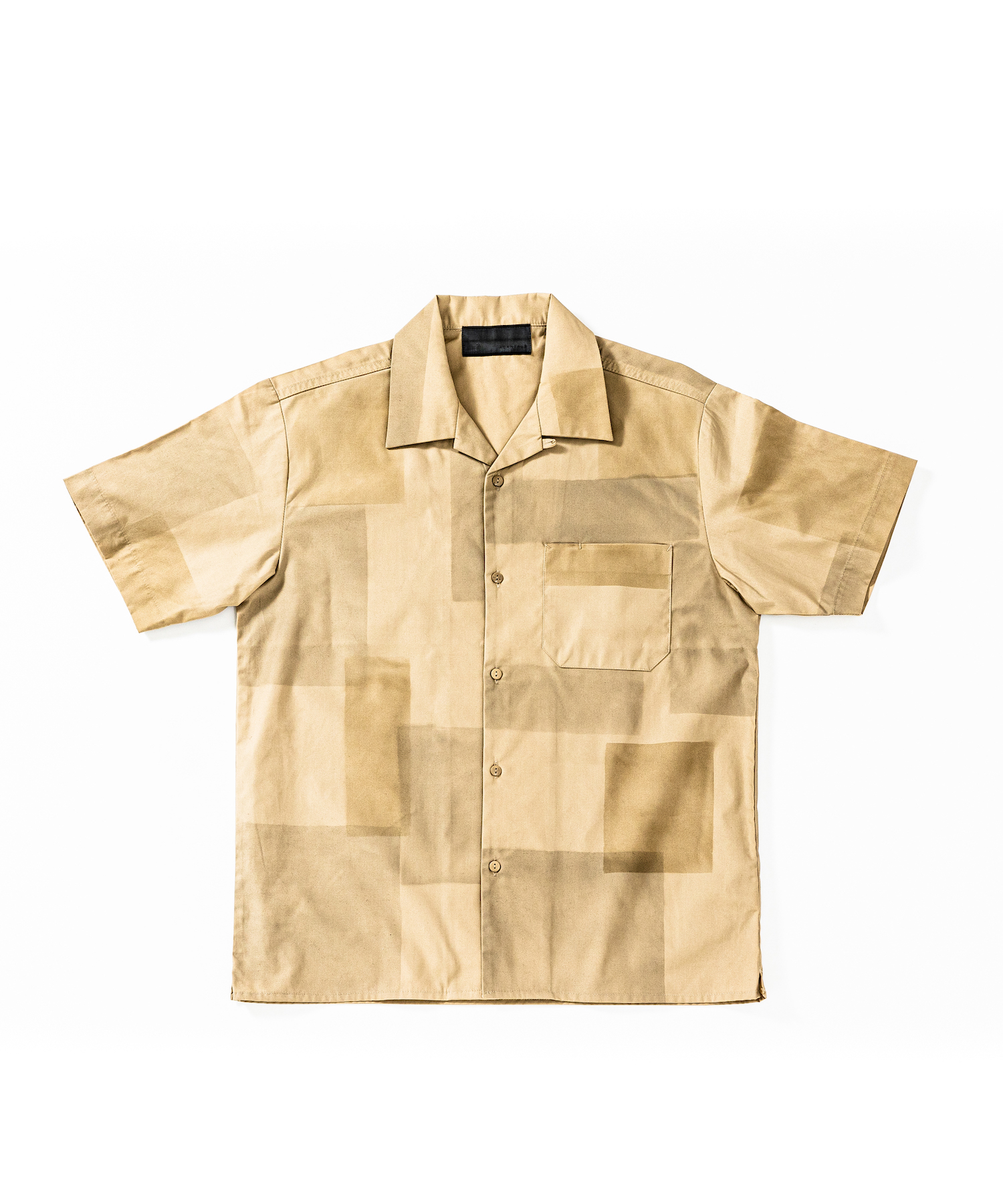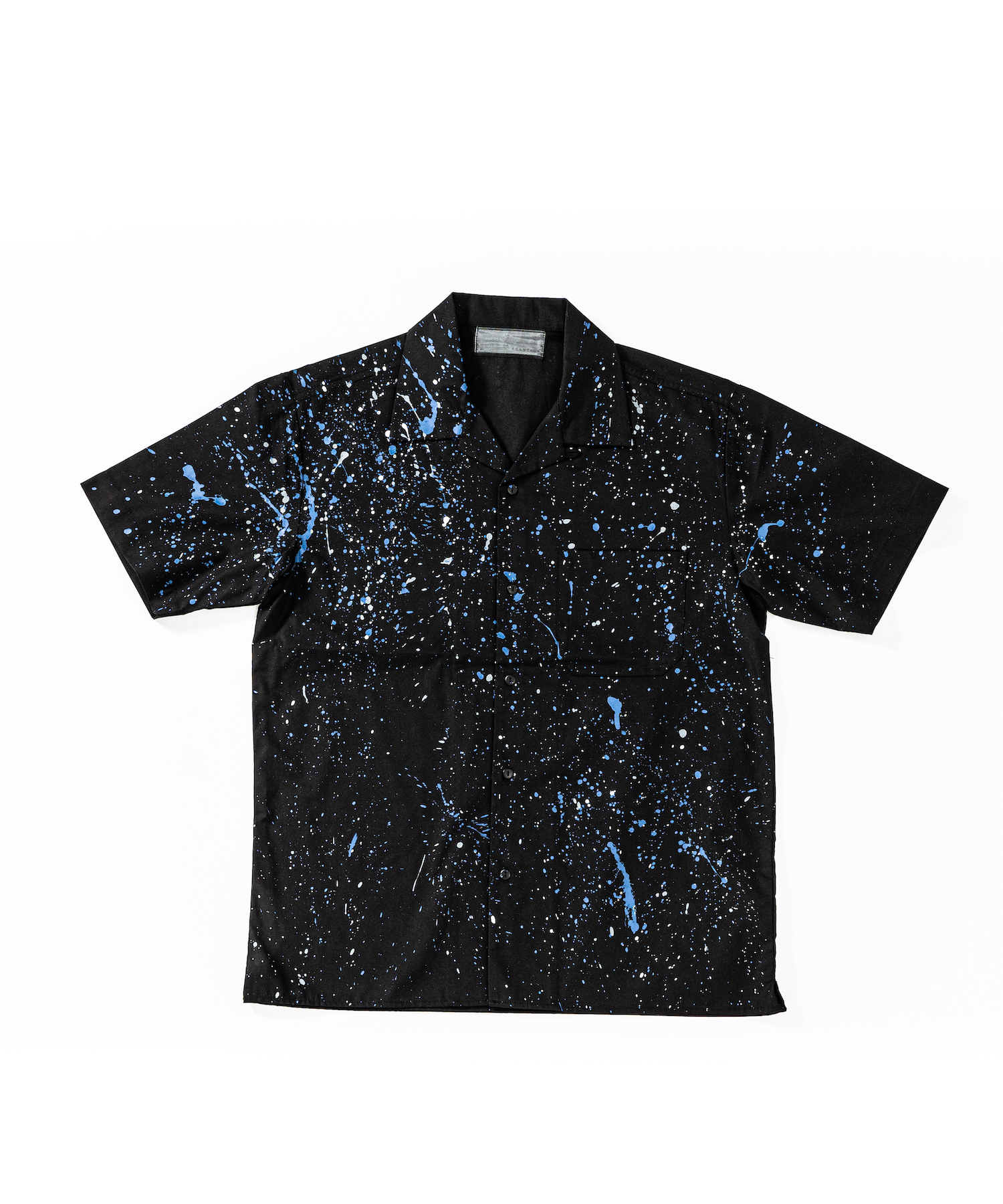 | spec | ゆったりとしたシルエットのオープンカラーシャツ。右ポケットにはペン刺し用のカンヌキを施したワーク仕様。手作業によるスプラッシュペイント(WHITE BLACK)、パッチワークプリント(BEIGE)を全体に施している為、1点1点表情の異なる特別な1枚となる。 |