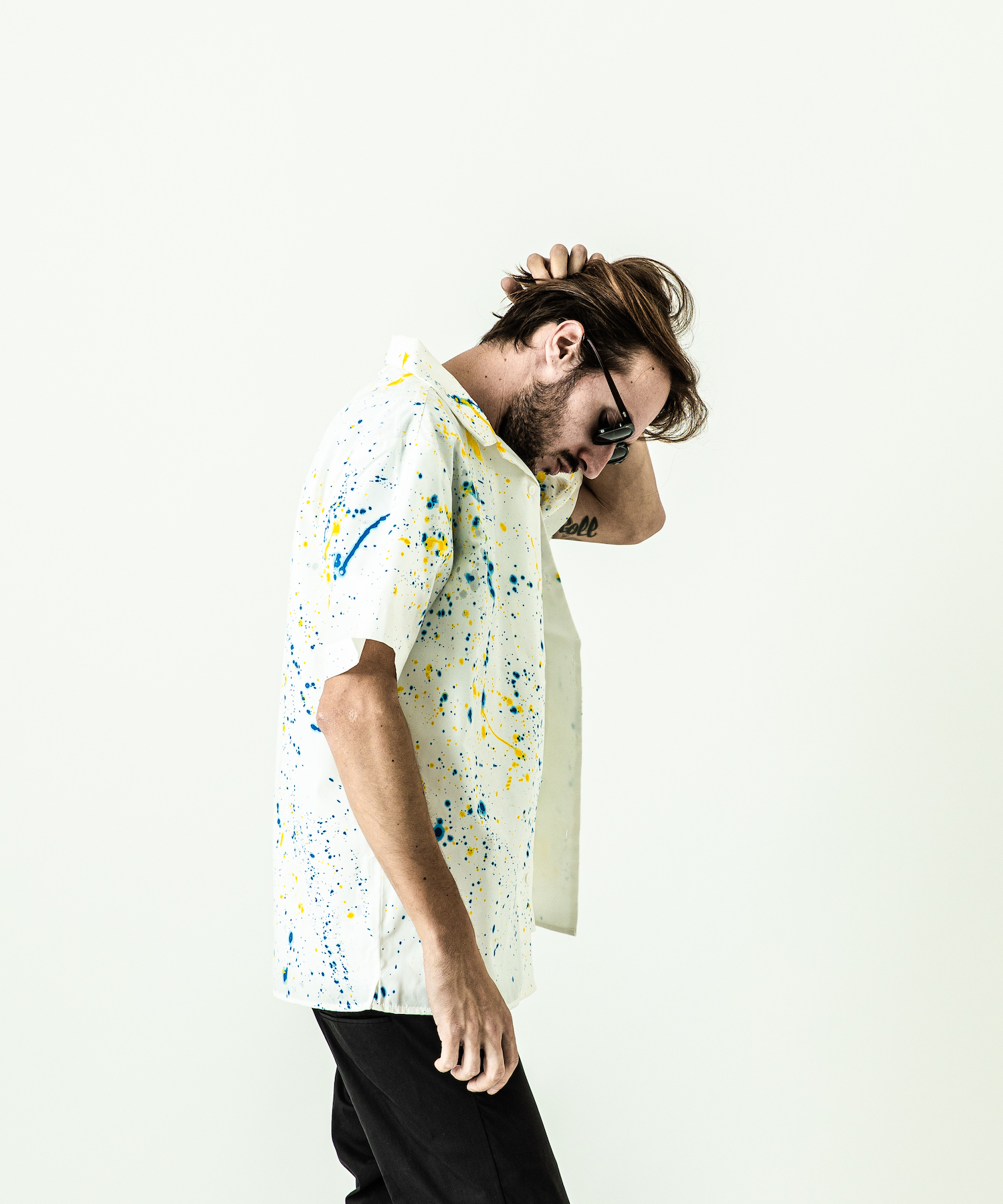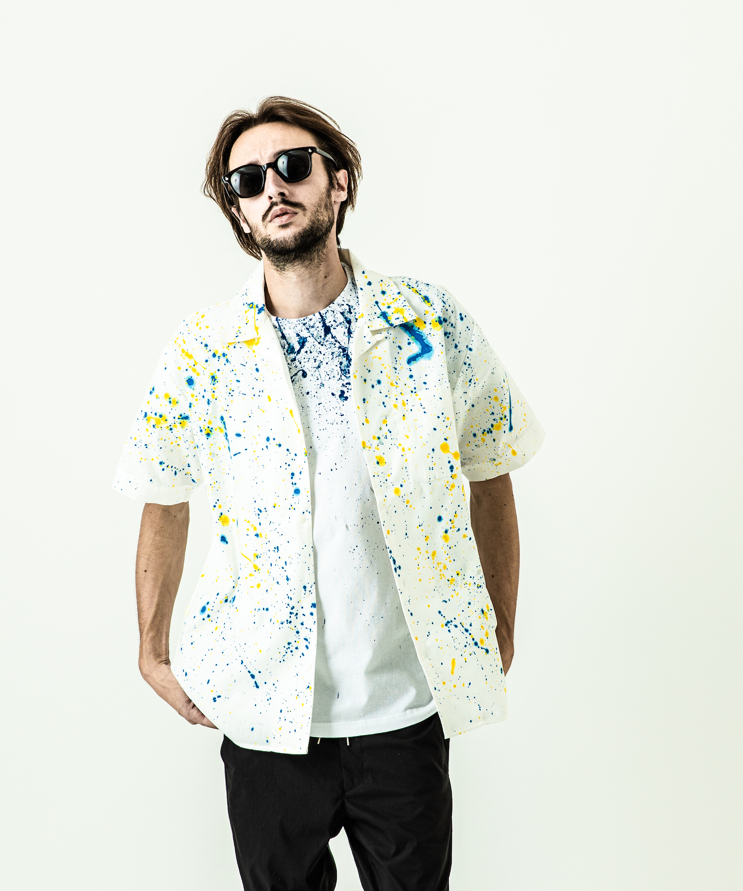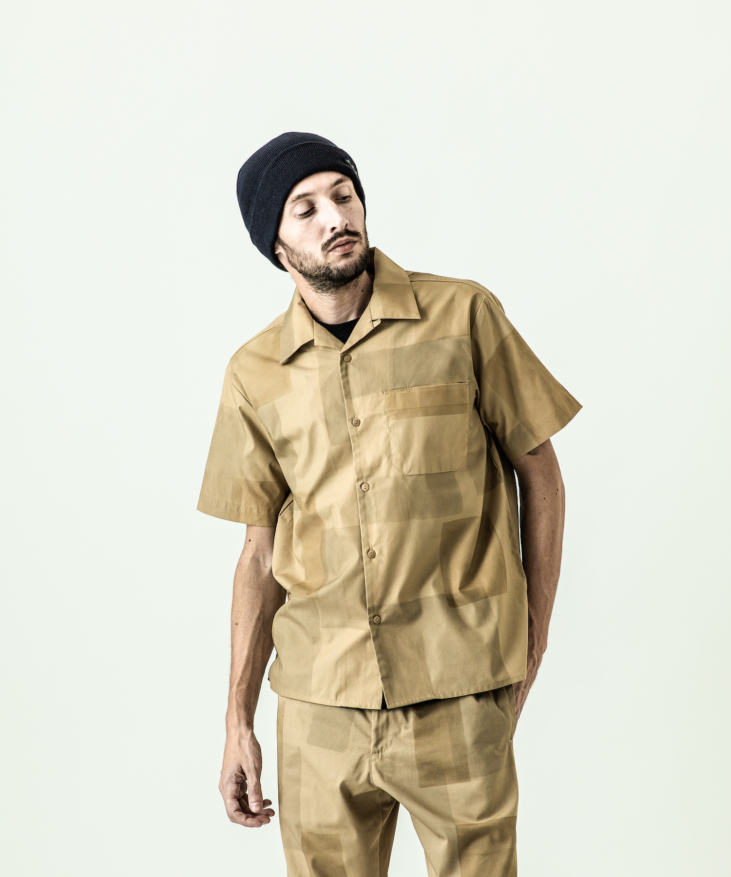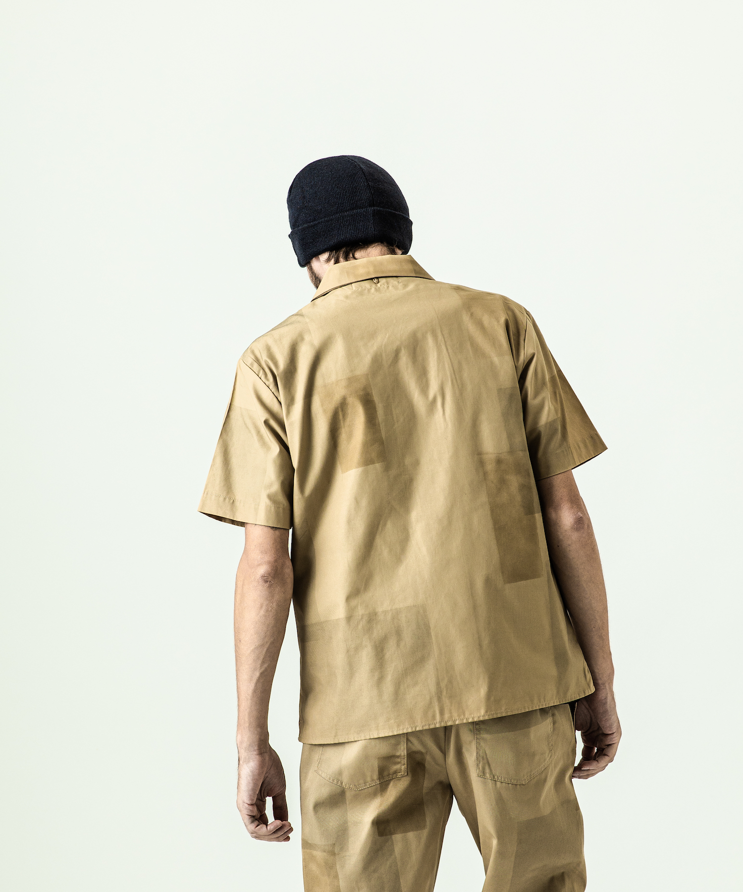 | spec | ゆったりとしたシルエットのオープンカラーシャツ。右ポケットにはペン刺し用のカンヌキを施したワーク仕様。手作業によるスプラッシュペイント(WHITE BLACK)、パッチワークプリント(BEIGE)を全体に施している為、1点1点表情の異なる特別な1枚となる。 |