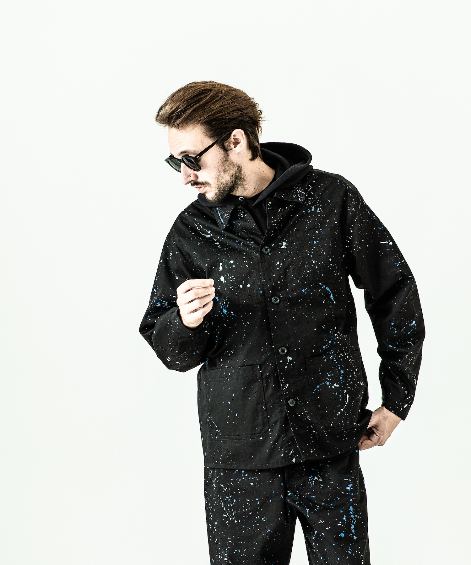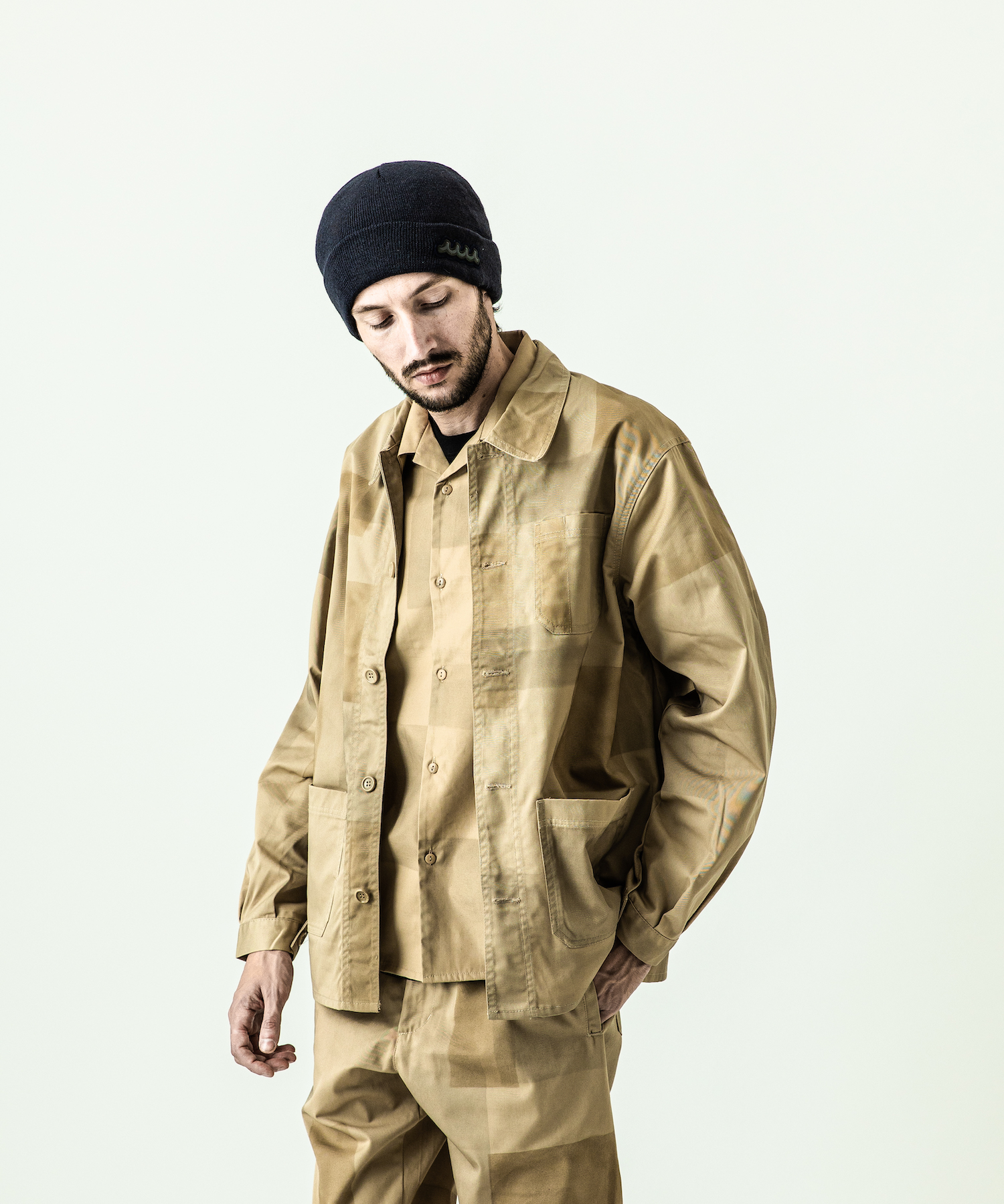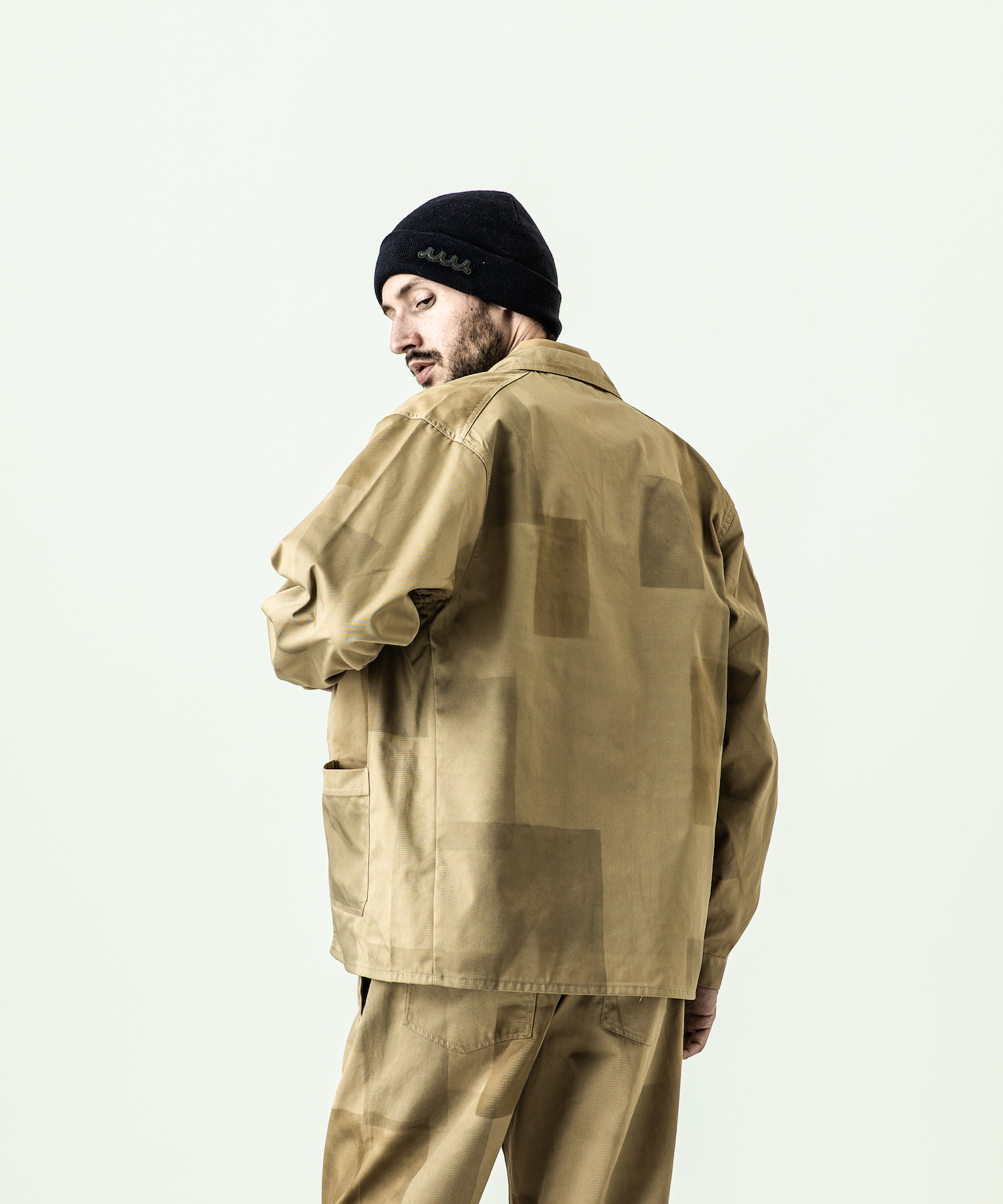 | spec | ゆったりとしたシルエットのカバーオールジャケット。フロントには使い勝手の良い3ポケット仕様で、右胸ポケットにはペン刺し用のカンヌキを施したワーク仕様。手作業によるスプラッシュペイント(BLACK)、パッチワークプリント(BEIGE)を全体に施している為、1点1点表情の異なる特別な1枚となる。 |