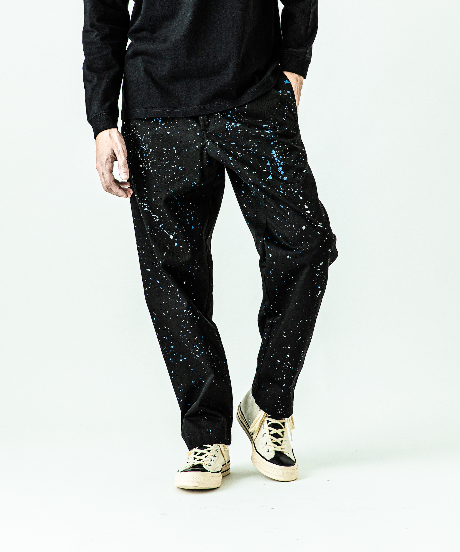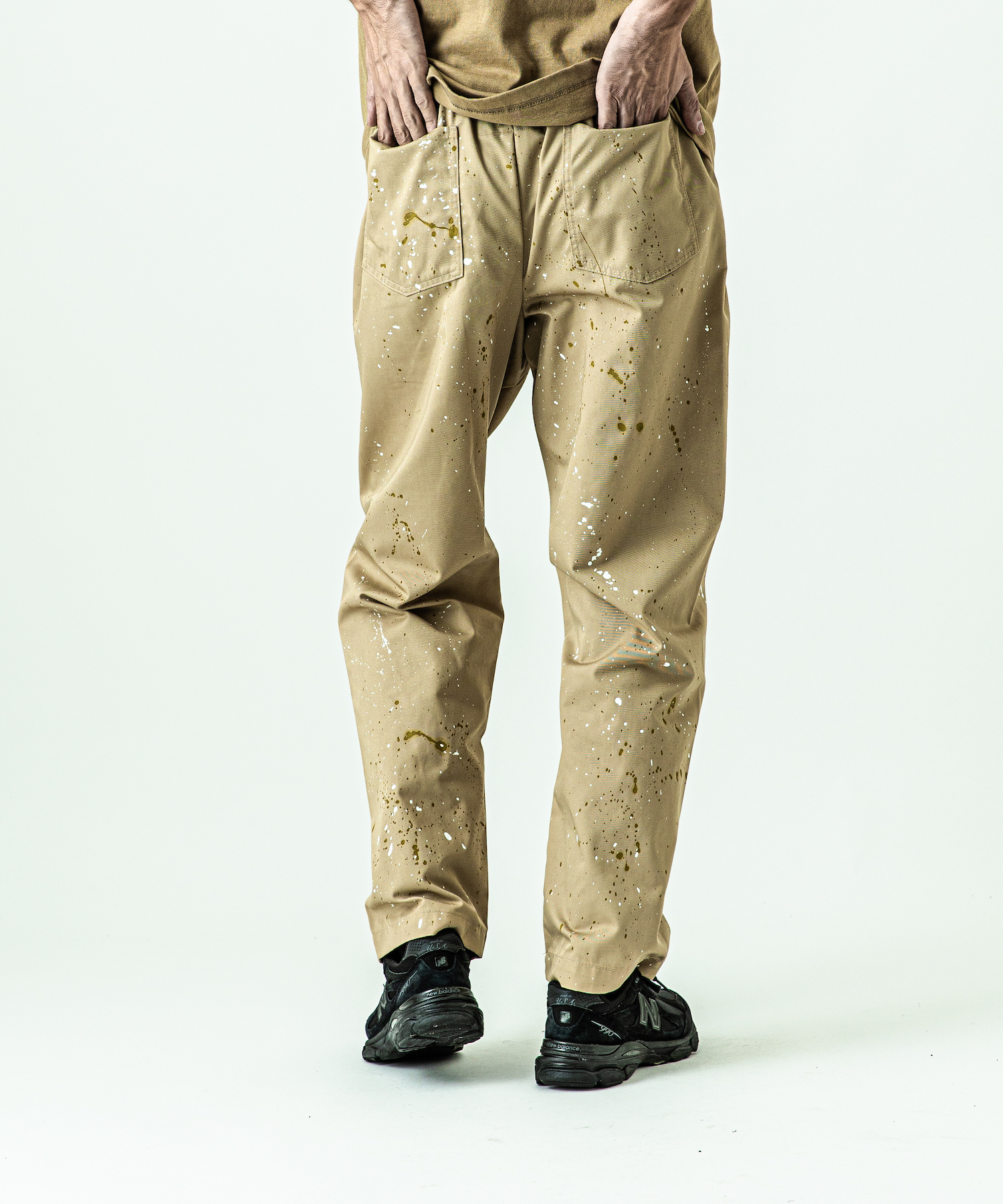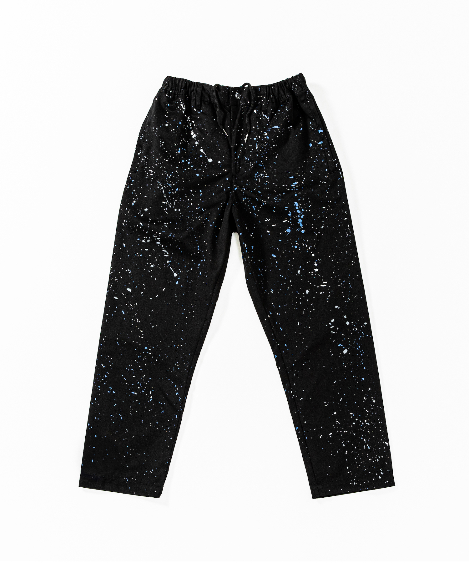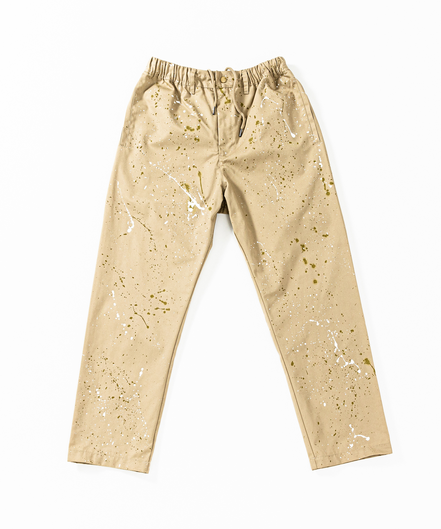 | spec | ゆったりとしたシルエットのイージーパンツ。ウエストはベルトループ+ゴム&ドローコード付きで様々な履き方が可能。ドットボタンとファスナー明き仕様。手作業によるスプラッシュペイント(BLACK BEIGE)、パッチワークプリント(BEIGE)を全体に施している為、1点1点表情の異なる特別な1枚となる。 |
