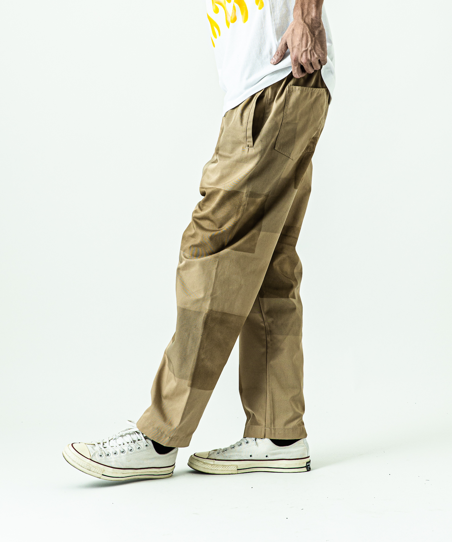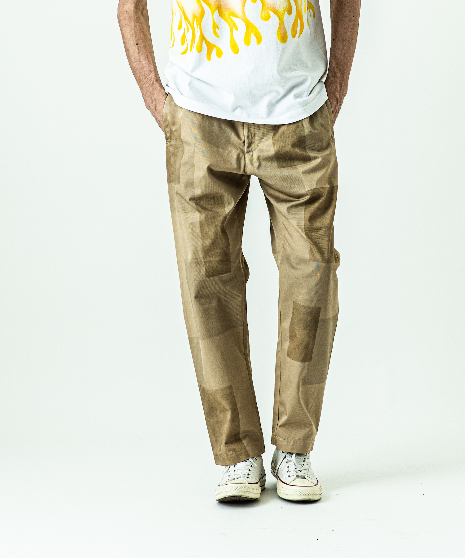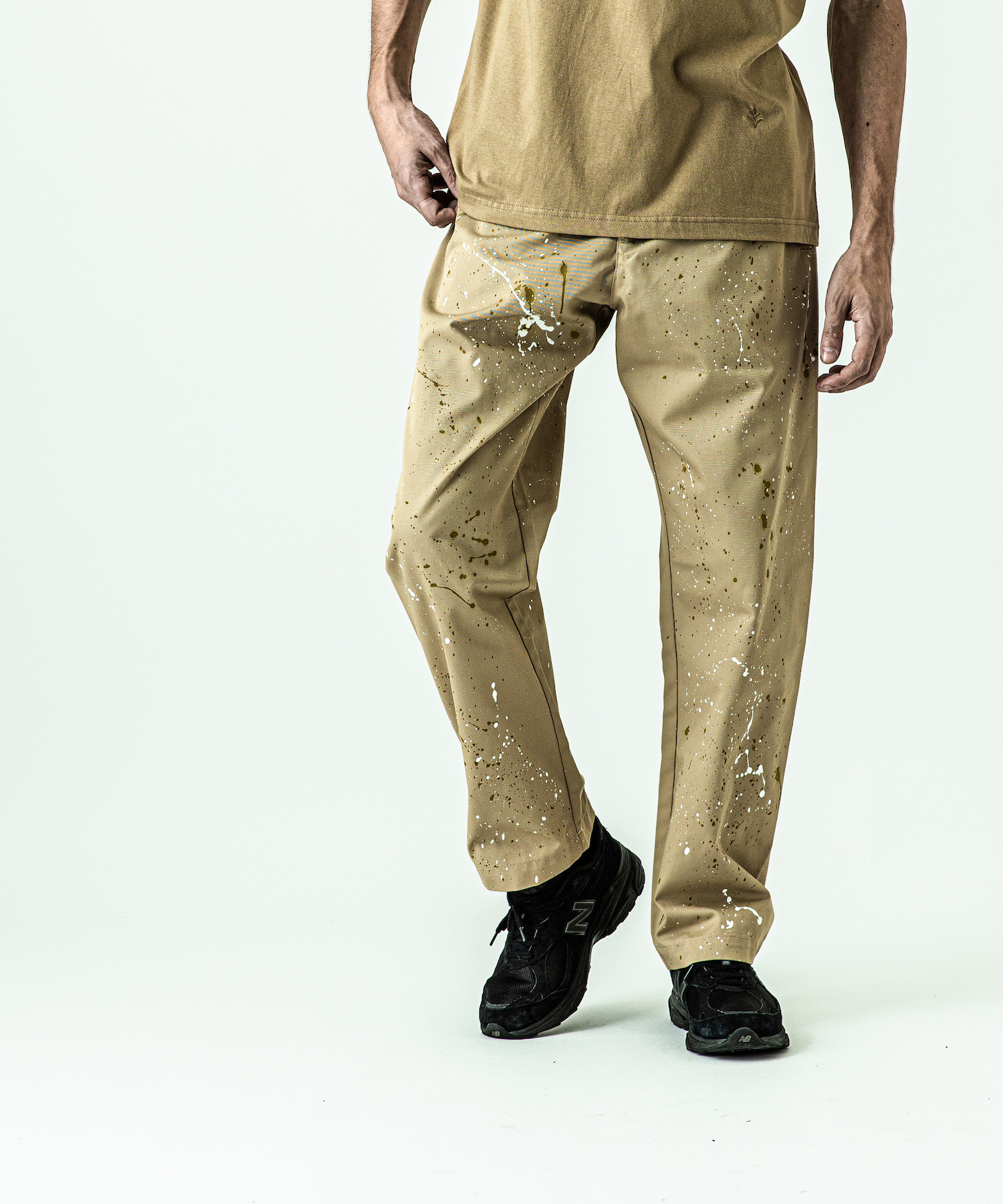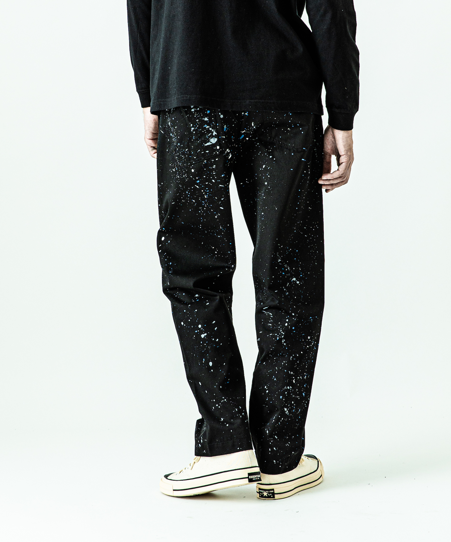 | spec | ゆったりとしたシルエットのイージーパンツ。ウエストはベルトループ+ゴム&ドローコード付きで様々な履き方が可能。ドットボタンとファスナー明き仕様。手作業によるスプラッシュペイント(BLACK BEIGE)、パッチワークプリント(BEIGE)を全体に施している為、1点1点表情の異なる特別な1枚となる。 |