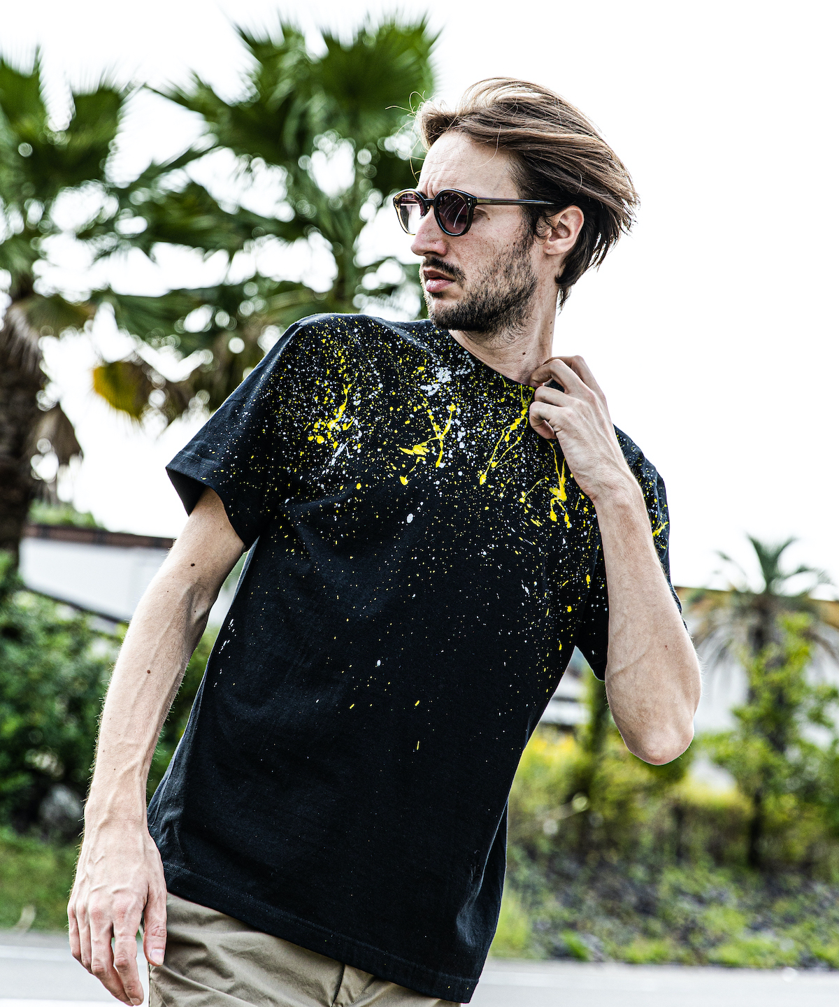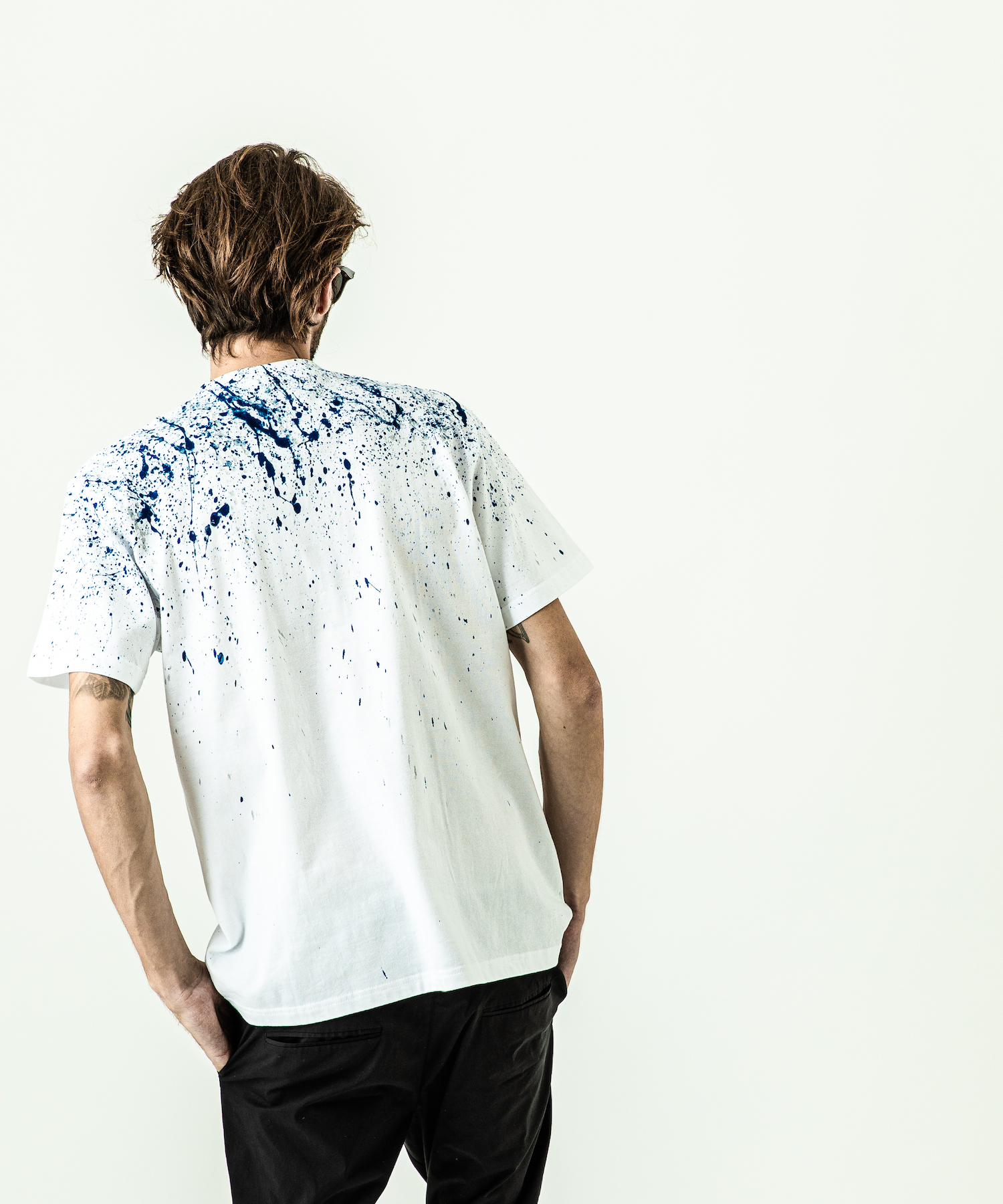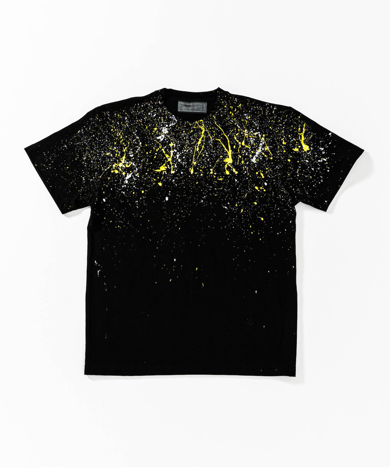 | spec | 首フライスは2本針縫製、丸胴に編み立てた身頃を使用したベーシックなシルエットのTシャツ。左脇にはブランド名であるACANTHUS(地中海地方産ハアザミ 属植物)の形をモチーフにしたアイコンを生地同色にて刺繍。首元から降り注ぐようなスプラッシュペイントを手作業にて施している為、1点1点表情の異なる特別な1枚となる。 |
