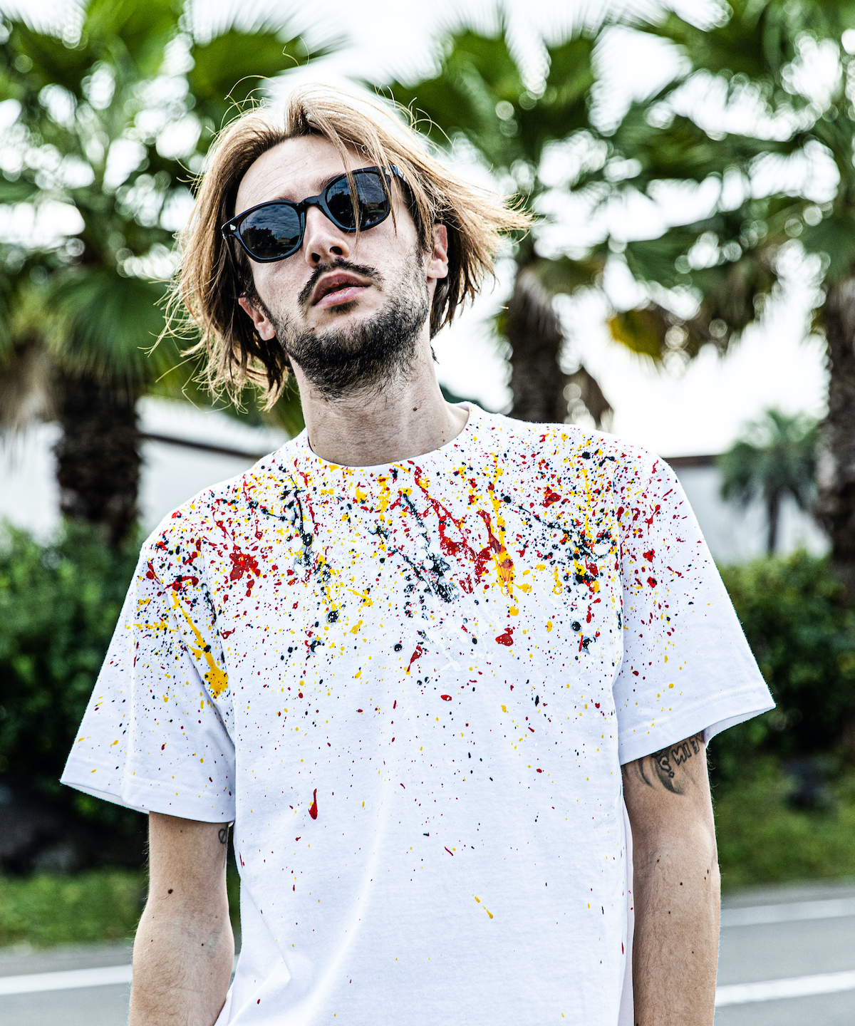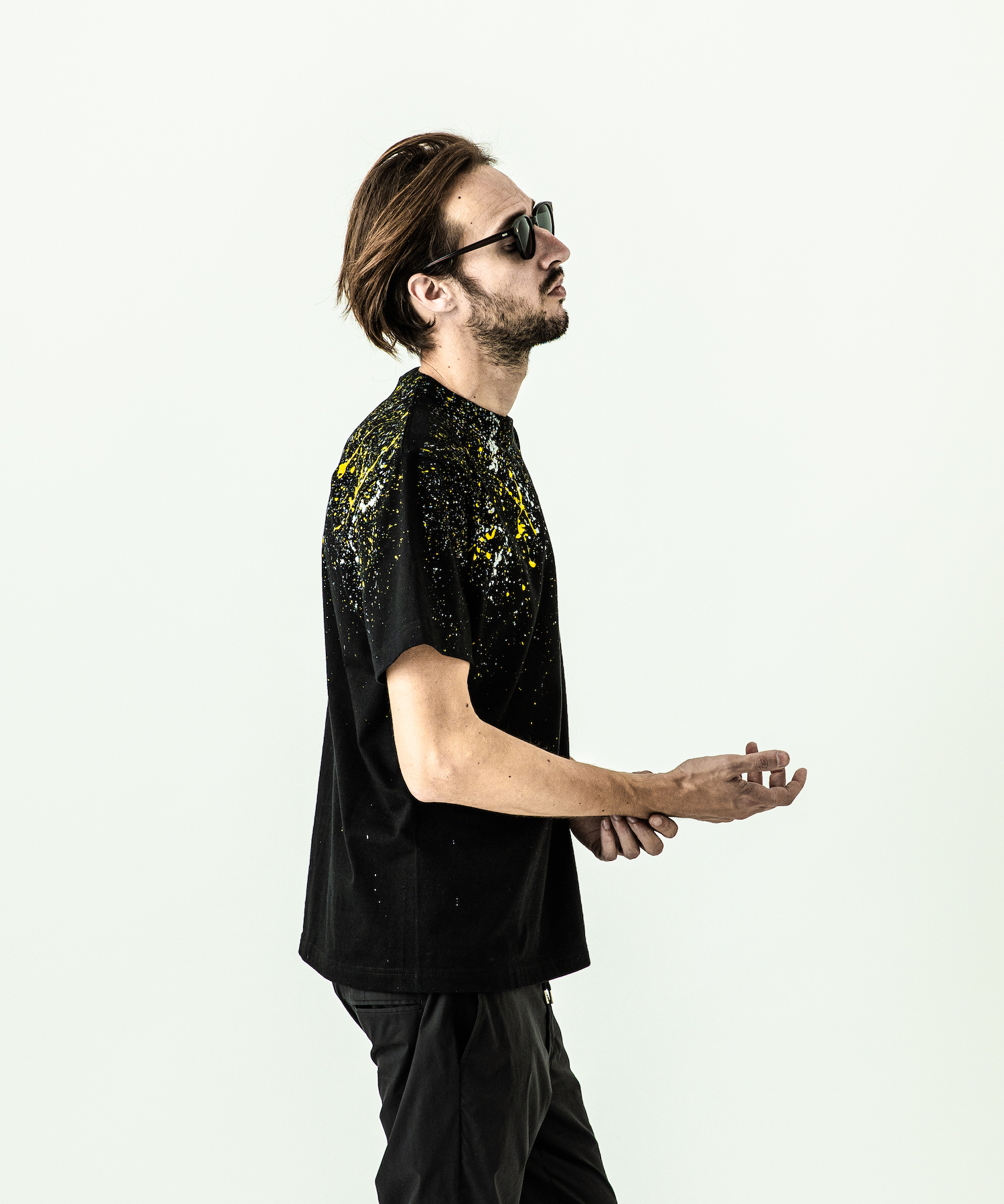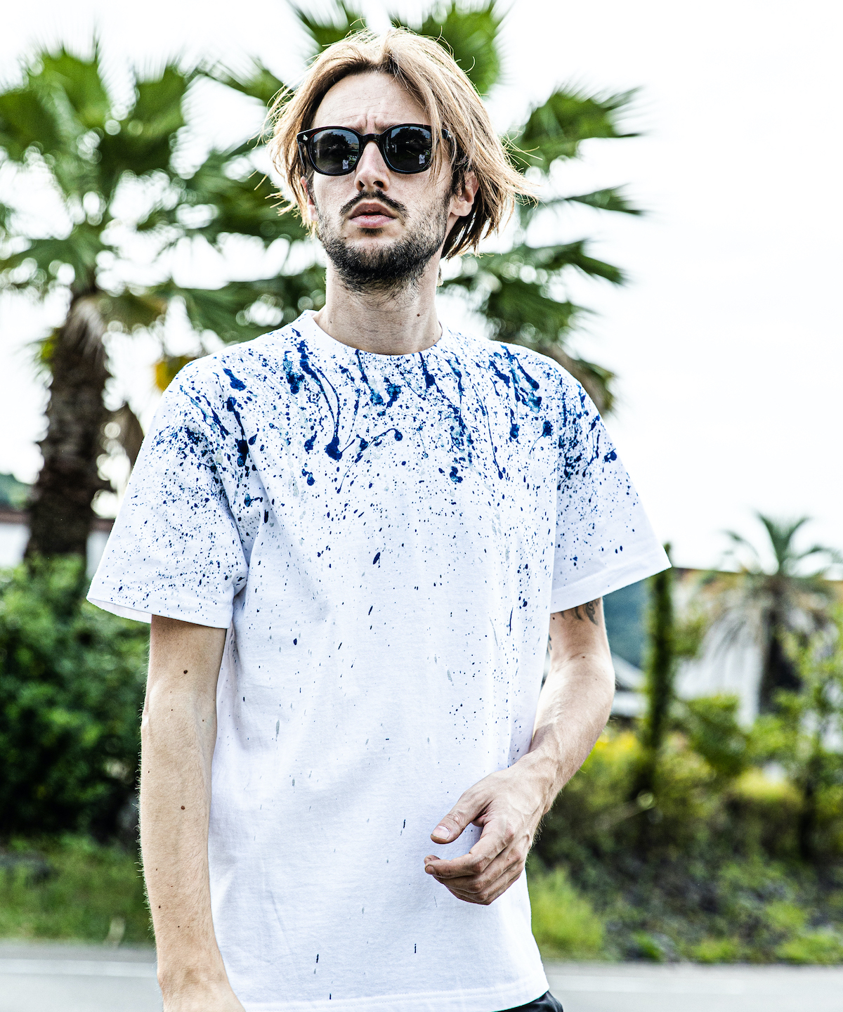 | spec | 首フライスは2本針縫製、丸胴に編み立てた身頃を使用したベーシックなシルエットのTシャツ。左脇にはブランド名であるACANTHUS(地中海地方産ハアザミ 属植物)の形をモチーフにしたアイコンを生地同色にて刺繍。首元から降り注ぐようなスプラッシュペイントを手作業にて施している為、1点1点表情の異なる特別な1枚となる。 |