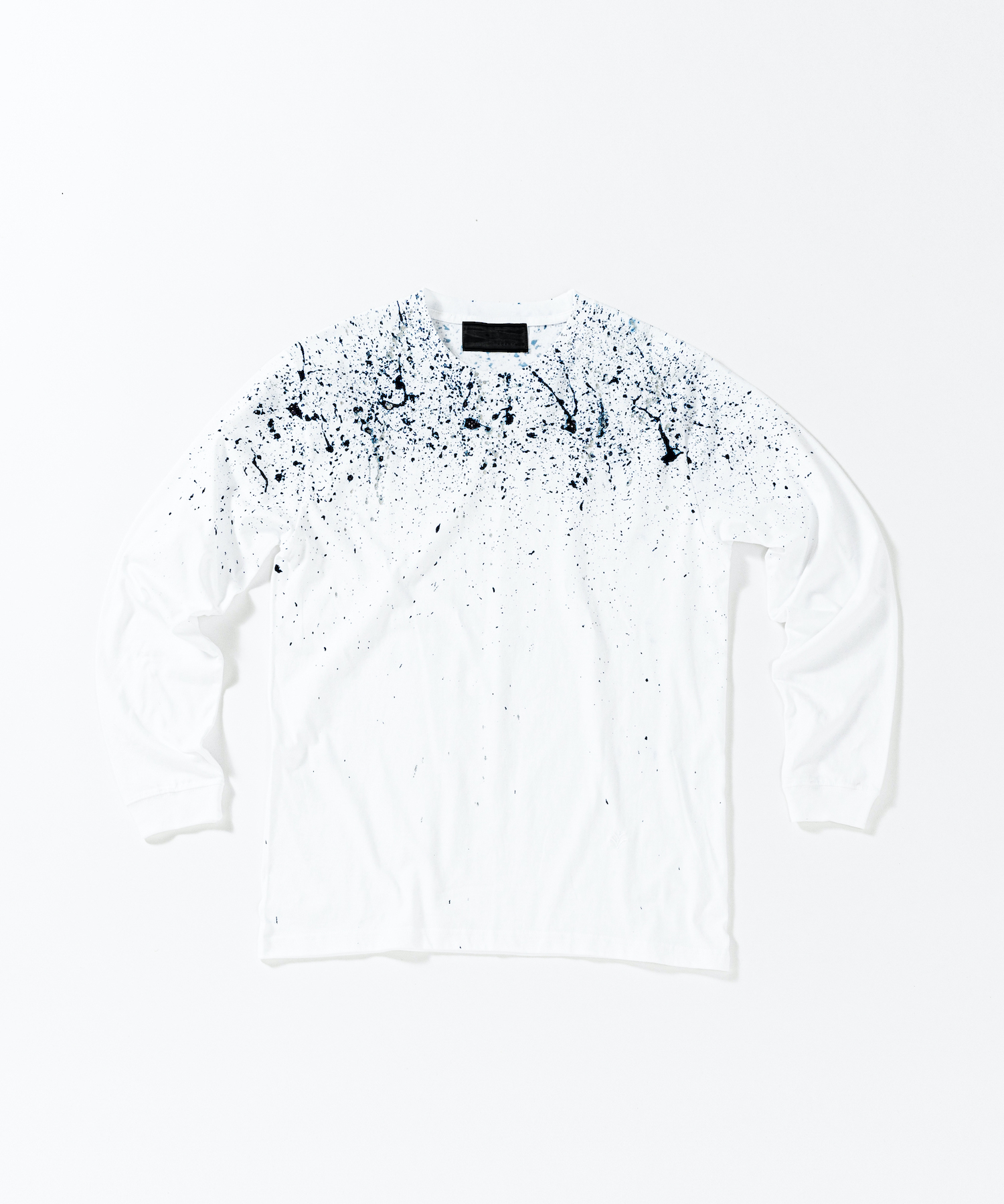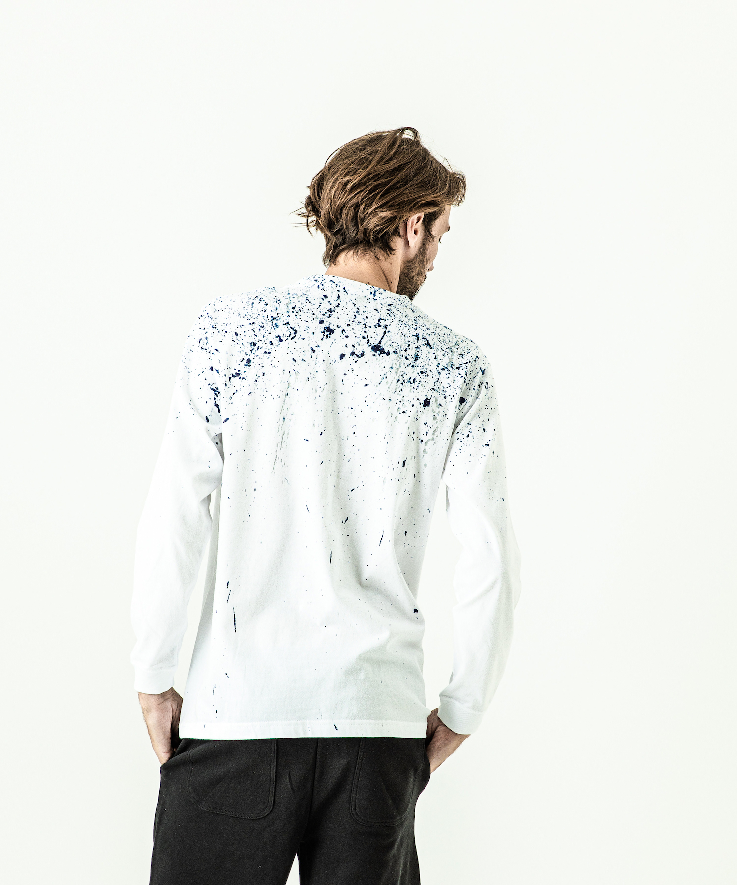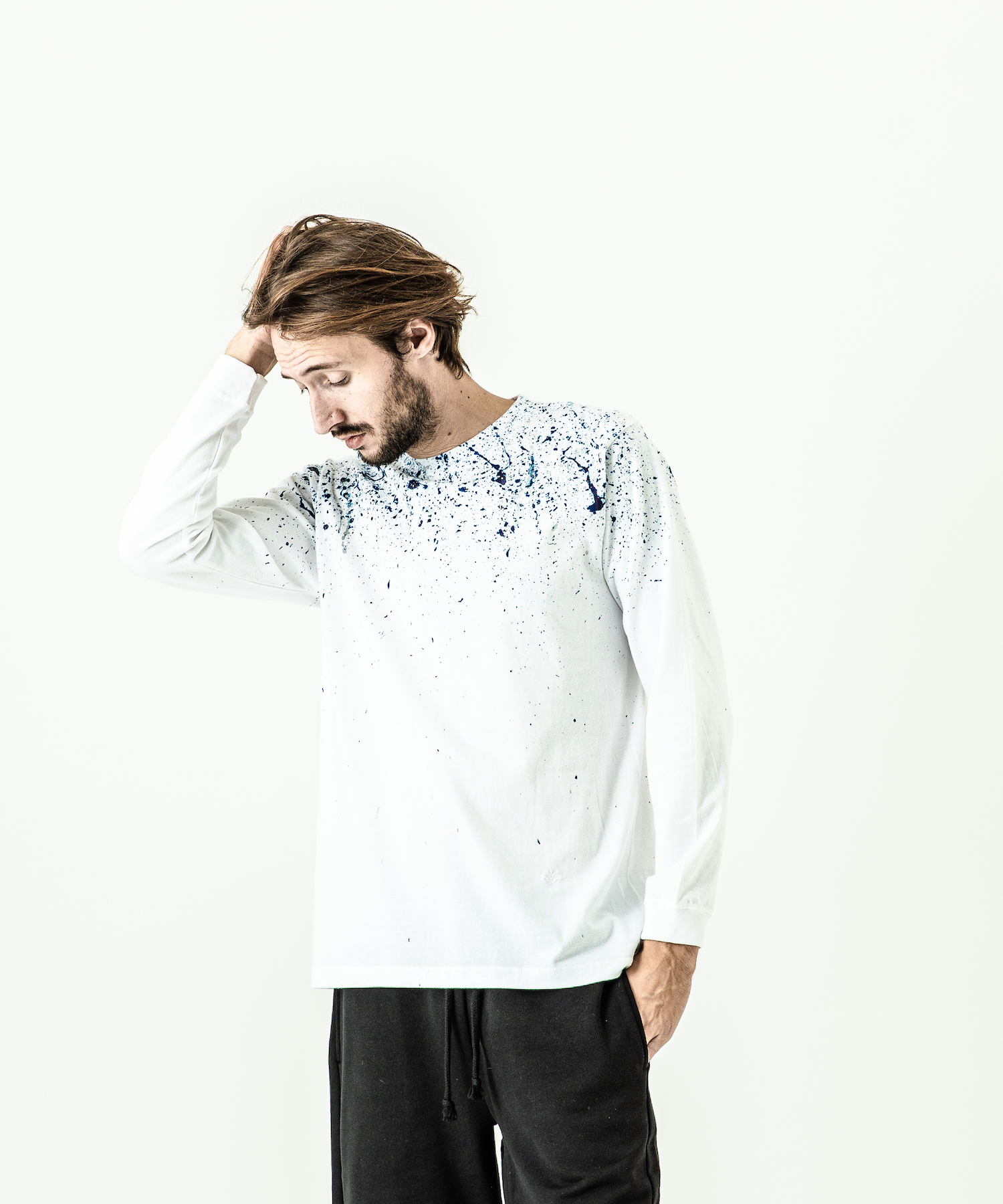 | spec | 首フライスは2本針縫製、丸胴に編み立てた身頃を使用したベーシックなシルエットのL/S Tシャツ。左脇にはブランド名であるACANTHUS(地中海地方産ハアザミ 属植物)の形をモチーフにしたアイコンを生地同色にて刺繍。首元から降り注ぐようなスプラッシュペイントを手作業にて施している為、1点1点表情の異なる特別な1枚となる。 |