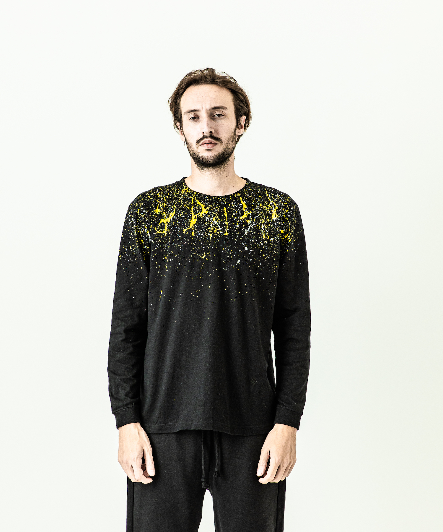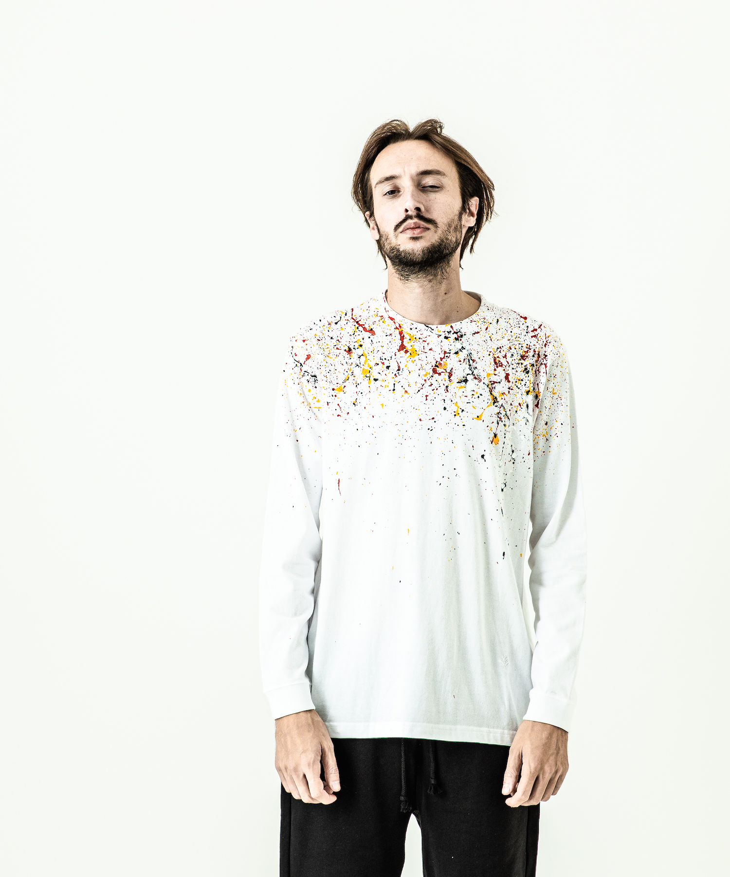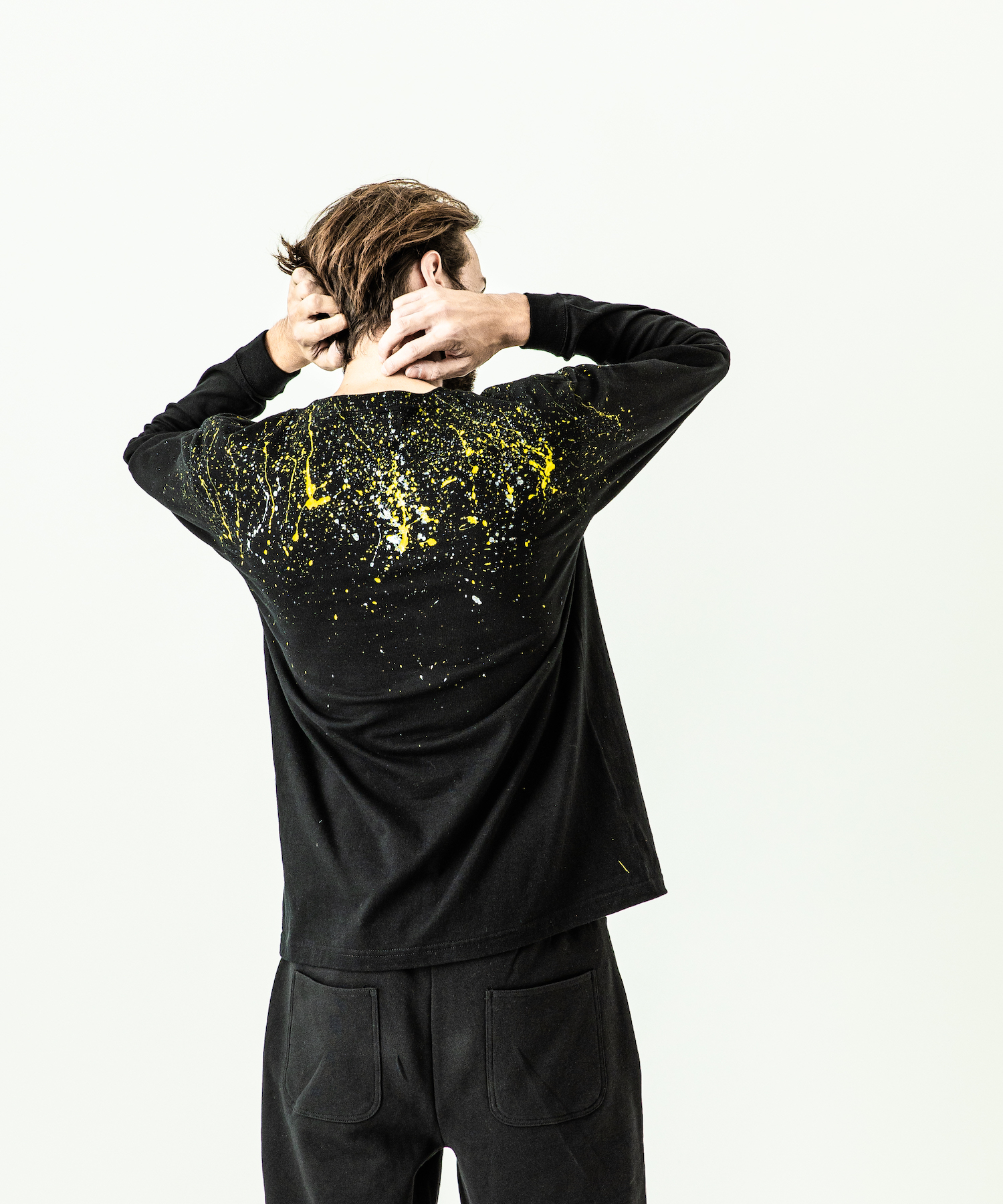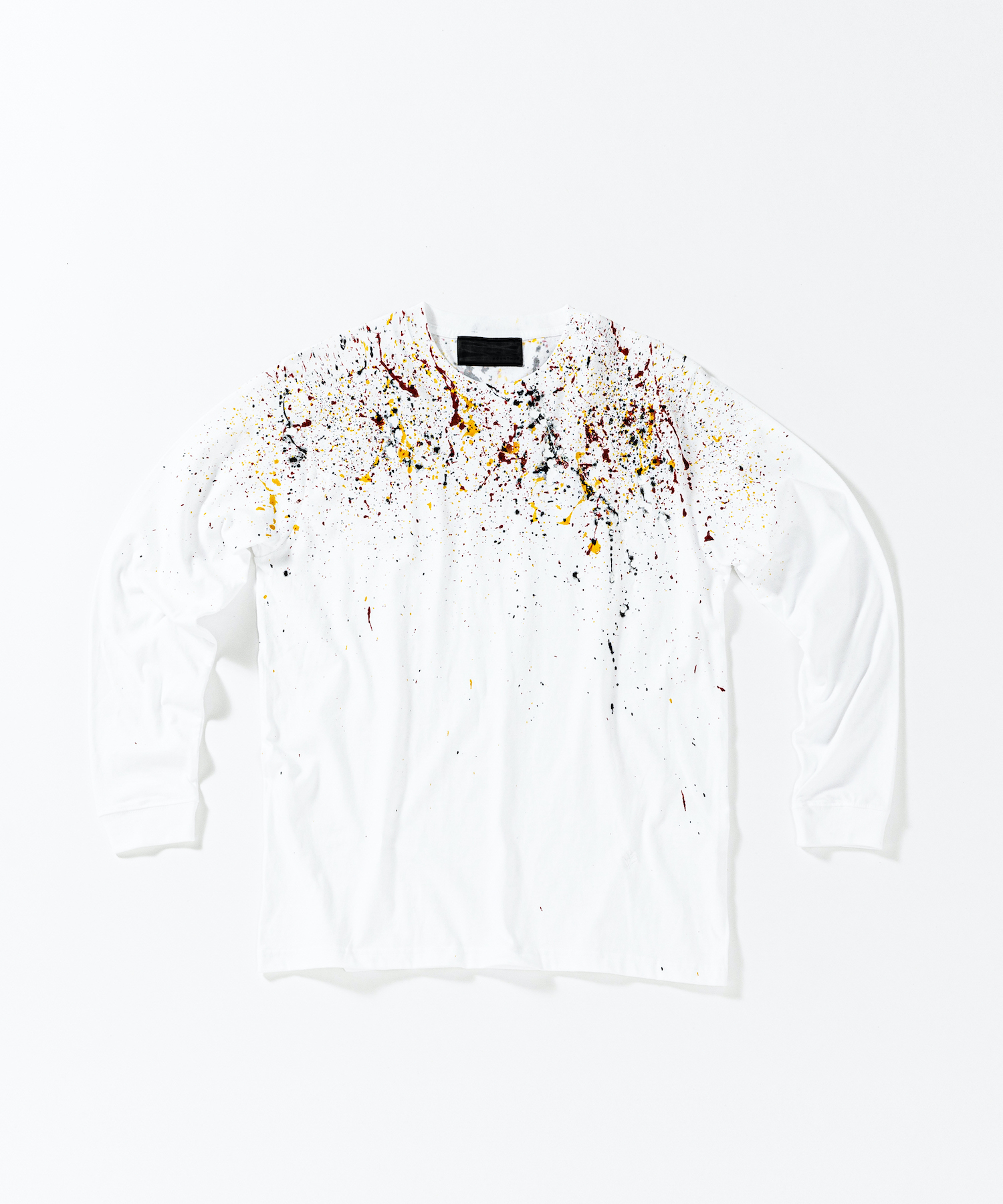 | spec | 首フライスは2本針縫製、丸胴に編み立てた身頃を使用したベーシックなシルエットのL/S Tシャツ。左脇にはブランド名であるACANTHUS(地中海地方産ハアザミ 属植物)の形をモチーフにしたアイコンを生地同色にて刺繍。首元から降り注ぐようなスプラッシュペイントを手作業にて施している為、1点1点表情の異なる特別な1枚となる。 |
