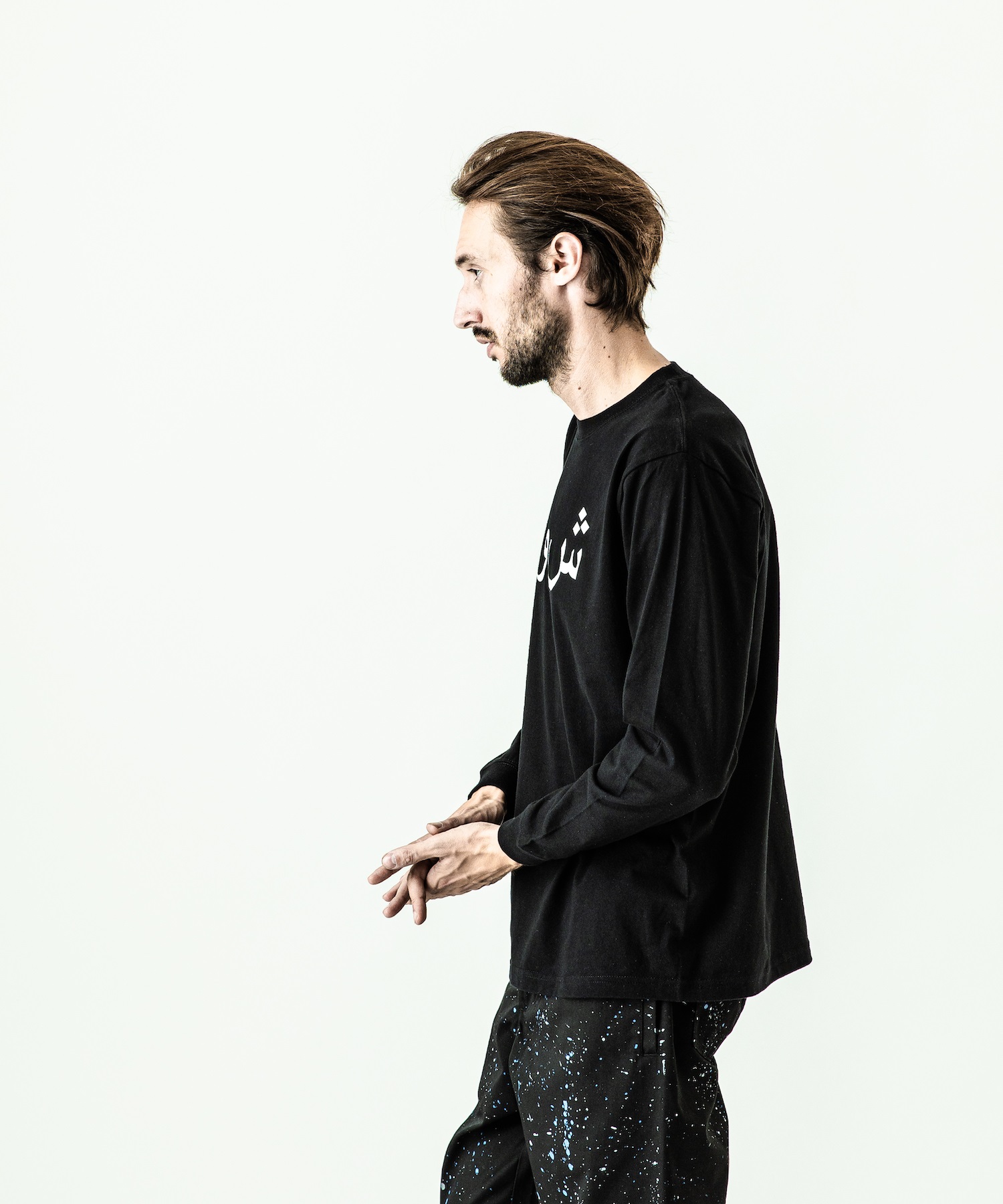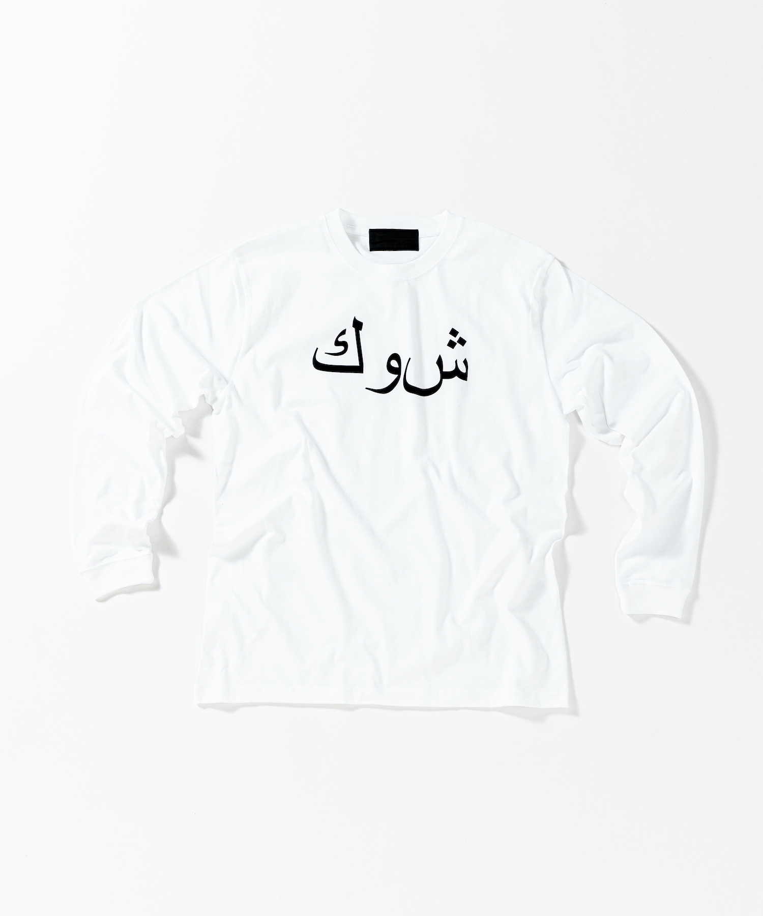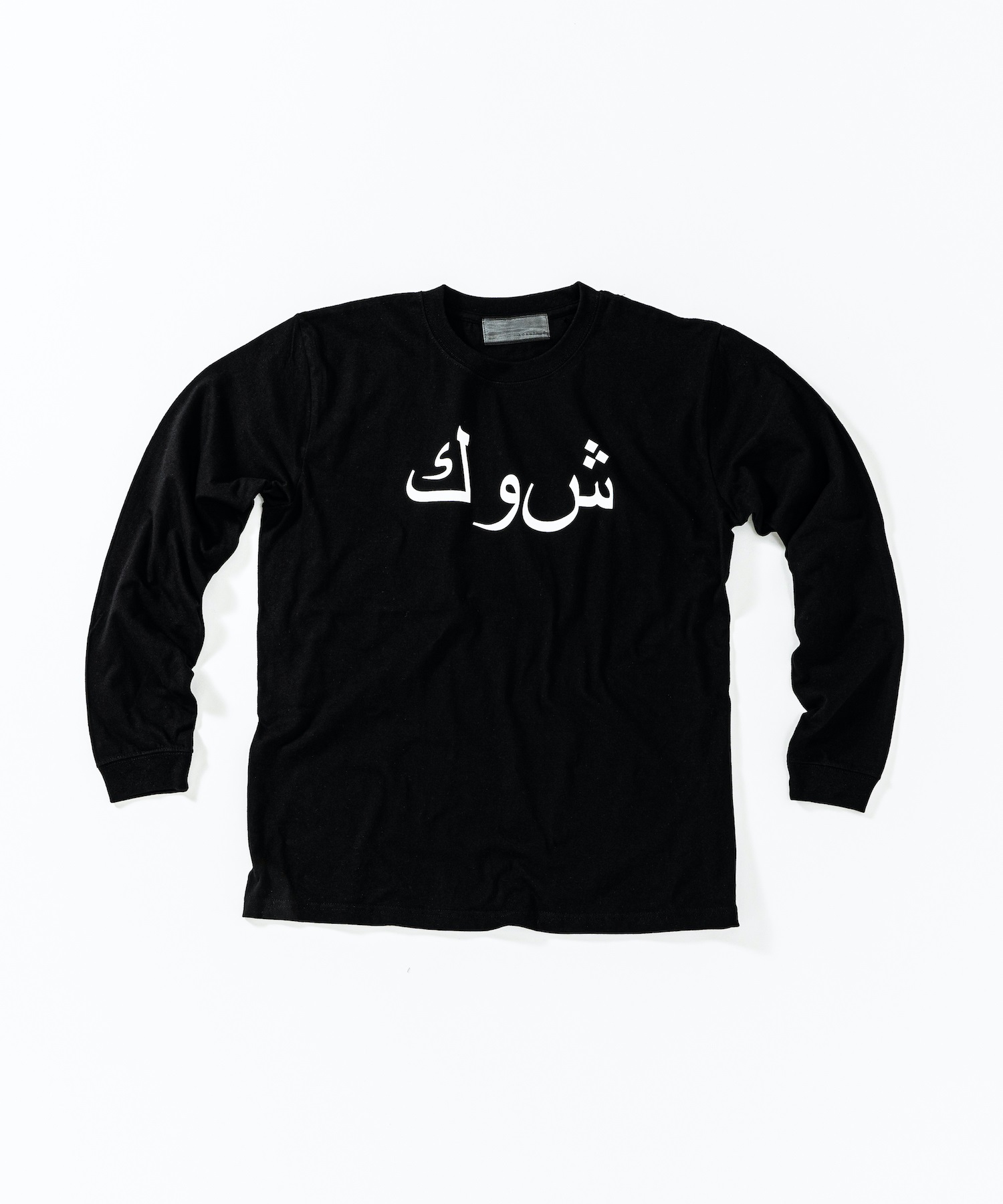 首フライスは2本針縫製、丸胴に編み立てた身頃を使用したベーシックなシルエットのL/S Tシャツ。フロントにはアラビア語でACANTHUS、ハザミ種の意味を持つロゴをプリント。