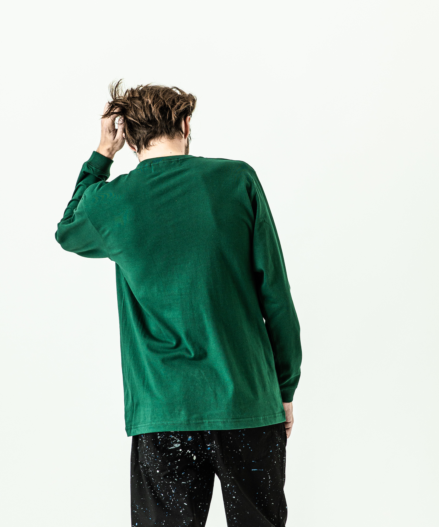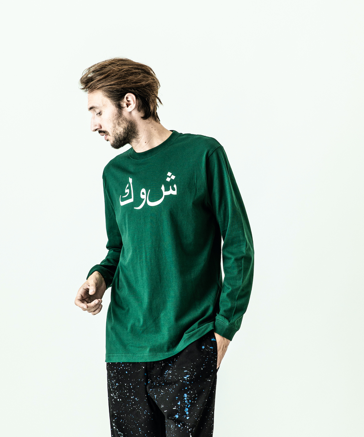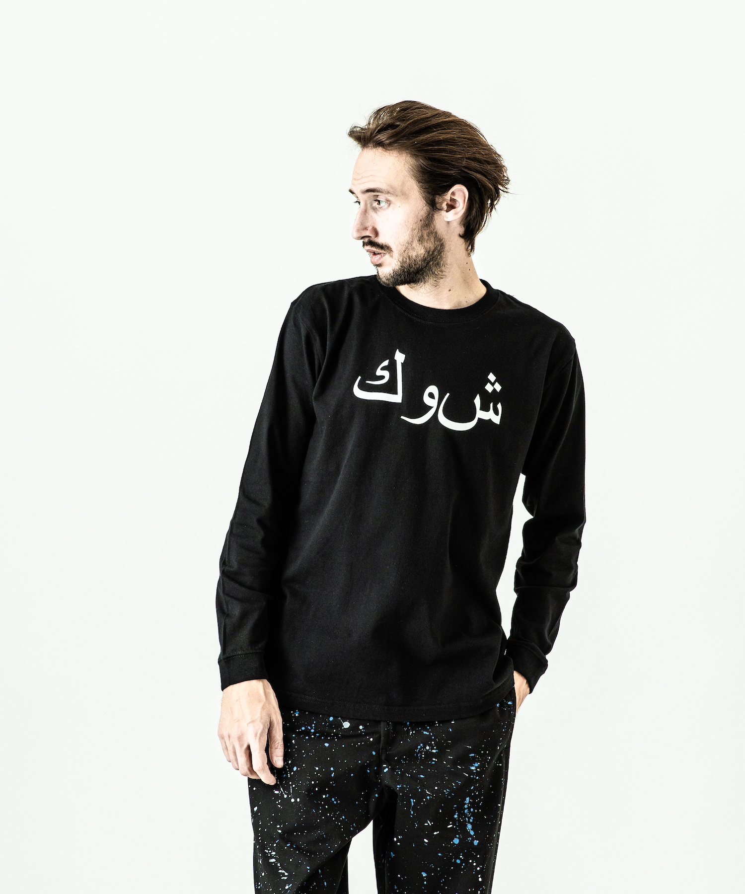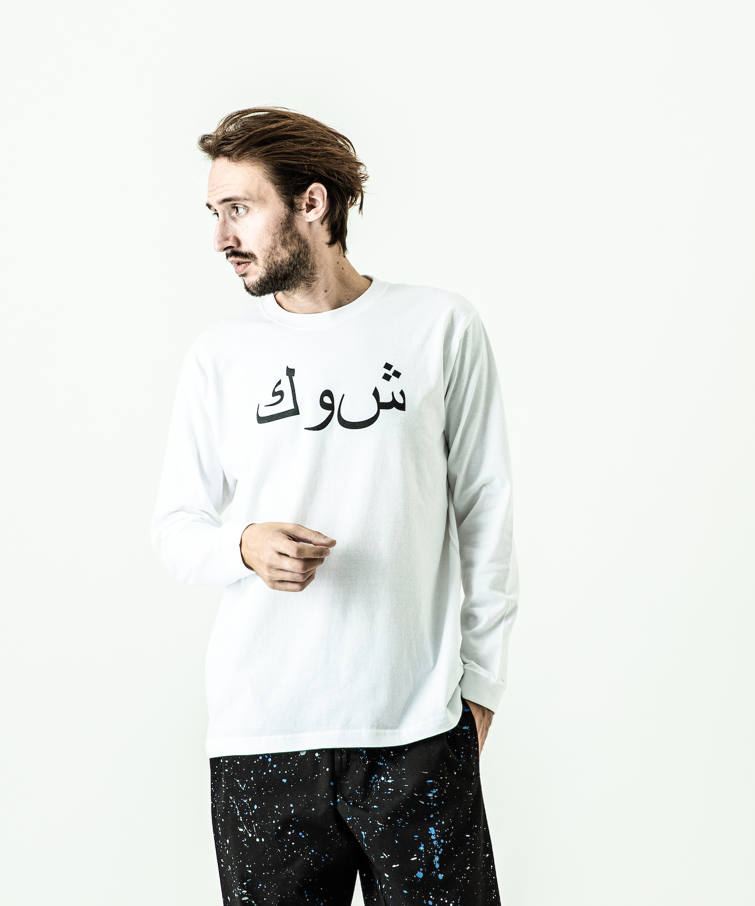 首フライスは2本針縫製、丸胴に編み立てた身頃を使用したベーシックなシルエットのL/S Tシャツ。フロントにはアラビア語でACANTHUS、ハザミ種の意味を持つロゴをプリント。