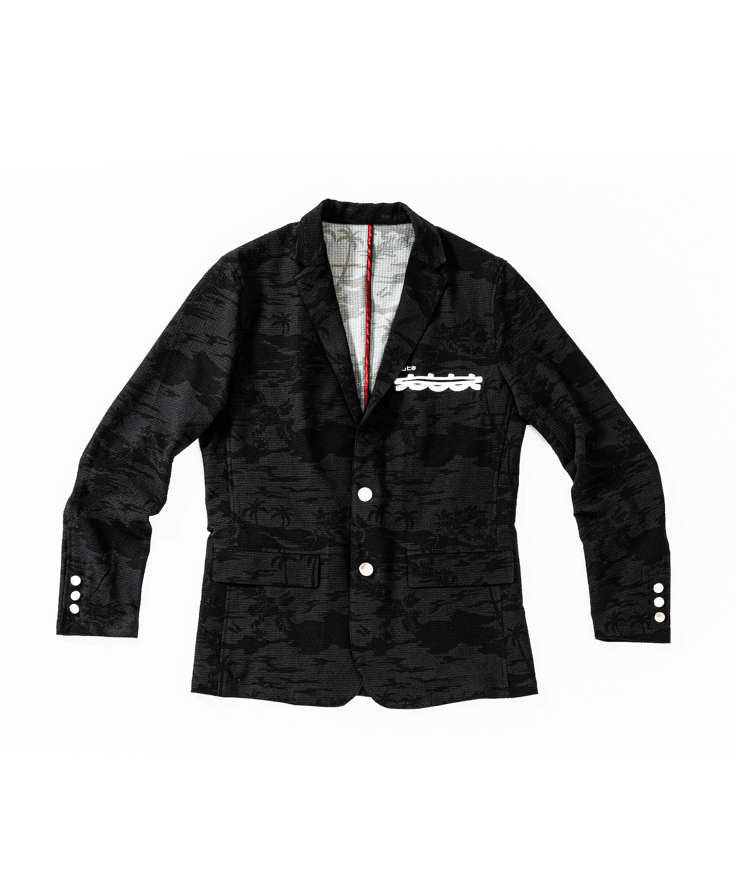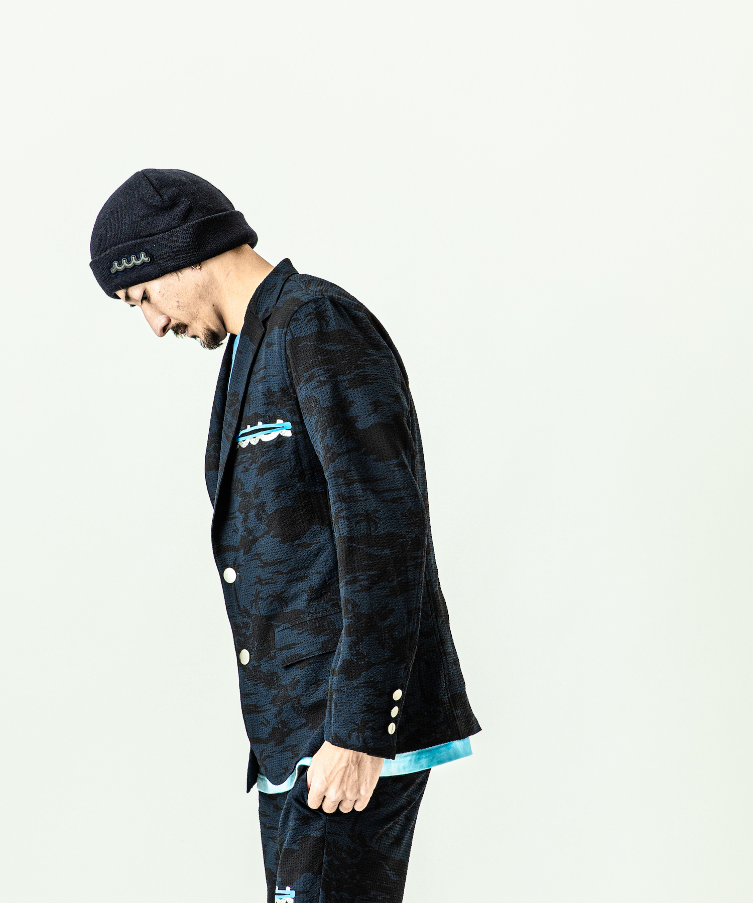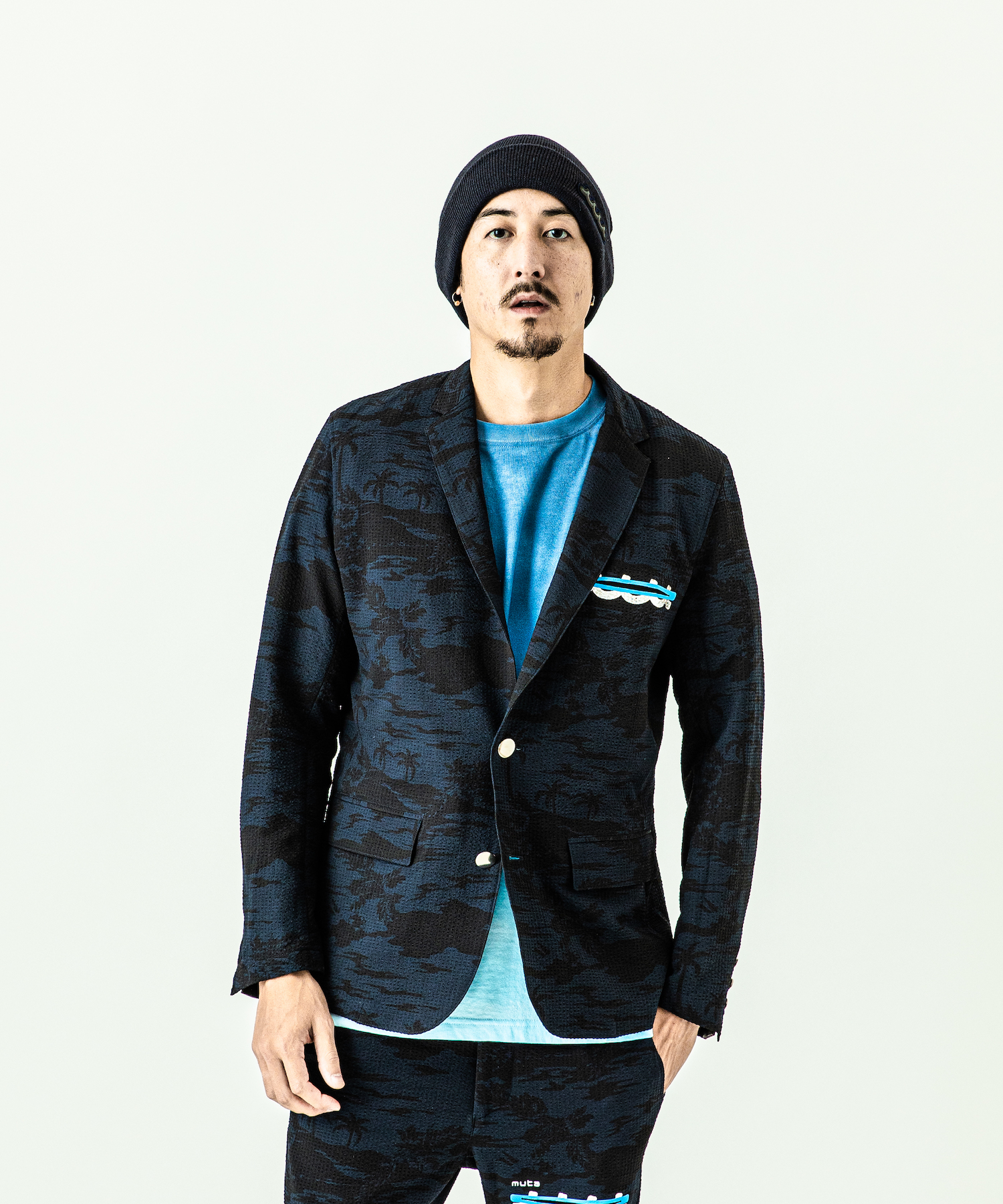 | spec | mutaとのコラボレーションコレクション。 一枚仕立てで軽量なテーラードJKT。フロントは2B釦、袖は本明き仕様。裏側の縫い代始末にはサテン地のパイピングテープを配置し色味のアクセントを追加。上衿裏、袖口明きの内側にはラムレザーを配置。ストレッチ性を生かした、綺麗なタイトシルエット。胸にはシルバー箔プリントに加えて、特殊な圧着加工にて取り付けたオリジナルのwaveロゴトリミングポケットを配置している。 |