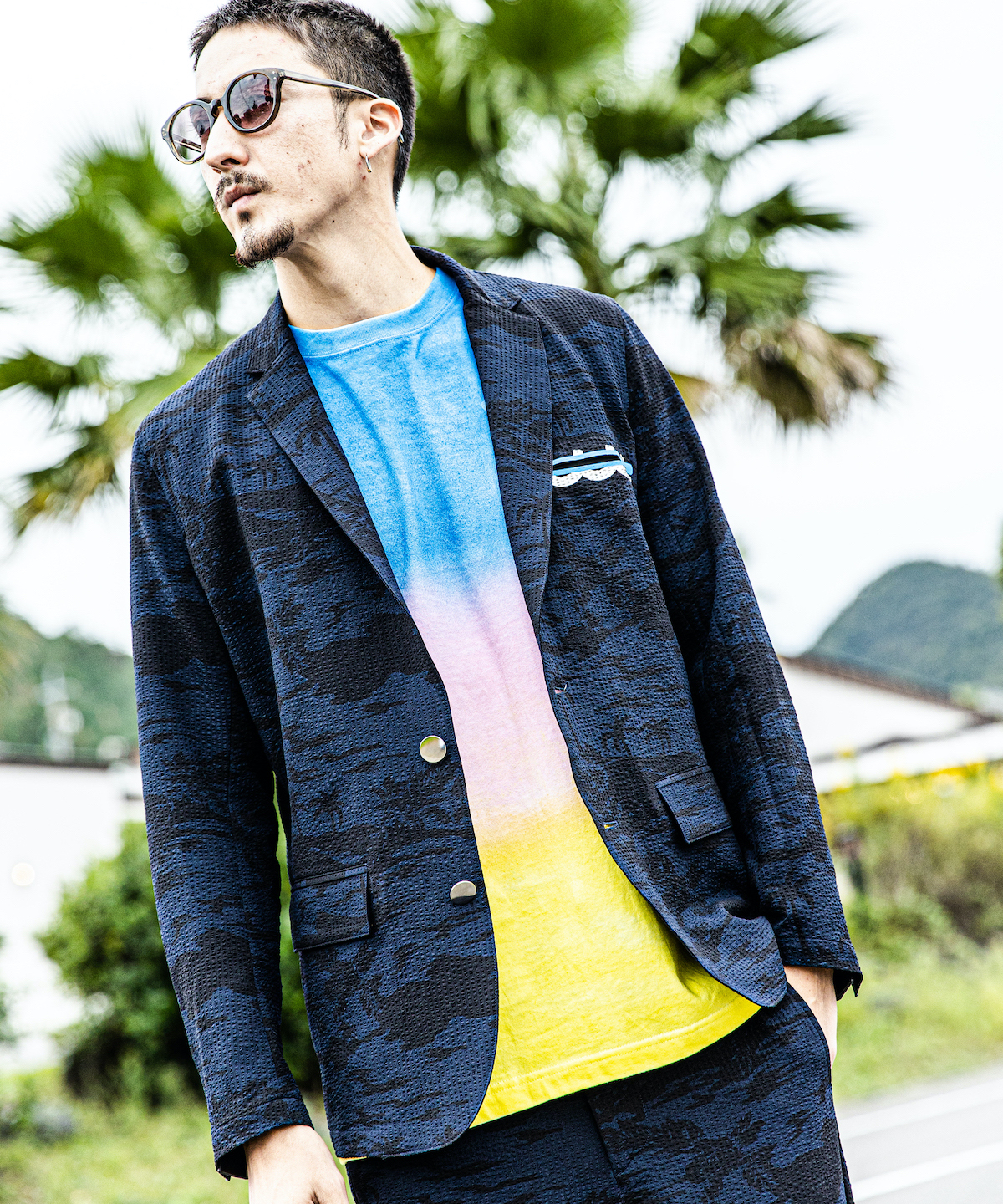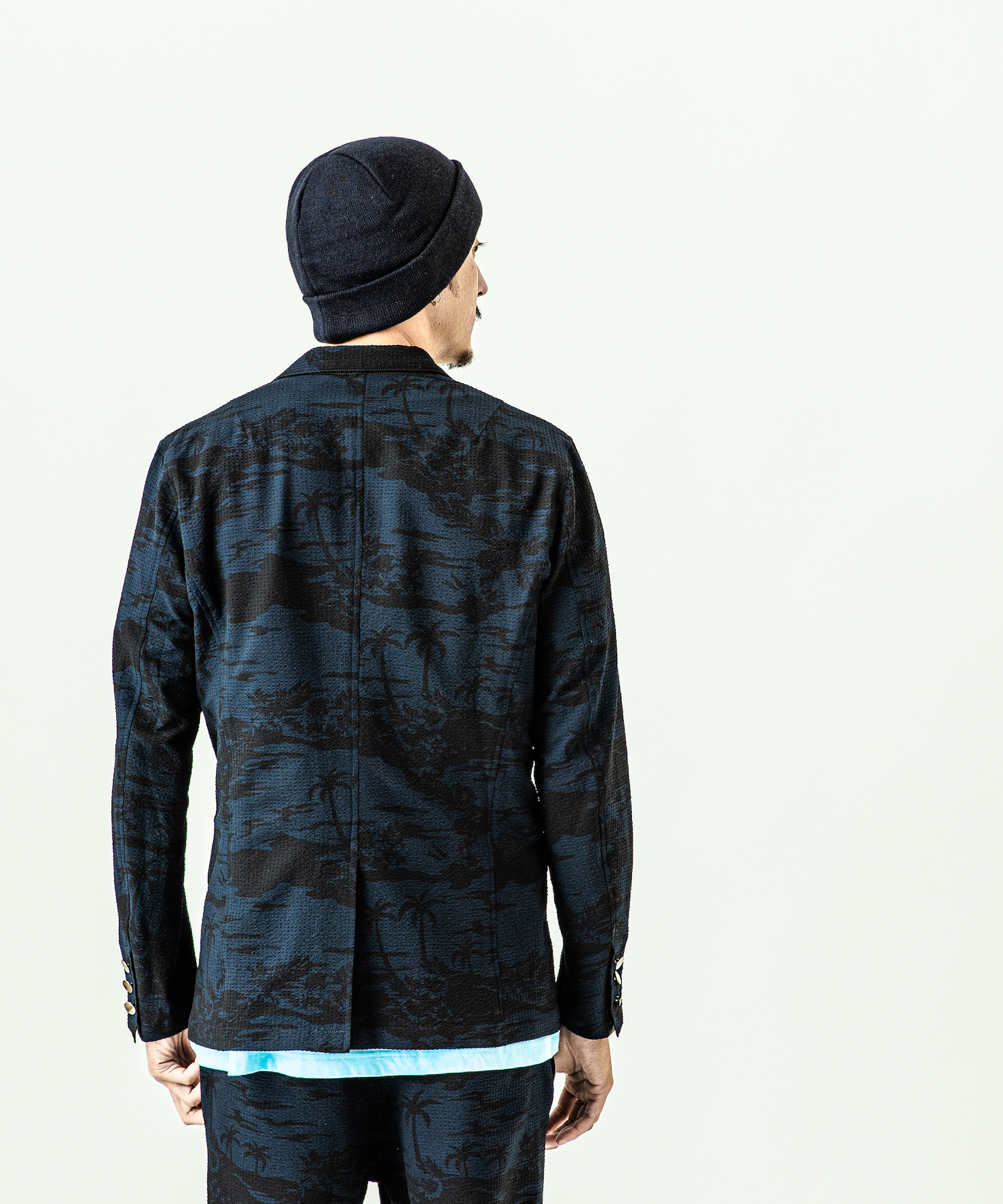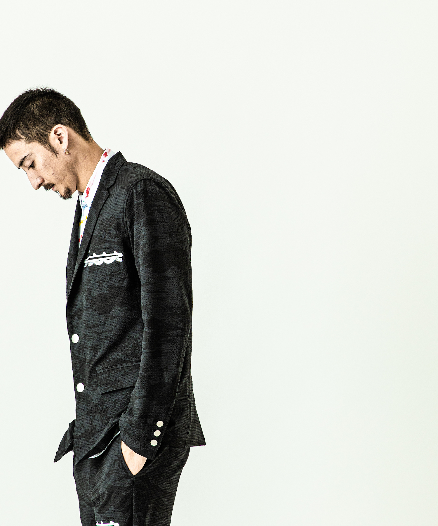 | spec | mutaとのコラボレーションコレクション。 一枚仕立てで軽量なテーラードJKT。フロントは2B釦、袖は本明き仕様。裏側の縫い代始末にはサテン地のパイピングテープを配置し色味のアクセントを追加。上衿裏、袖口明きの内側にはラムレザーを配置。ストレッチ性を生かした、綺麗なタイトシルエット。胸にはシルバー箔プリントに加えて、特殊な圧着加工にて取り付けたオリジナルのwaveロゴトリミングポケットを配置している。 |