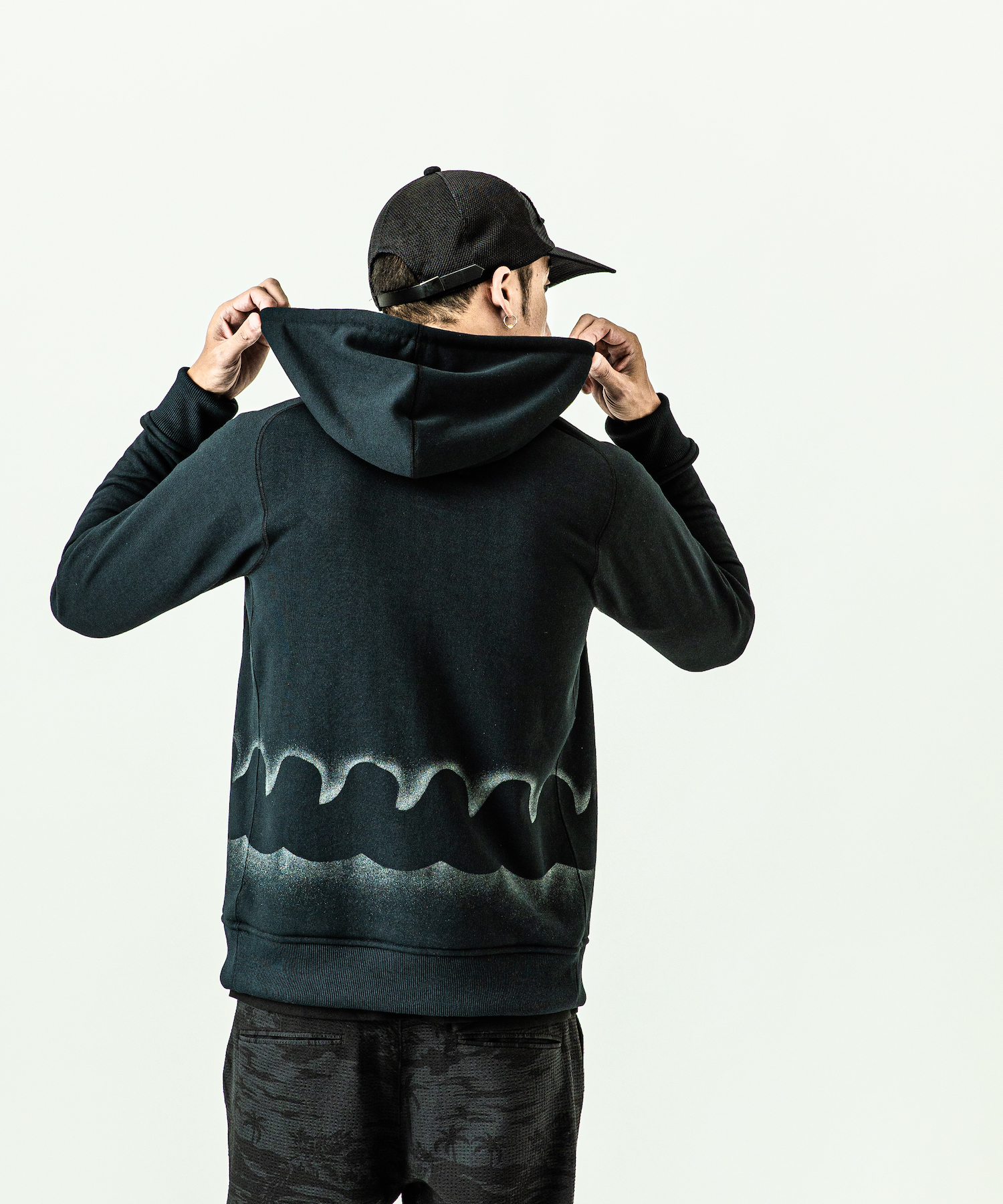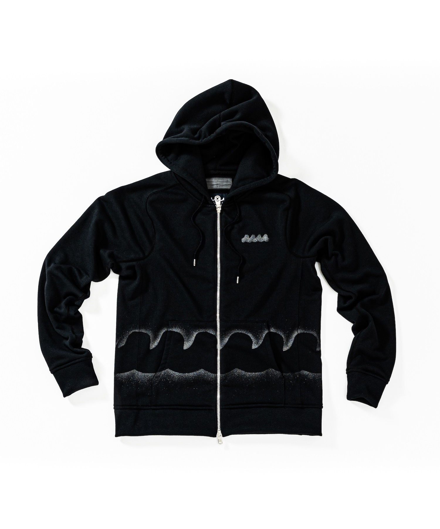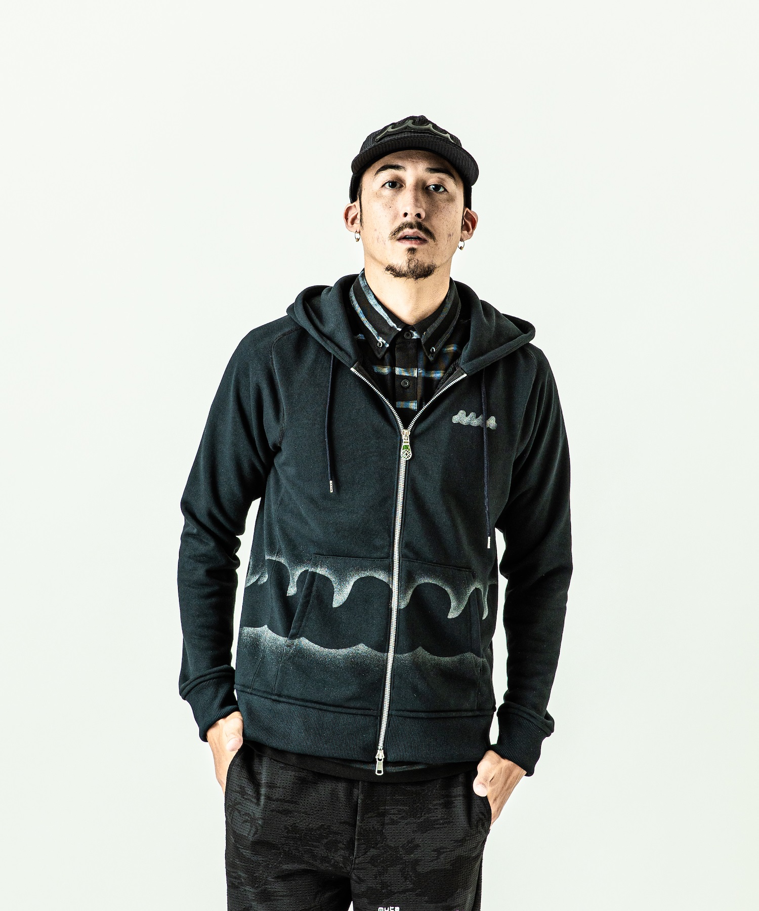| spec | mutaとのコラボレーションコレクション。 フリーダムスリーブ仕様のフルジップフーディー。最大の特徴はアームスリーブ脇のマチ付き仕様の袖付け。軍隊の運動時に、腕を上げた際に裾が上がり、肌が見えないように開発されたと言われている通称フリーダムスリーブ。脇にマチを配置する事で肩、腕が動き易い仕様となっている。40年代~50年代のスウェットアイテムに見られるディティールだが、縫製コストのかかる仕様で徐々に姿を消していったと言われている。現在も技術の高い縫製者が必要な仕様。フロントZIPにはmutaオリジナル引き手のファスナーを使用。1点1点ステンシルによるmutawaveロゴを左胸、ウエスト周りに大胆にプリント。 |