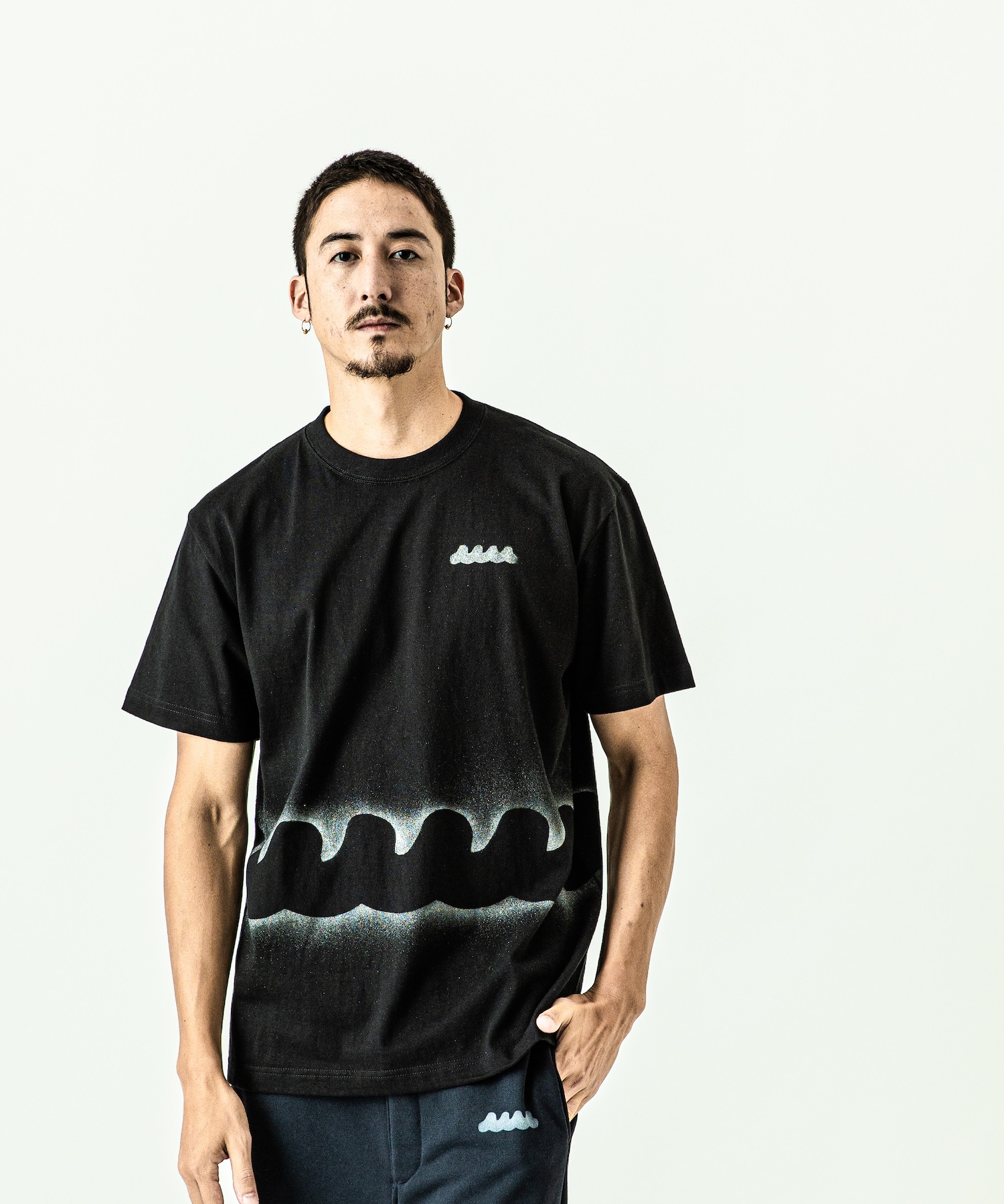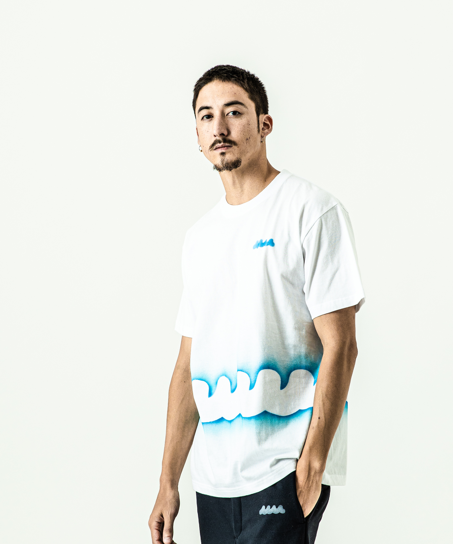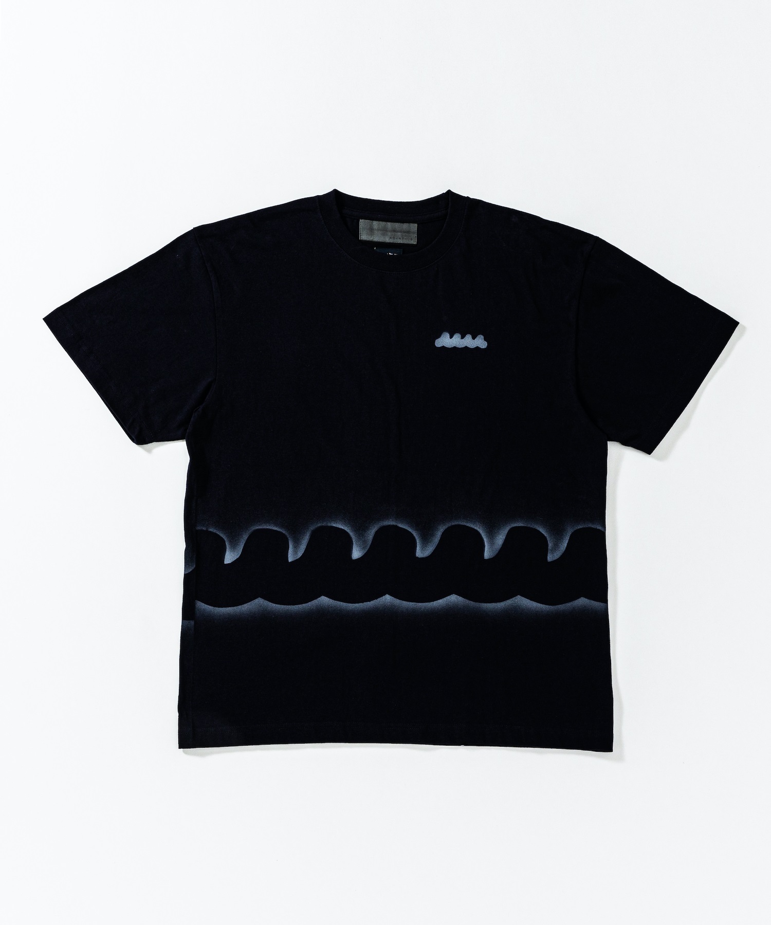 | spec | mutaとのコラボレーションコレクション。 首フライスは2本針縫製、丸胴に編み立てた身頃を使用したベーシックなシルエットのTシャツ。1点1点ステンシルによるmutawaveロゴを左胸、ウエスト周りに大胆にプリント。 |