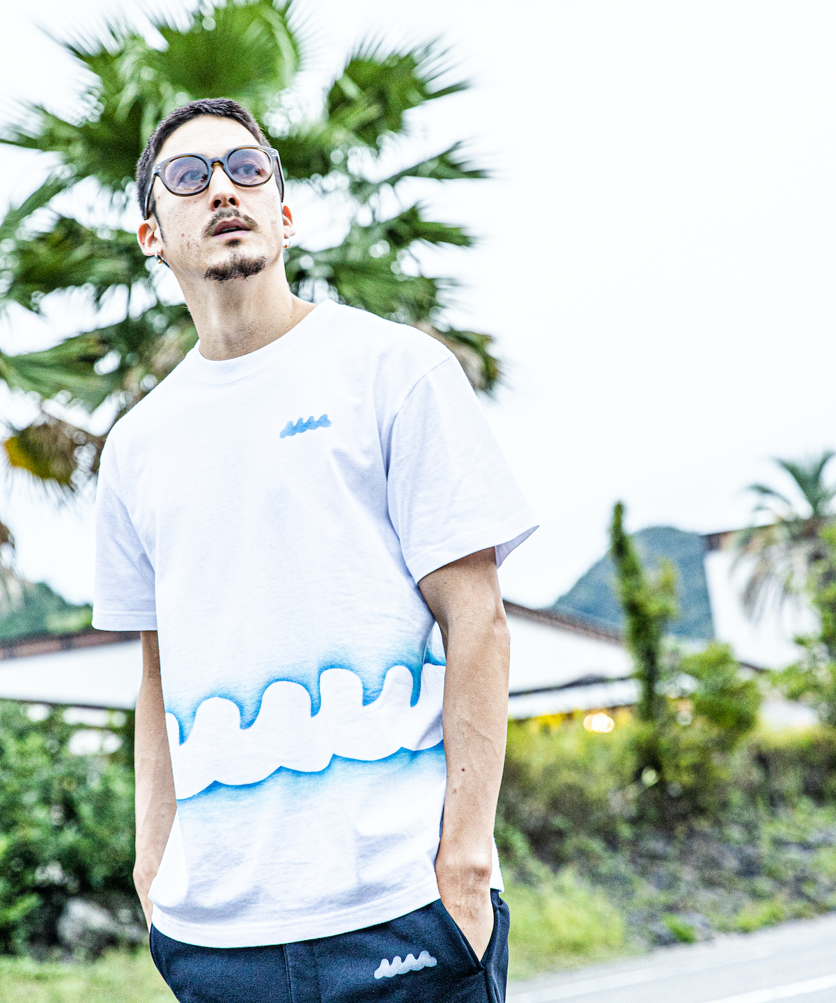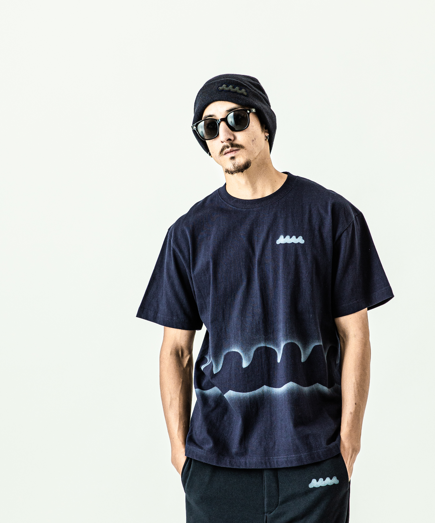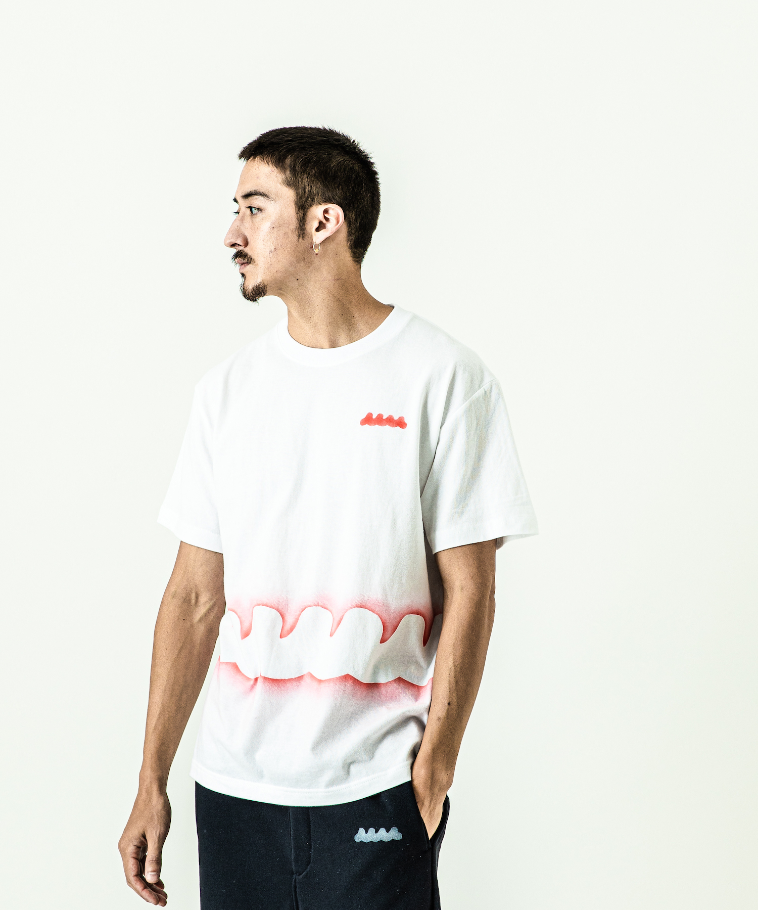 | spec | mutaとのコラボレーションコレクション。 首フライスは2本針縫製、丸胴に編み立てた身頃を使用したベーシックなシルエットのTシャツ。1点1点ステンシルによるmutawaveロゴを左胸、ウエスト周りに大胆にプリント。 |