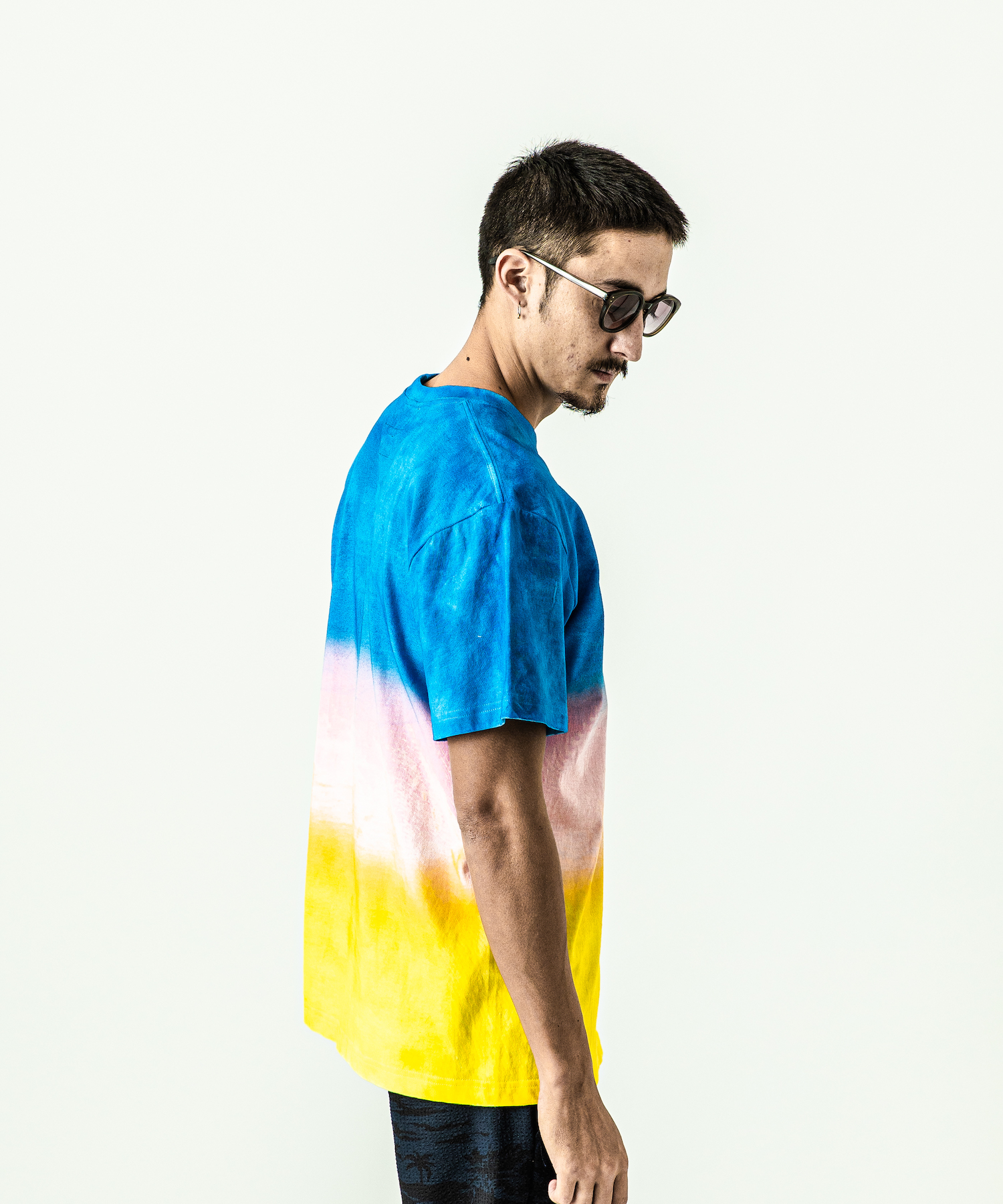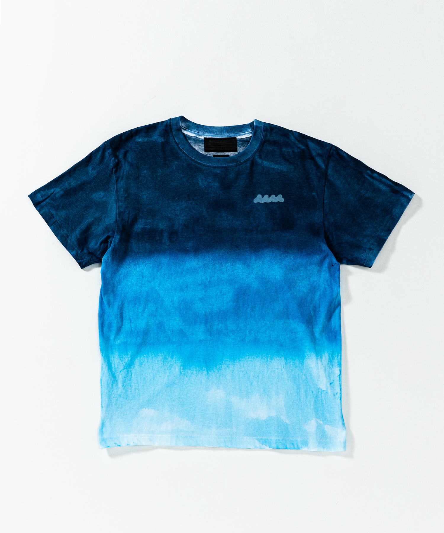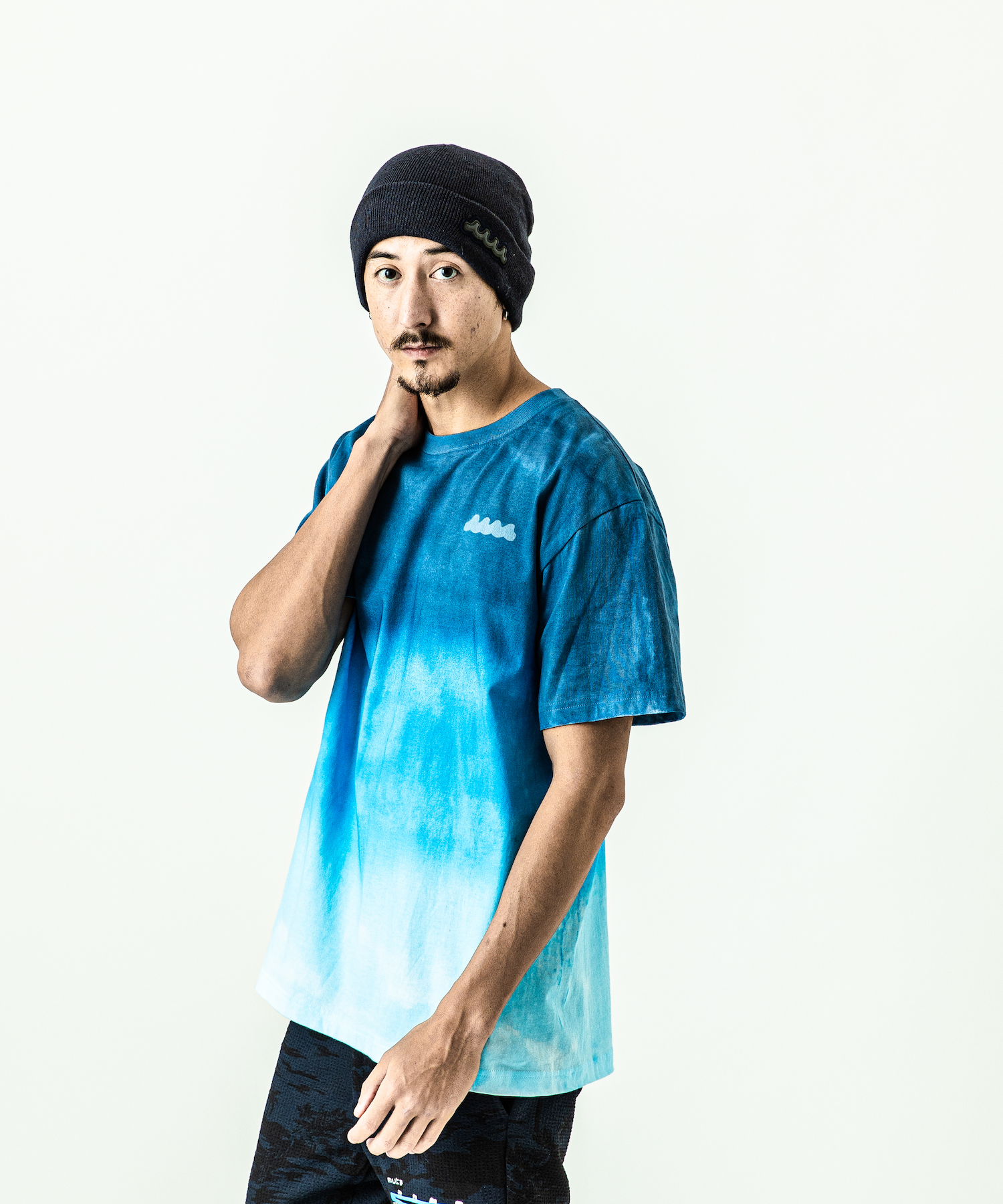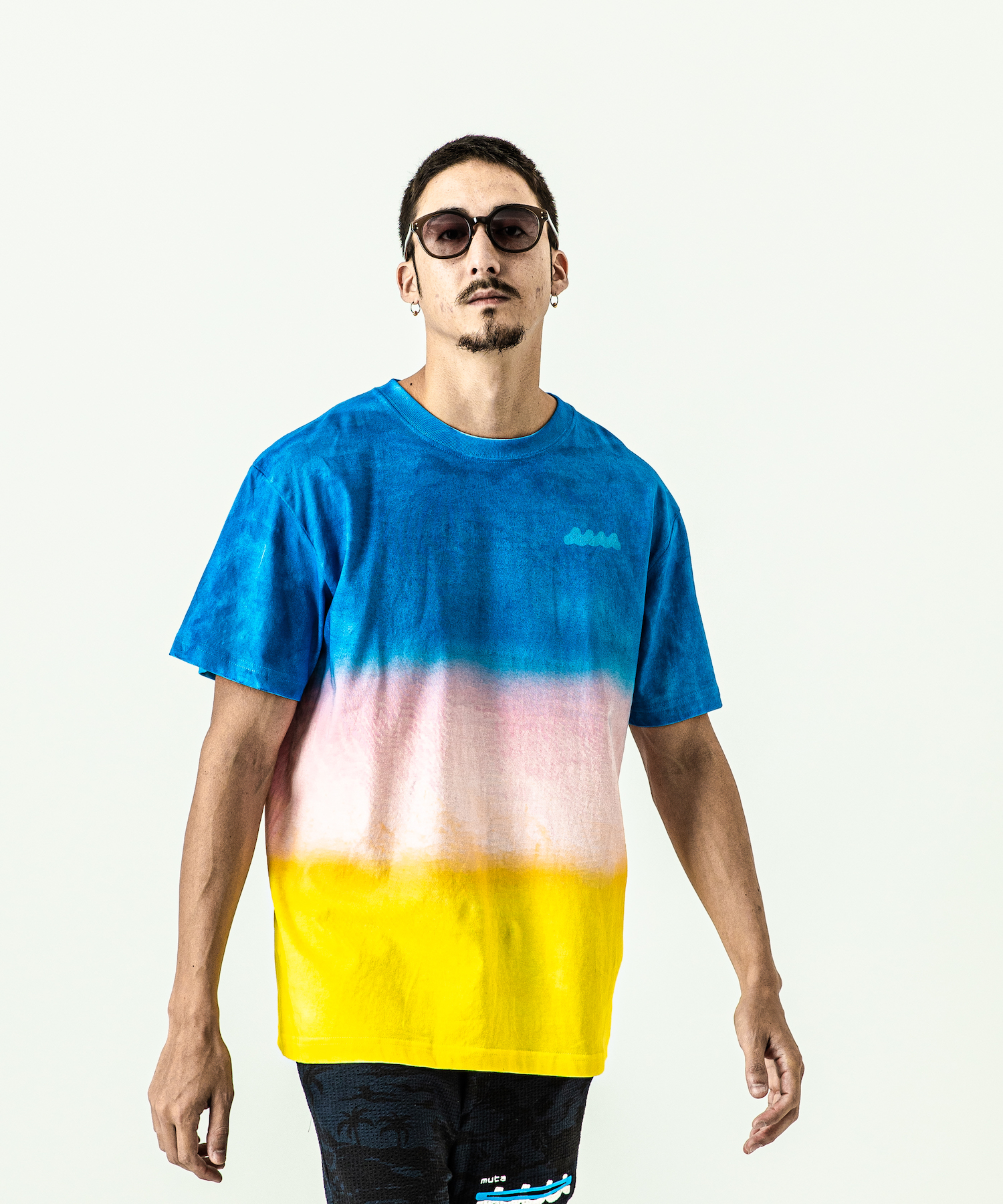 | spec | mutaとのコラボレーションコレクション。 首フライスは2本針縫製、丸胴に編み立てた身頃を使用したベーシックなシルエットのTシャツ。手作業による顔料ボーダー染めを施している為、1点1点表情の異なる特別な1枚となる。胸にはmutawaveロゴをステンシルプリント。 |
