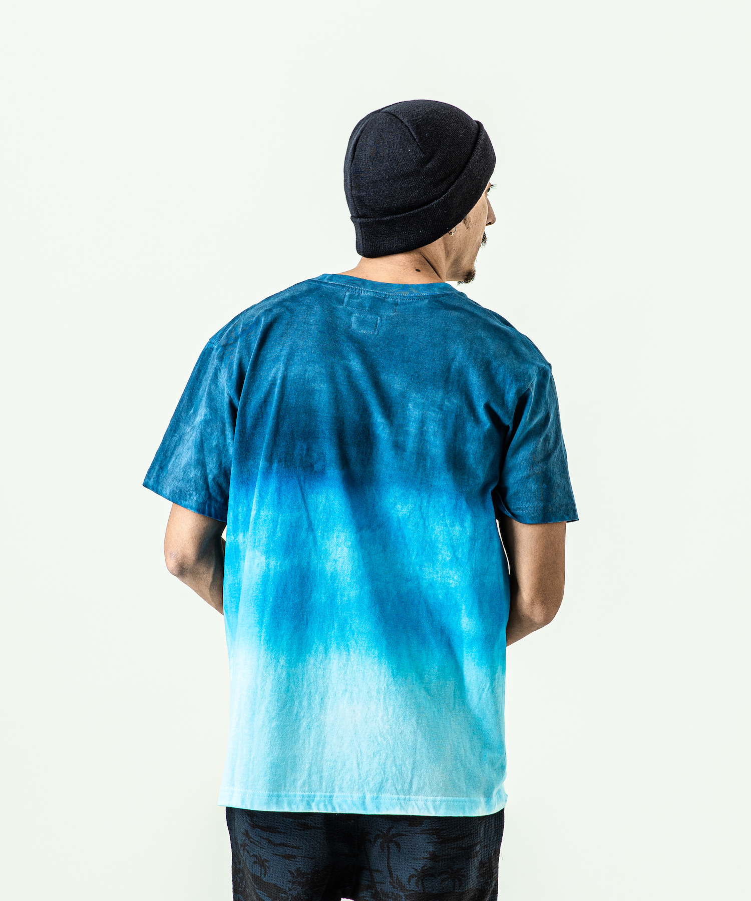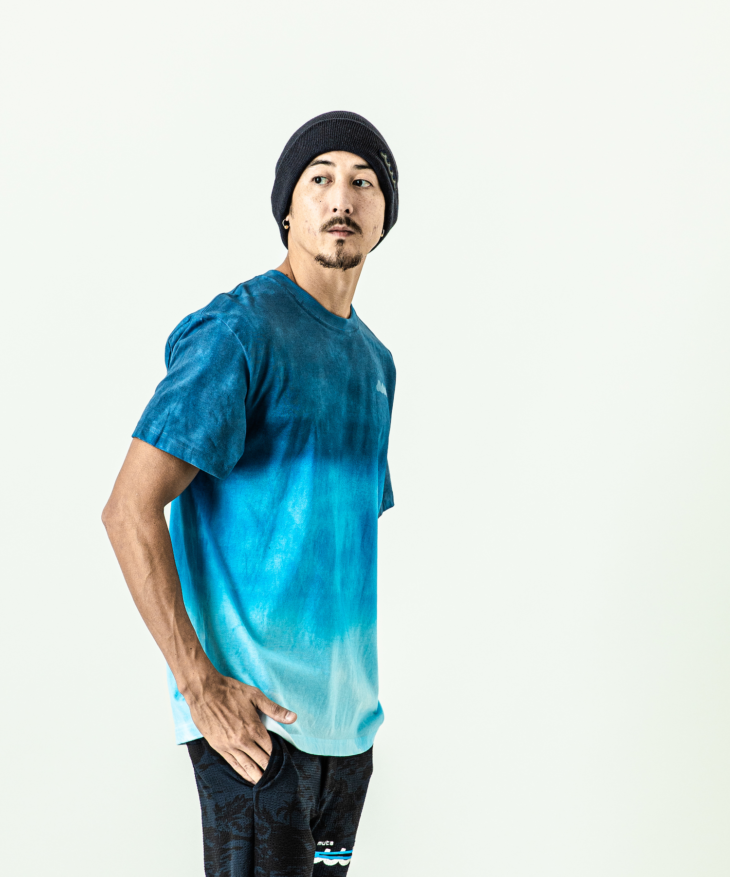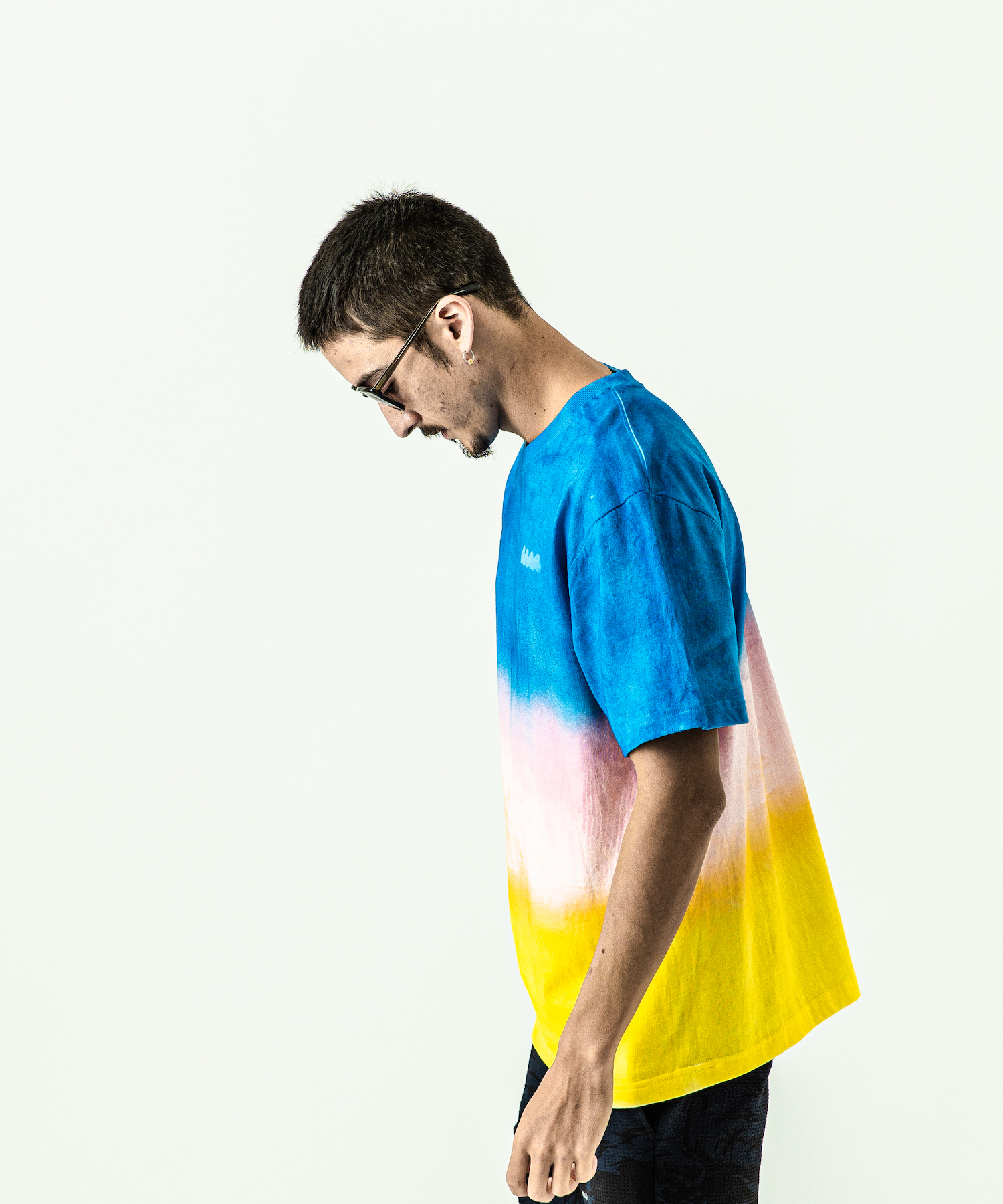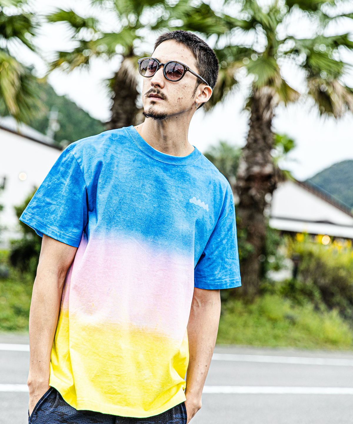 | spec | mutaとのコラボレーションコレクション。 首フライスは2本針縫製、丸胴に編み立てた身頃を使用したベーシックなシルエットのTシャツ。手作業による顔料ボーダー染めを施している為、1点1点表情の異なる特別な1枚となる。胸にはmutawaveロゴをステンシルプリント。 |